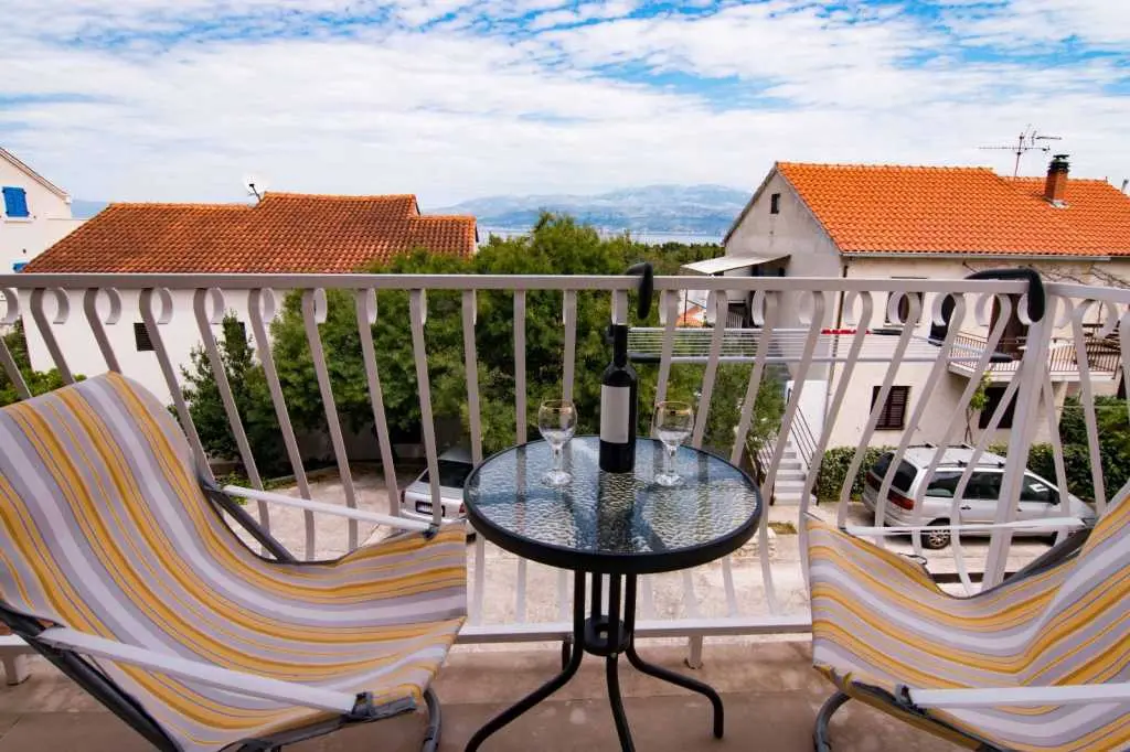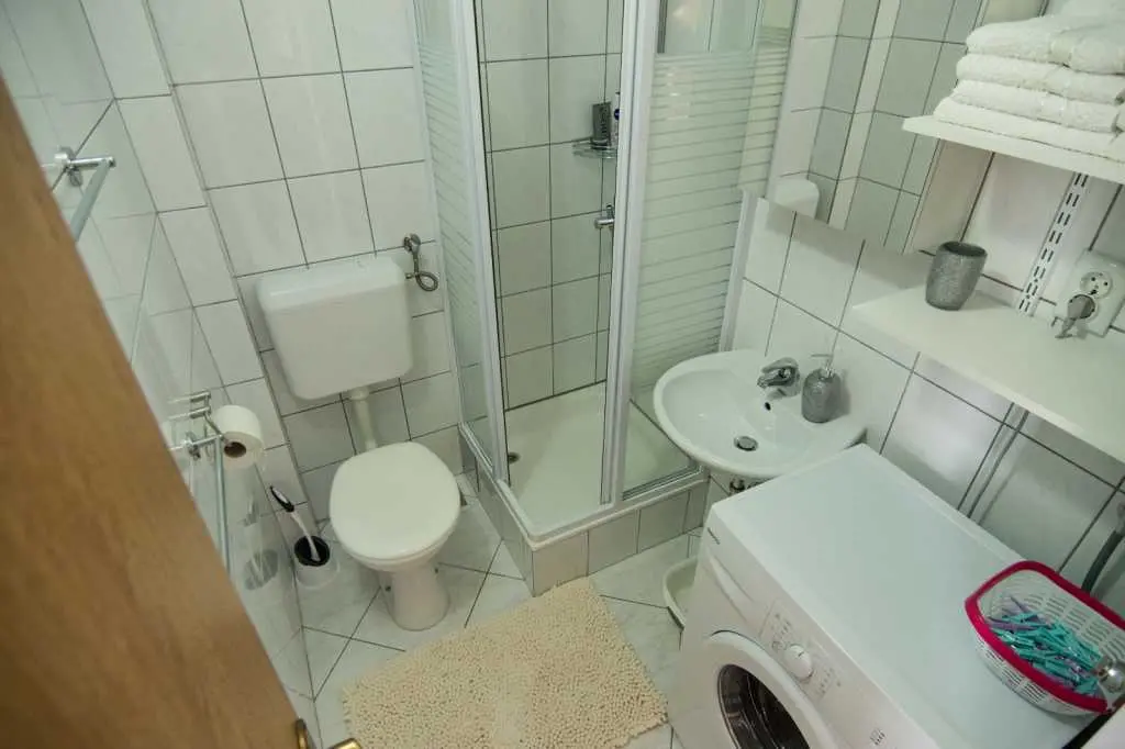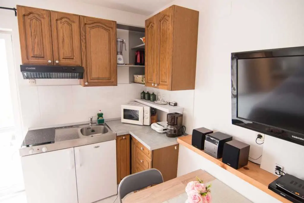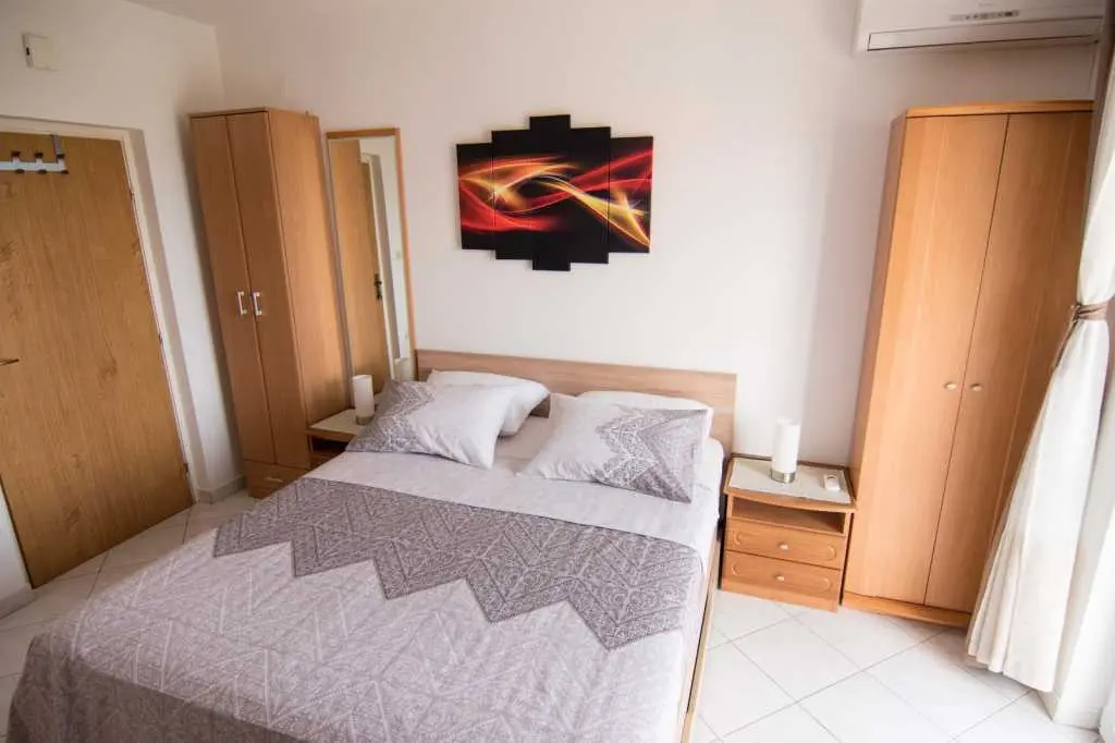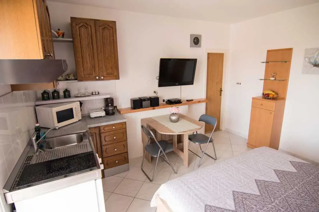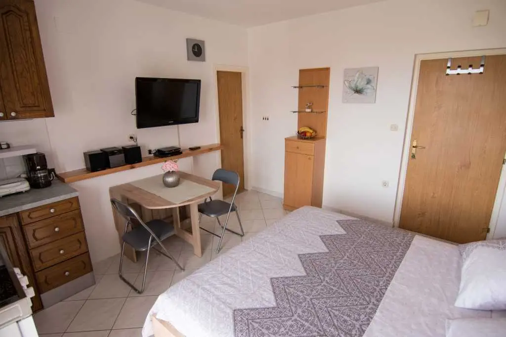 Studio apartman je na prvom katu manje stambene zgrade koja se nalazi u mirnom predjelu, manje od 300 m od predivnih šljunčanih i pješčanih plaža. Apartman je klimatiziran, ima veliki bračni krevet, kuhinju, kupaonicu i veliki balkon s pogledom na more. Opremljen je LCD tv, DVD player, mini glazbenom linijom. Ima osigurano parking mjesto. Centar grada, riva, luka i autobusna postaja, udaljeni su 15 minuta hoda predivnom šetnicom. Do najbliže trgovine prehrambenih proizvoda je 500 metara. Apartman je opremljen svime sto je potrebno za ugodan boravak.