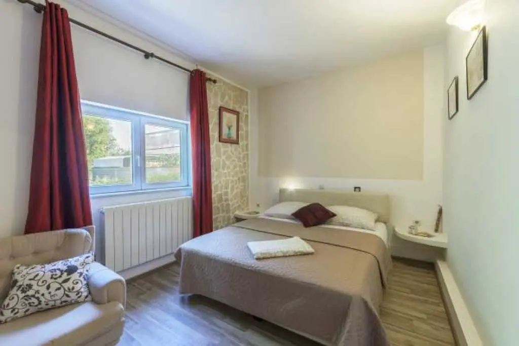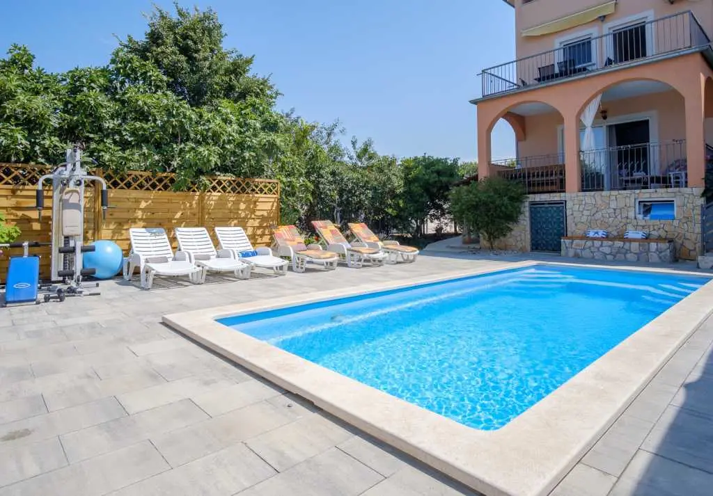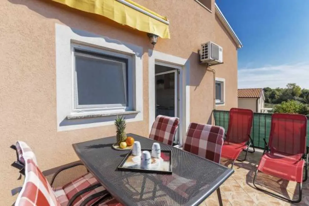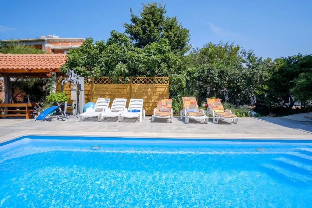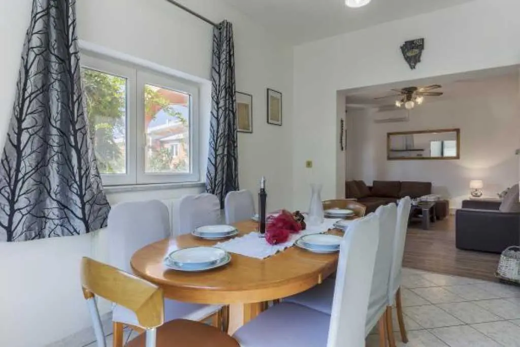 Kuća sa bazenom i okućnicom. Kuća ima tri apartmana, od kojih svaki apartman ima zaseban ulaz .Apartman 1 nalazi se na prvom katu površine 58 m2. Ima veliku terasu te dvije spavaće sobe, kuhinju sa blagovaonicom te kupatilo sa tuš kabinom. Idealno za smještaj 4 odrasle osobe ili obitelj sa dvoje djece, jer ima dvije odvojene spavaće sobe. Apartman 2 nalazi se na prvom katu ima spavaću sobu te kuhinju sa blagovaonicom i dnevnim boravkom. Ukupne površine 45 m2. Apartman 3 nalazi se u prizemlju te ima 103 m2. Ima 3 spavaće sobe, kuhinju sa blagovaonicom te velikim dnevnim boravkom te dva kupatila. Idealno za smještaj 8 osoba (6+2). Kuća ima veliko dvorište sa bazenom koje je na raspolaganju gostima, vanjski roštilj, te veliki trampolin za djecu. Gostima je na raspolaganju i konoba sa unutarnjim roštiljem. Kuća se nalazi u mirnom dijelu naselja Valbandon koji je idealan za obiteljski odmor . Apartmani imaju pogled na bazen i dvorište. U blizini je lijepo uređenih plaža i nacionalnog parka Brijuni .Svi apartmani imaju osigurano parkirno parkirno mjesto u sklopu objekta.