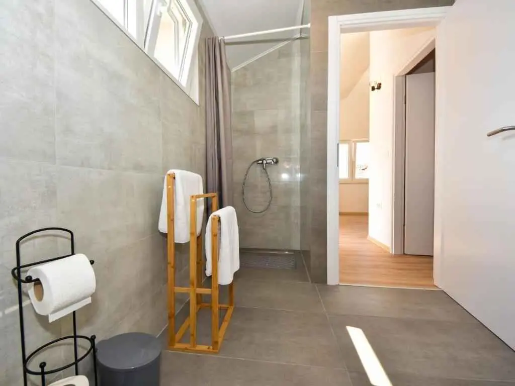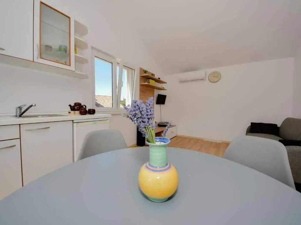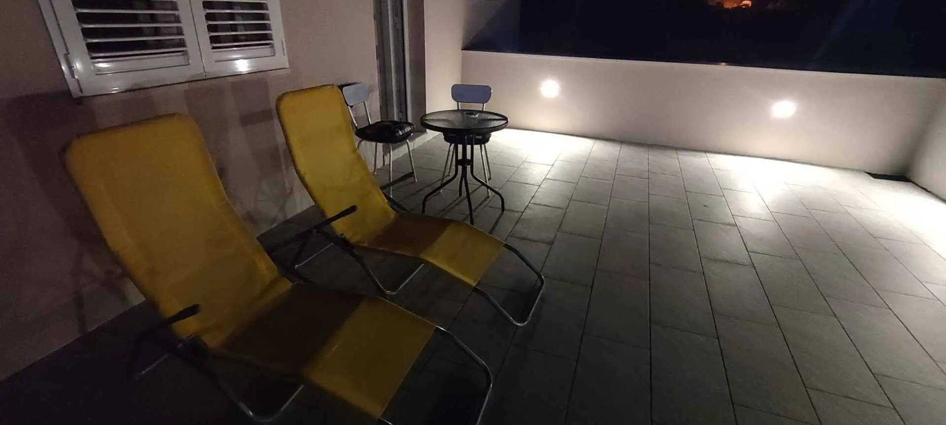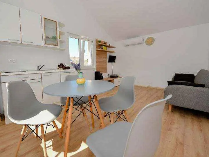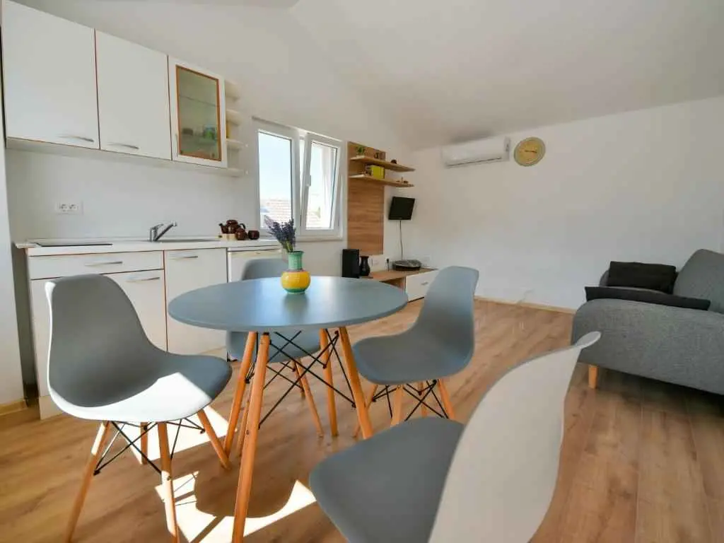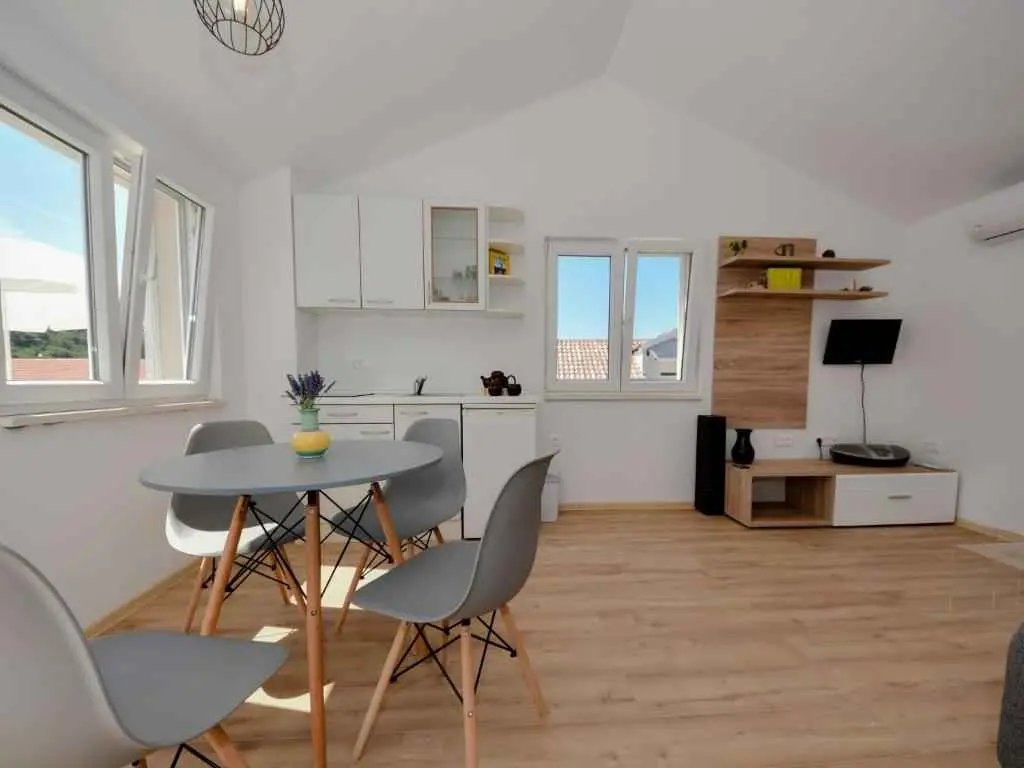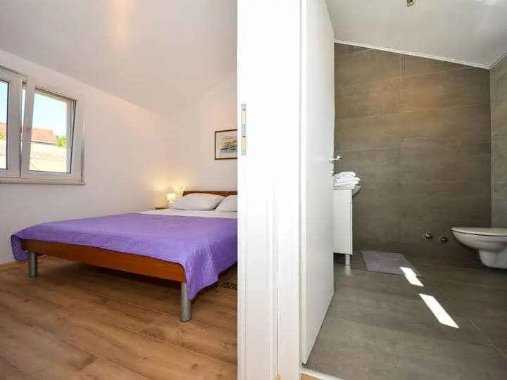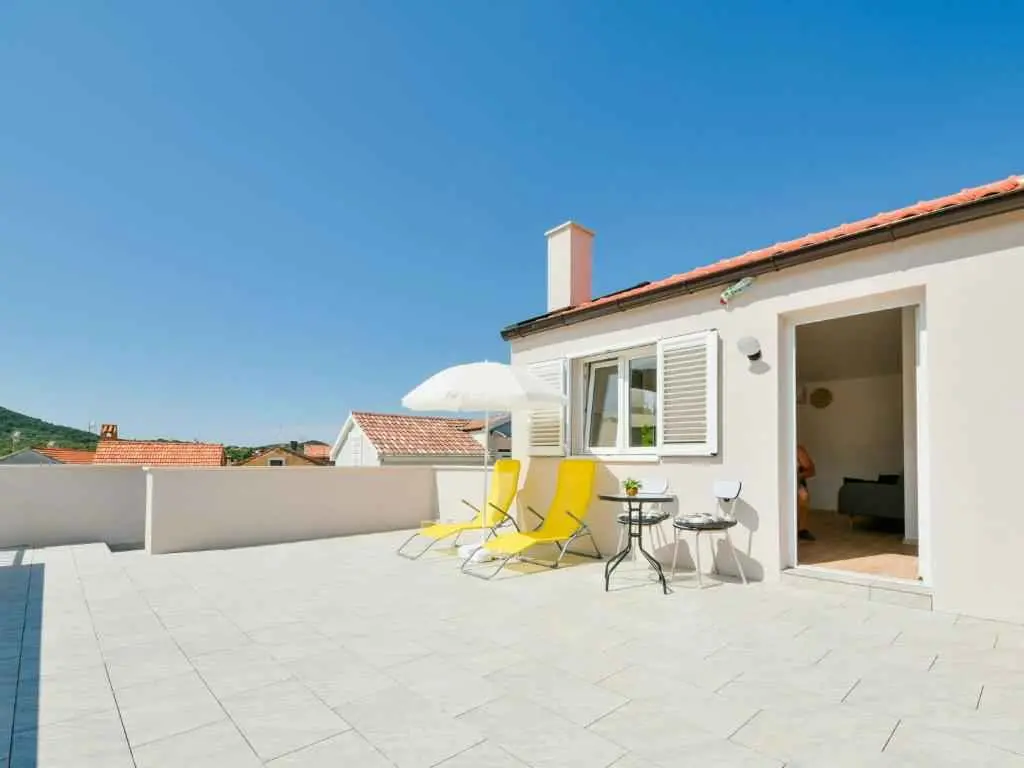 Apartman na katu novosagrađene obiteljske kuće, sa velikom terasom. S obzirom da je na rubu mjesta očekujet obilje mira, tišine i privatnosti. Mogućnost pomoćnog ležaja, tako da je kapacitet 2+1. Na otok se može doći sa dvije linije dnevno koje voze sa poluotoka, a postoji mogućnost dolaska i trajektom što ovisi o voznom redu Jadrolinije.