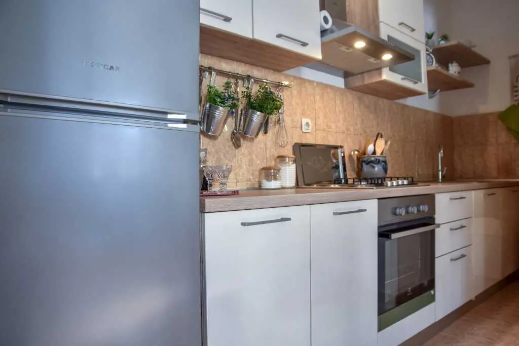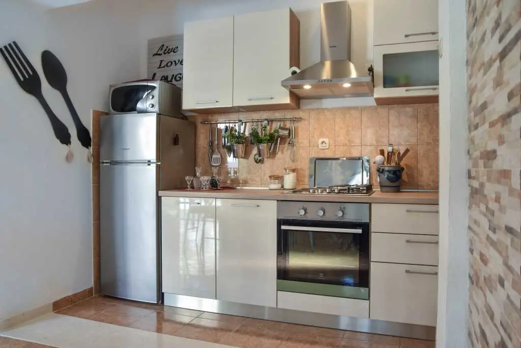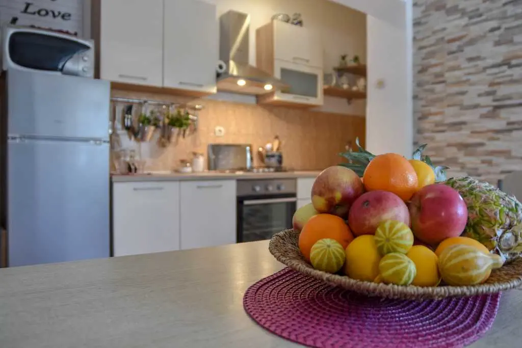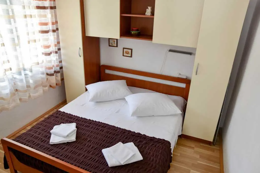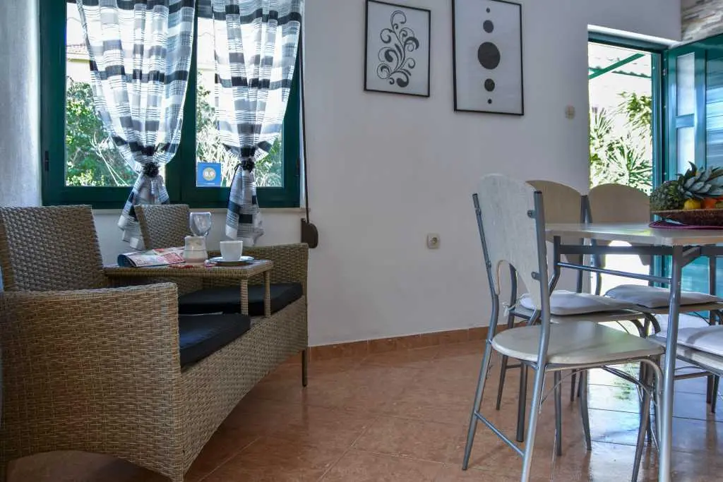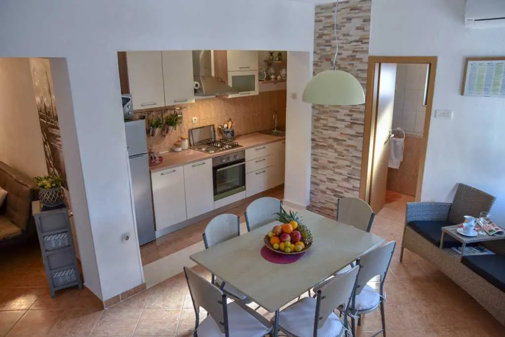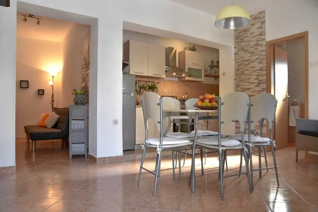 Apartman Flower sadrži dvije spavaće sobe. Obe sobe sadrže bračni krevet. Također u dnevnom boravku nalazi se kauč na razvlačenje, koji je pogodan za jednu odraslu osobu ili dvoje djece. Ima i opremljenu kuhinju, blagovaonicu sa sjedećom garniturom, dnevni boravak i kupaonicu. U jutarnjim satima uz prekrasan izlazak sunca na terasi apartmana, okruženi zelenilom, možete uživati u svom vremenu ispijajući kavu ili u roštiljanju u vrtu. Ono što prostor čini jedinstvenim je prije svega njegova lokacija - 50 m udaljenosti od mora, dugačke plaže (sadržaj za djecu na plaži), restorana uz more i bara na plaži. U neposrednoj blizini apartmana nalazi se poznati restoran (1 min pješice) i bar na plaži (1 min hoda). Uzduž obale možete šetati zahvaljujući dugoj rivi uz obalu. Za vrijeme Vašeg boravka ne trebate automobil jer je sve što vam je potrebno vrlo blizu apartmana kao što su plaža, restoran, kafić, bar na plaži, tržnica, ljekarna, autobusna stanica itd. Domaćin će Vas srdačno dočekati i biti Vam na raspolaganju tijekom Vašeg boravka.