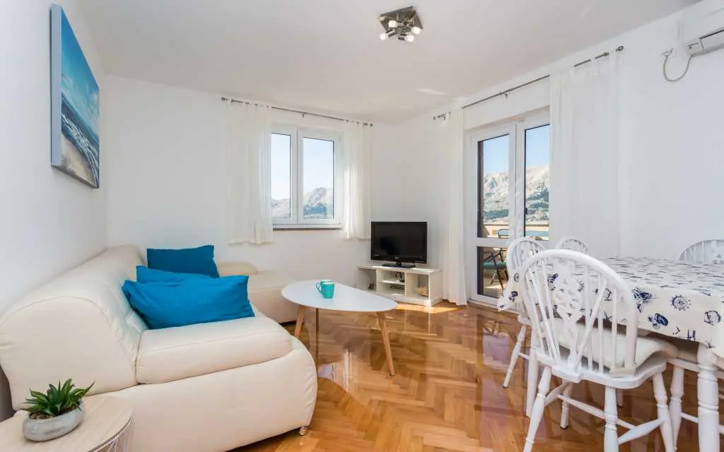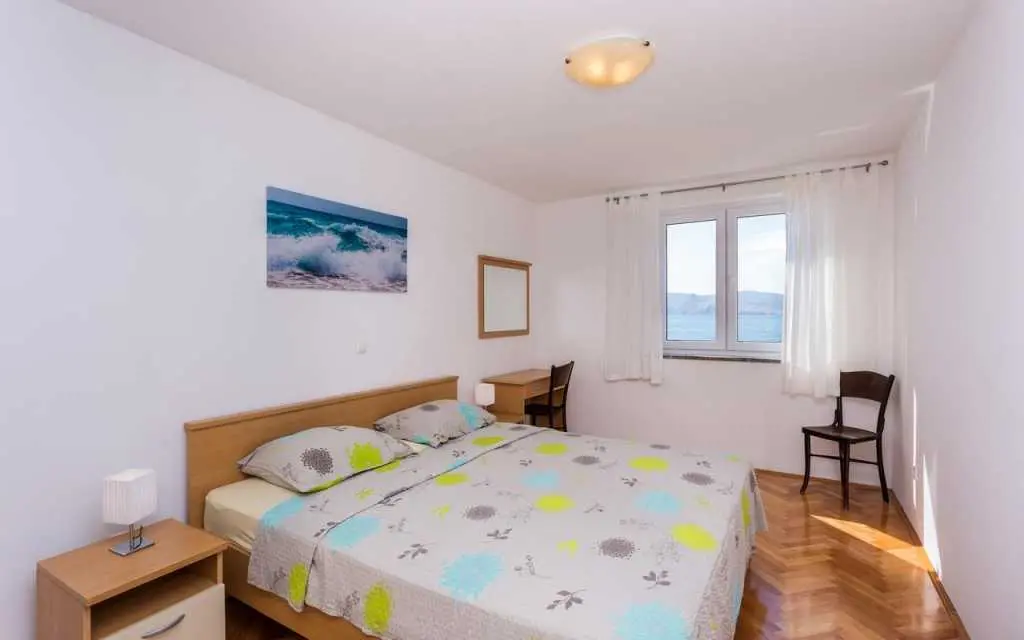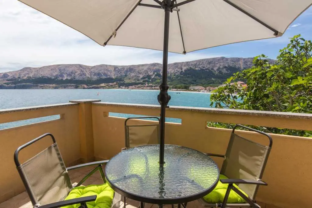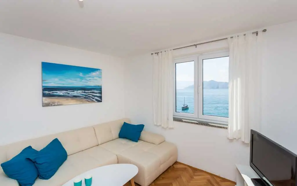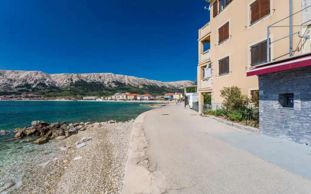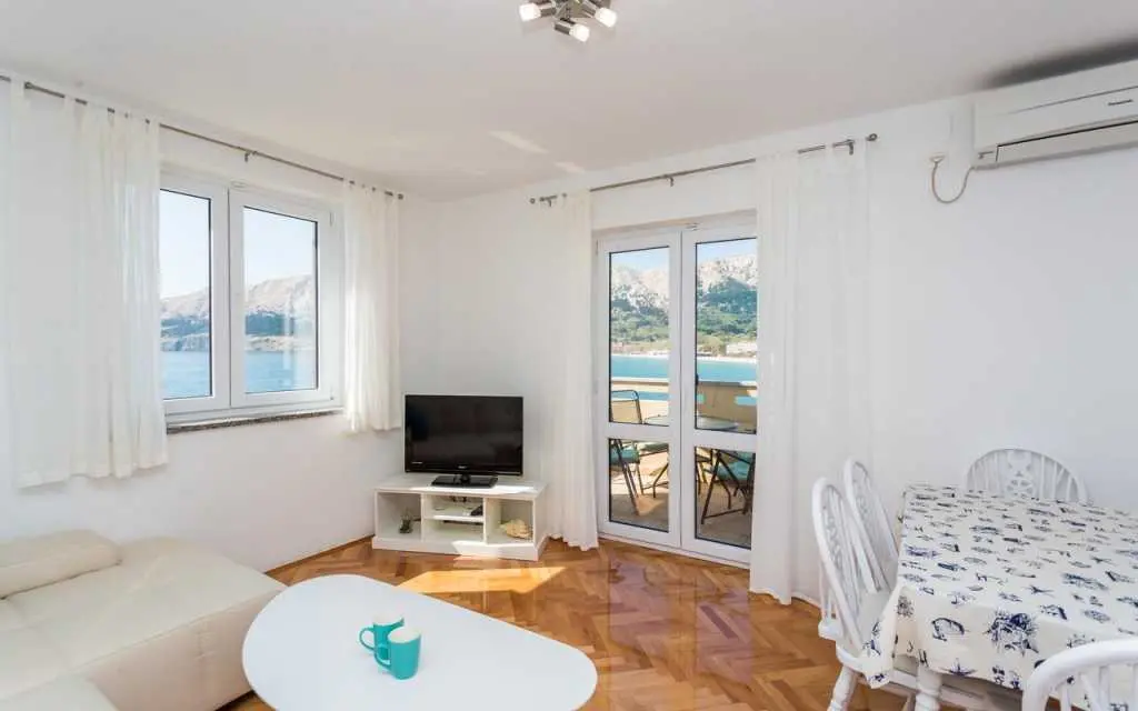 Naš najbolji apartman prvi red do mora u samom centu Baške. S terase seže pogled na cijelu Bašku i otok Prvić. Apartman ima 2 sobe, kupaonu, kuhinju, dnevni boravak/blagovaonu, terasu, A/C besplatan parking, wifi, TV, SAT, sef posteljinu i ručnike. Kućni ljubimci su dobrodošli! Kompletno renoviran 2018.!