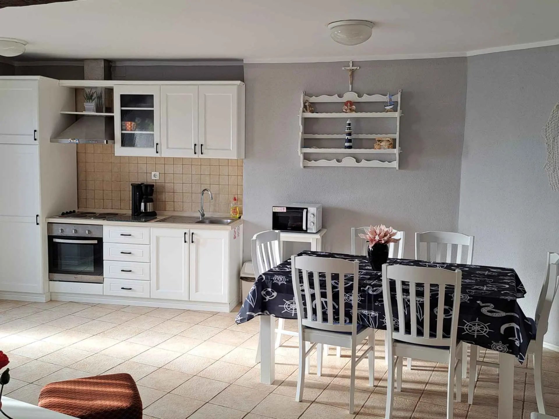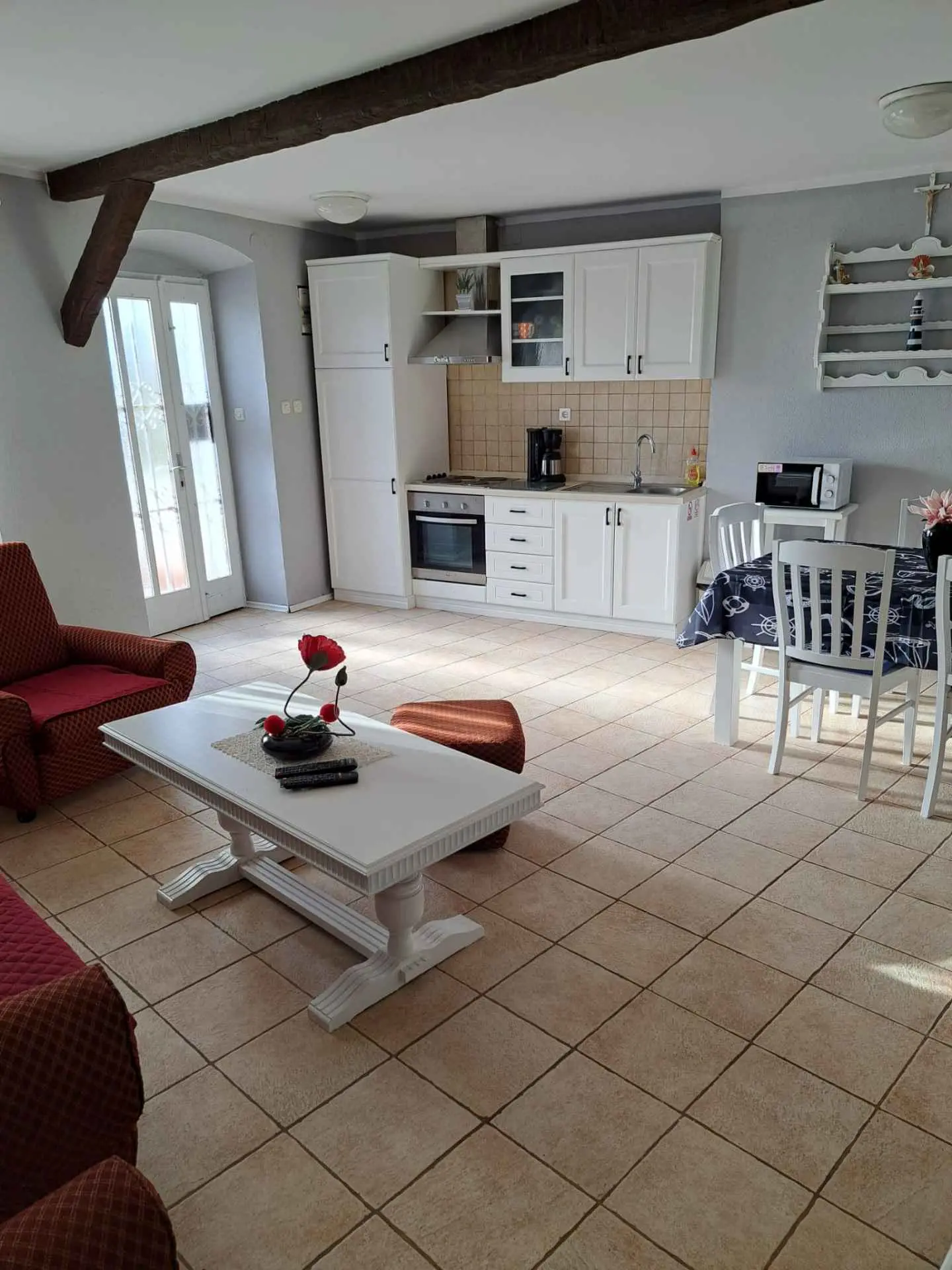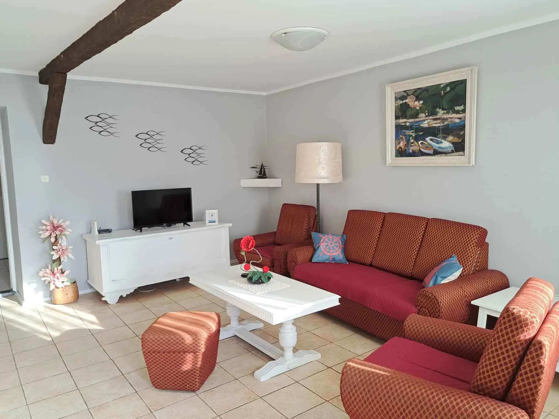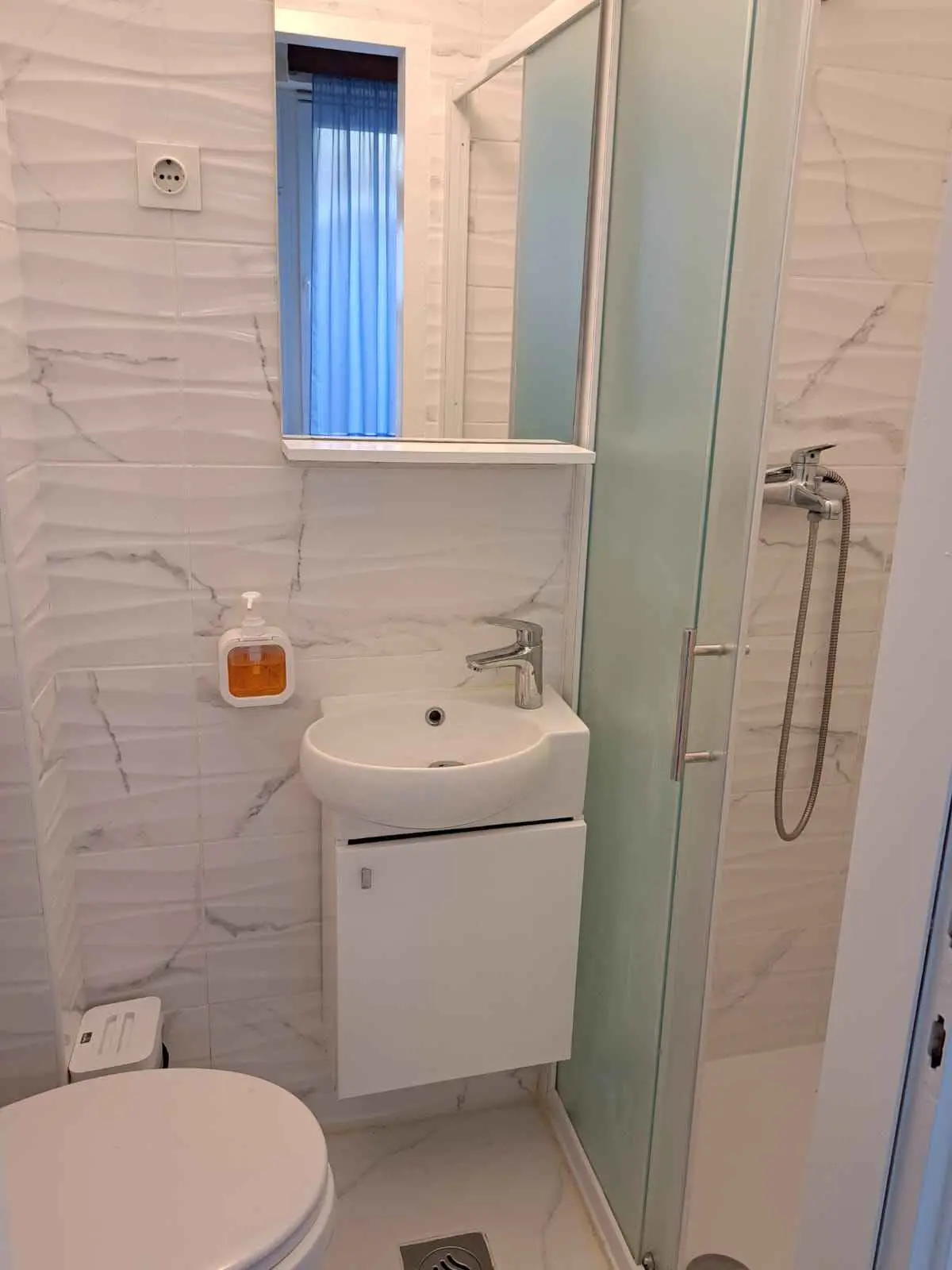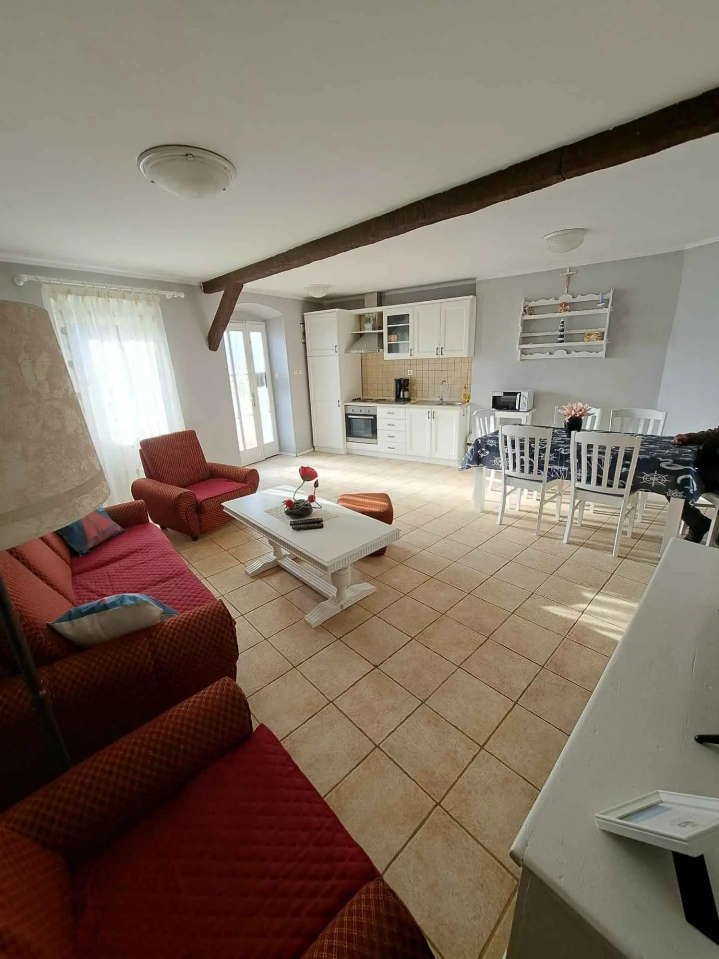 Apartman je za 4+1 (najviše 4 odrasle osobe + 1 dijete) Apartman ima dnevni boravak, blagovaonicu i kuhinju. Na istom katu je kupaona i odvojeni wc. Na katu apartman ima 2 spavaće sobe sa bračnim krevetima i pomoćni ležaj ( fotelja na razvlačenje u jednoj spavaćoj sobi) i kupaona sa wc. Na krovu apartmana nalazi se terasa Apartman se nalazi u staroj jezgri prvi red do mora. Apartman je udaljen 100m od prve plaže koju naši gosti rado koriste. Imate osigurano parkirno mjesto za dva automobila udaljeno od apartmana 10 minuta ili cca 500m. Apartman je smješten u pješačkoj zoni.