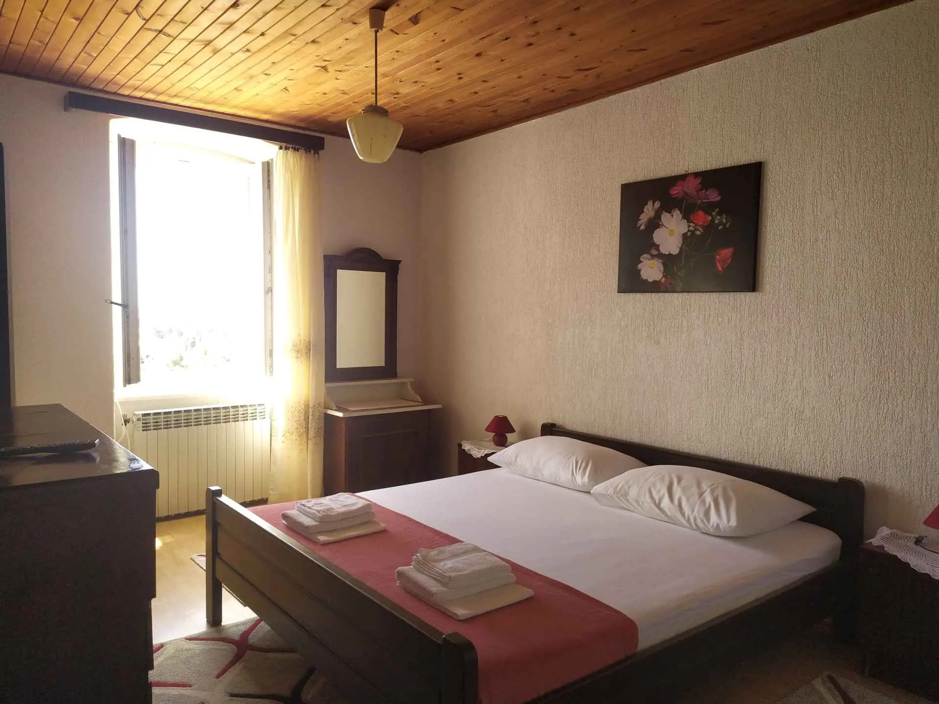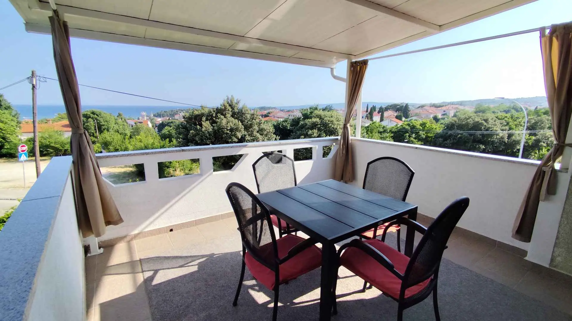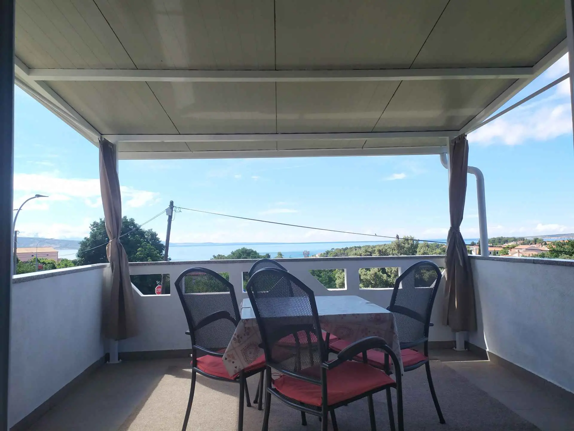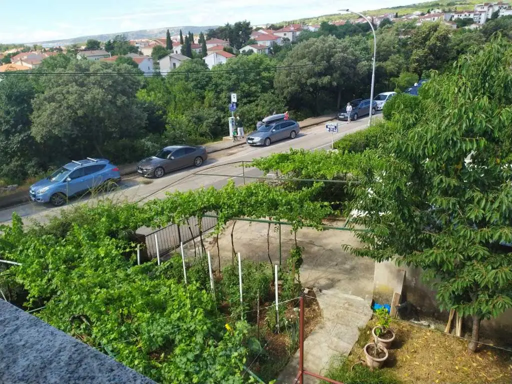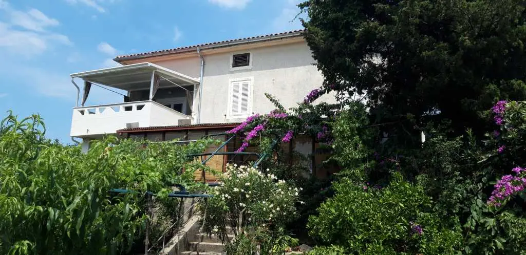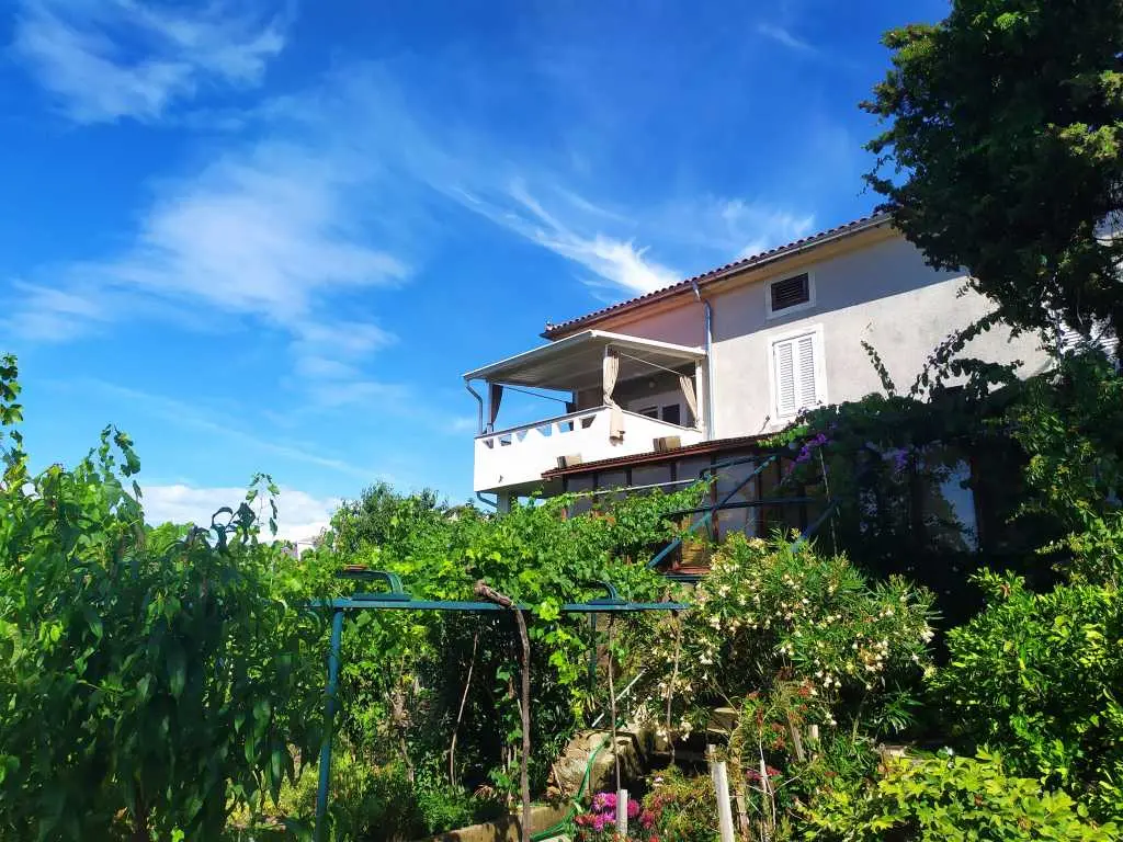Apartman se nalazi na 1. katu obiteljske kuće i zauzima cijeli kat. Terasa je natkrivena, veličine cca 12 m2 i ima prekrasan pogled na more. Parking za jedno vozilo nalazi se u dvorištu. Boravak kraći od 3 dana uvećava se za 30%.