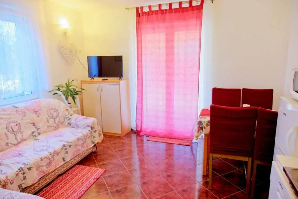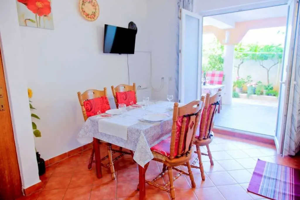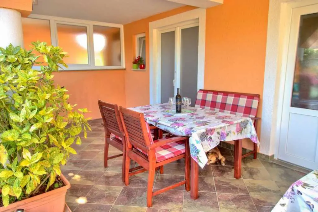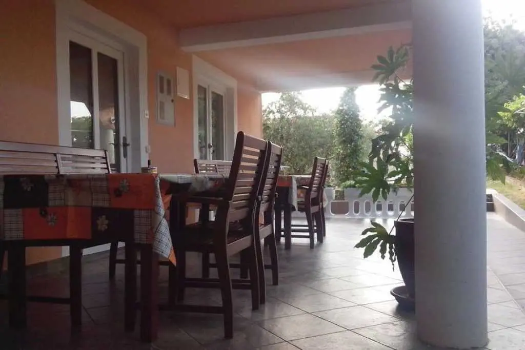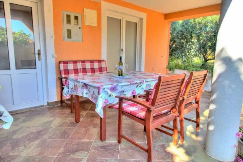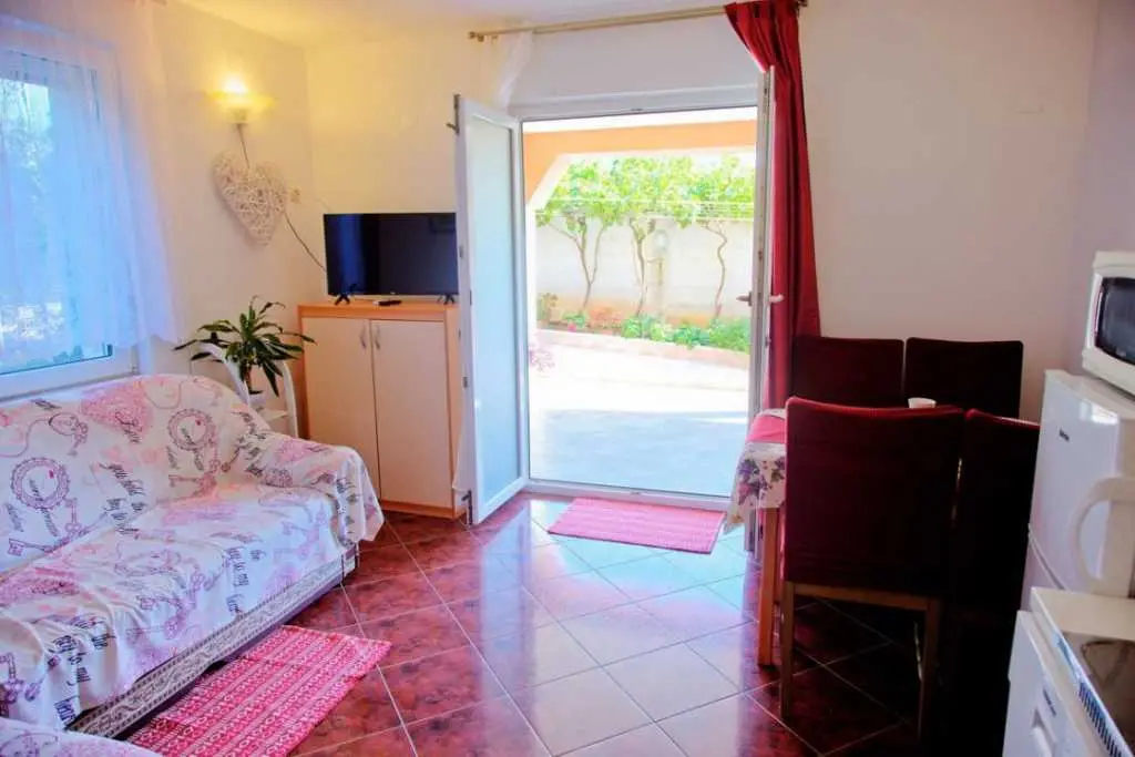 Gospodarze bardzo mili i przyjaźni.Apartament bardzo cysty schludny i przytulny.Jest wyposażony w lodówkę mikrofalówkę kuchenkę zmywarkę pralkę garki itp.Wszysto co potrzeba.Łóżka bardzo wygodne i czysta pościel oraz czyste ręczniki.Po 6 dniach dostaliśmy ponownie czystą pościel ora czyste ręczniki.Apartament jest zacieniony więc można odpocząć po upale.Przed apartamentem wspaniałą weranda również zacieniona gdzie można odpoczywać jeść posiłki pić kawe i podziwiać wspaniały ogród.Ogrod jest bardzo bardzo zielony i zadbany. Są kiście winogron,drzewo cytryny drzewa kasztana pachnącą lawenda drzewka oliwne i wiele innych zadbanych kwiatów i roślin.Wokół apartamentu cisza i spokój.Jezeli wrócimy do Chorwacji w następnym roku to na 100 % tylko do tej rodziny i tego apartamentu.Oceniamy pobyt na 100% polecamy
