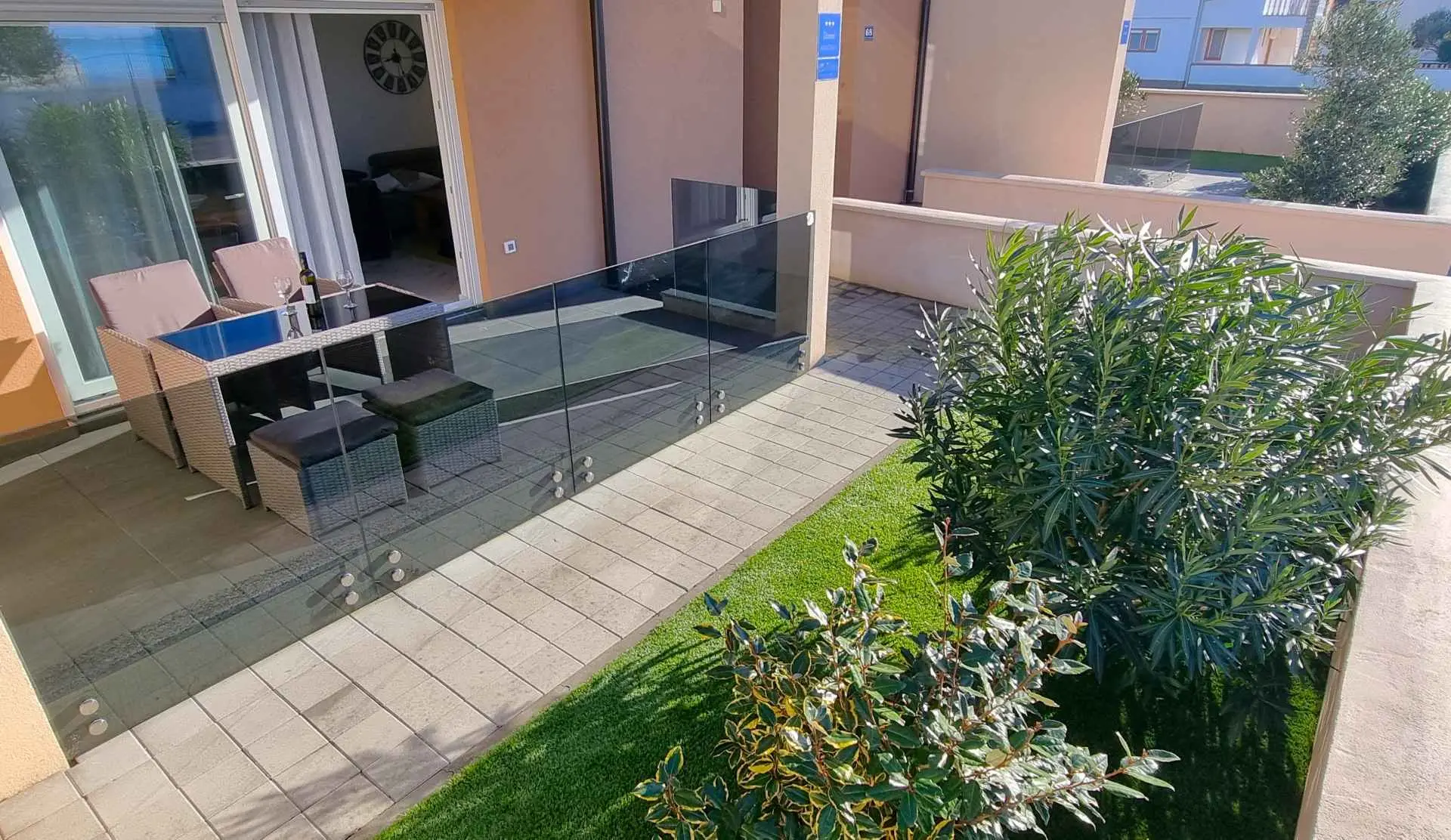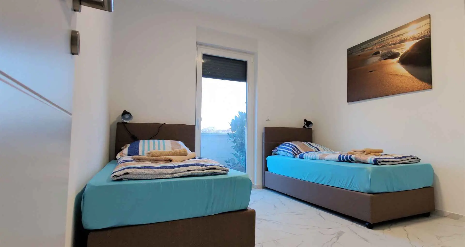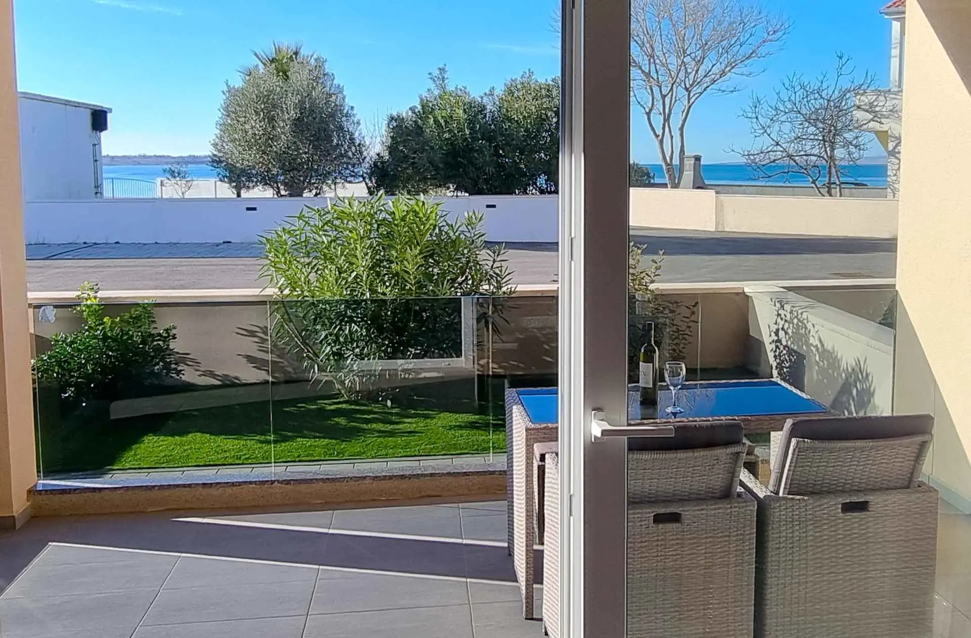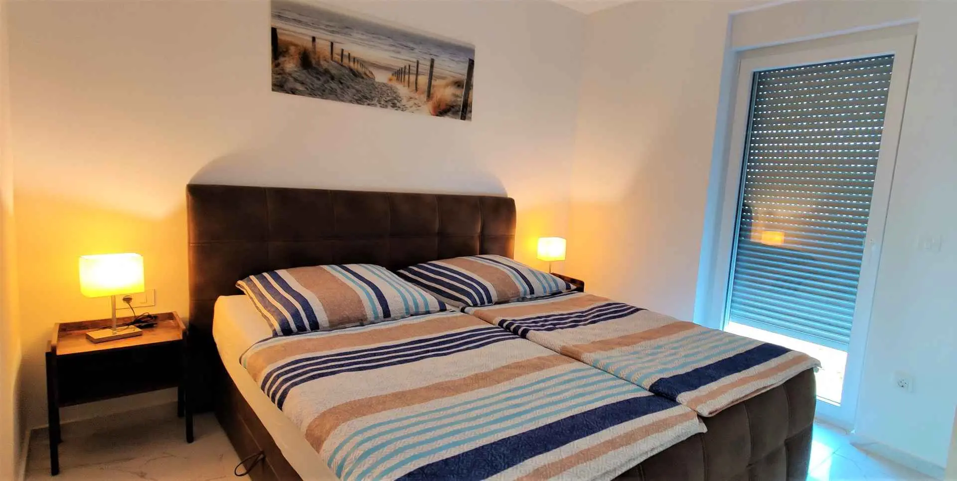 Apartman "Le Mare" - NIN - 50 metara od mora - pješčana plaža (prizemlje, max. 4 osobe) Naš novi apartman "Le Mare" iz 2022. godine nalazi se na rubu naselja Nin i udaljen je cca 50 metara od pješčane plaže s Caffè barom. Također ima prekrasan pogled na planine "Velebit" i otok Pag. Ispred apartmana nalazi se privatni parking gdje naši gosti mogu parkirati svoj automobil. U dvorištu iza apartmana se nalaze ležaljke, kao i gril, stol i stolice. Sve sobe posjeduju klima uređaj. U kupaonici je perilica za rublje, a u kuhinja je potpuno opremljena. Sažetak najvažnijih stvari: Spavaća soba sa bračnim krevetom (180*200) Spavaća soba sa dva odvojena kreveta (90*200) kupaonica (tuš kabina) blagovaonica dnevna soba terasa sa pogledom na more parking u dvorištu mali vrt iza stana udaljenost od mora: cca 50 m, pješčana plaža posteljina uključena perilica rublja: da
