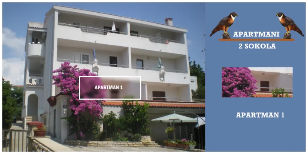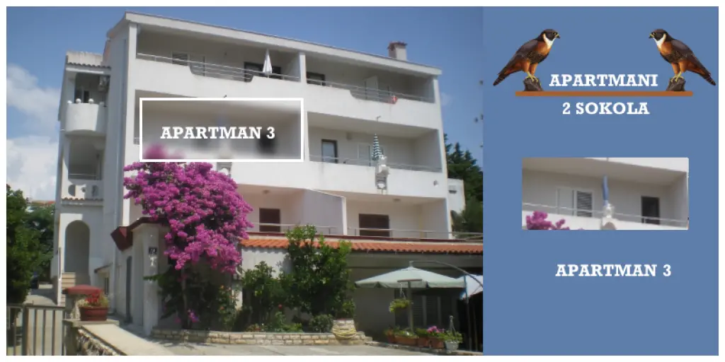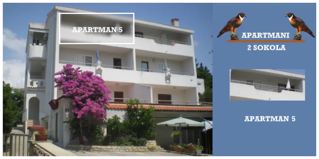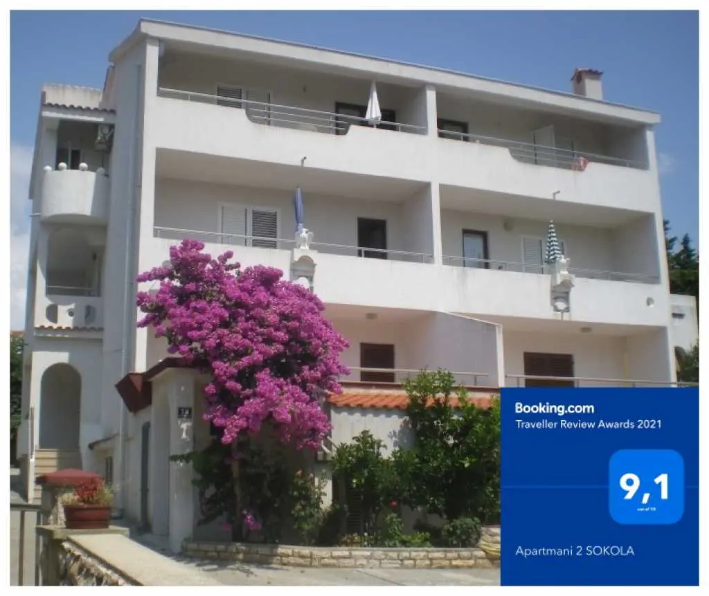 Naši apartmani nalaze se u mirnom turističkom dijelu grada Novalje samo 100 metara od plaže. Kuća raspolaže s 4 apartmana ( 4xA4 za 4 osobe), koji se sastoje od 2 sobe, kuhinje, kupaonice s tušem ili kadom, te terase ili balkona. Apartmani imaju Sat-TV. Svi apartmani opremljeni su posteljinom i ručnicima: uz ostalo potrebno posuđe, tu je aparat za kavu i pegla. Domaćini se služe njemačkin te engleskim jezikom. Ispred kuće se za goste nalazi gril te prostor za parkiranje. Neki apartmani imaju mogućnosti korištenja klima uređaja. Više slika i kompletan opis na našoj stranici: www.apartmani2sokola.com