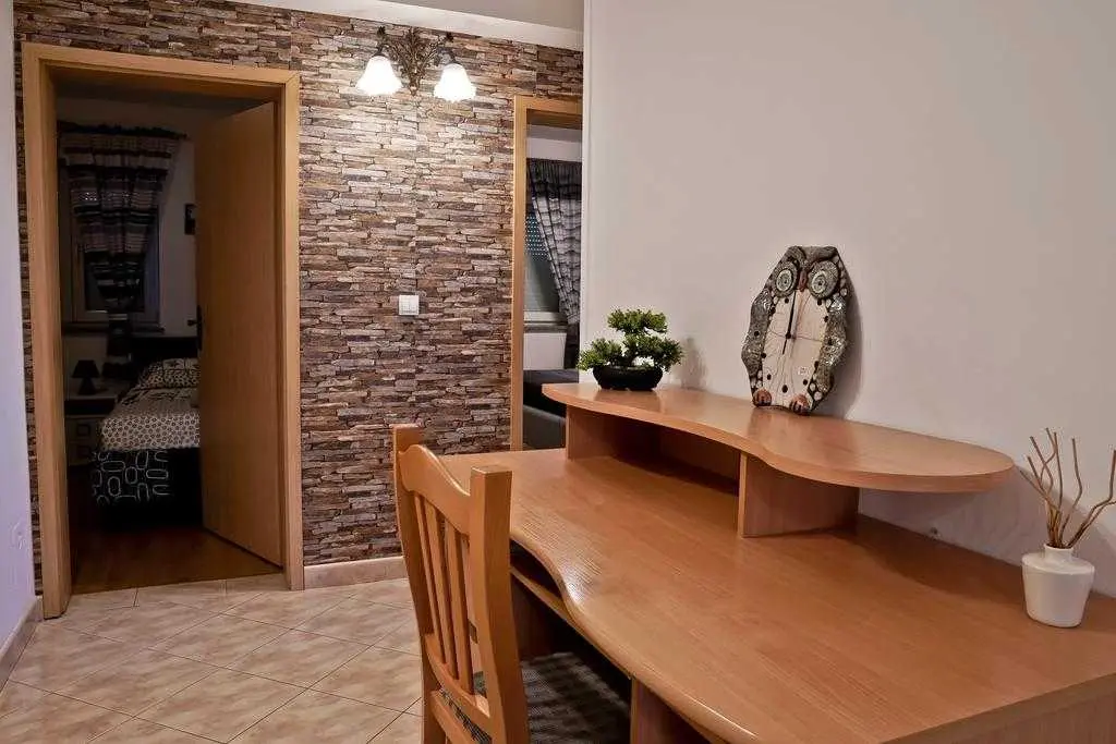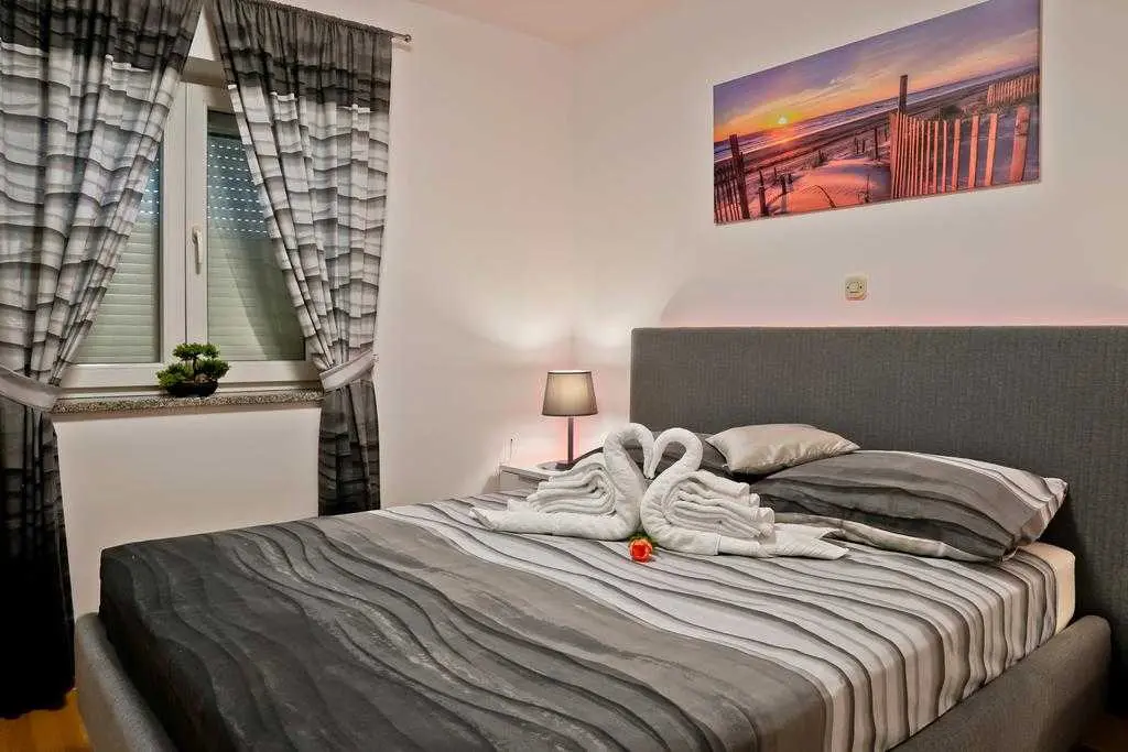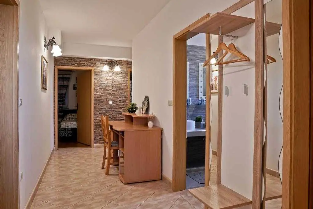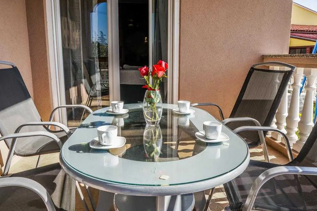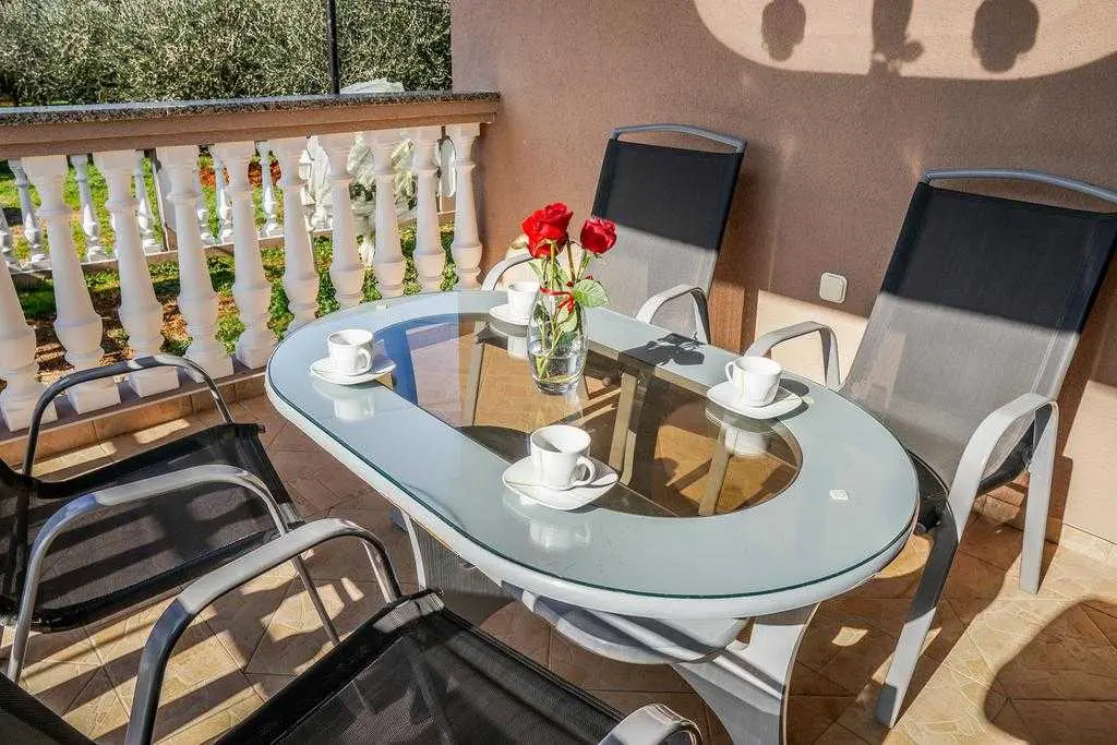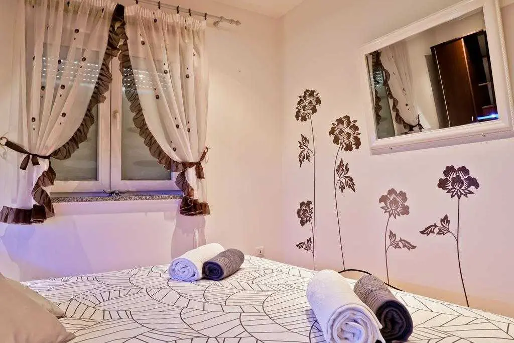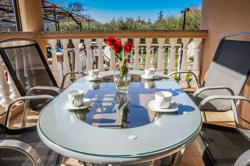 Apartman se nalazi u predgrađu Pule, u prizemlju obiteljske kuće na tihoj i mirnoj lokaciji. Obogaćen je dodatnim sadržajima u vanjskom prostoru- besplatan, ograđen parking na posjedu, dječje igralište s ljuljačkama i trampolinom, prostor za sjedenje u hladovini, zelenilo i moderno uređena okućnica, konoba s roštiljem i drvenim klupama za sjedenje i objedovanje. Unutrašnjost apartmana je moderno i funkcionalno uređena. Sastoji se od tri sobe, dva kupatila, hodnika ,dnevnog boravka, kuhinje, blagavaone i terase. Posteljina i ručnici uključeni su u cijenu. Na zahtjev možete dobiti dječji krevetić. Centar grada (gdje možete pogledati znamenitosti kao što su Zlatna vrata, Augustov hram, Arena..) kao i prve plaže udaljeni su samo 4 km od apartmana. Trgovina s namirnicama nalazi se u blizini (200m). Pula citty mall shoping centar samo 2 km od apartmana. Paintball i Adrenalin park udaljeni su 3 km.