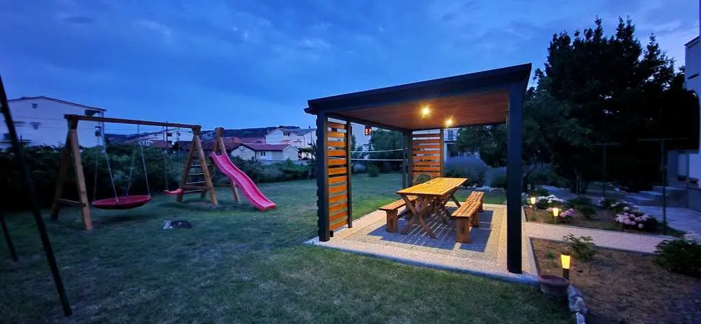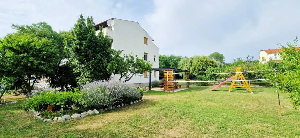 Dobrodošli u naše apartmane Lopar 377! Smješteni u srcu Lopara i udaljeni samo 800 metara od plaže u ponudi imamo 2 apartmana. Svi apartmani su u potpunosti opremljeni i spremni na Vaš dolazak! Apartman B se nalazi na prvom katu, ima 3 spavaće sobe, dvije potpune kupaonice, dnevni boravak s blagavaonom i kuhinju. Dvije spavaće sobe su opremljene bračnim krevetom dok je u trećoj krevet za jednu osobu. U dnevnom boravku se nalazi kauč koji se također može koristiti za spavanje. Apartman B ima prostran balkon sa kojeg možete uživati u pogledu na okolinu. Apartman C se nalazi u potkrovlju, ima 2 spavaće sobe, jednu potpunu kupaonicu, dnevni boravak i kuhinju s blagavaonom. Spavaće sobe su opremljene bračnim krevetom i velikim ormarom. U dnevnom boravku se nalazi kauč koji se također može koristiti za spavanje. Apartman B ima prostran balkon sa kojeg možete uživati u pogledu na okolinu. Svi apartmani imaju na korištenje okućnicu veličine 1300m2 koja sadrži sjenicu s klupama i stolom, ljuljačke, instalaciju za penjanje s toboganom i najviše od svega puno zelene površine na kojoj se možete zabavljati ali i opustiti. Okućnica je ograđena tako da svoje najmlađe možete pustiti da slobodno uživaju u svim čarima ovog predivnog dvorišta. U sklopu smještaja osiguran je besplatan parking stoga svoj automobil bezbrižno parkirajte i uživajte u dostupnosti sadržaja u blizini.