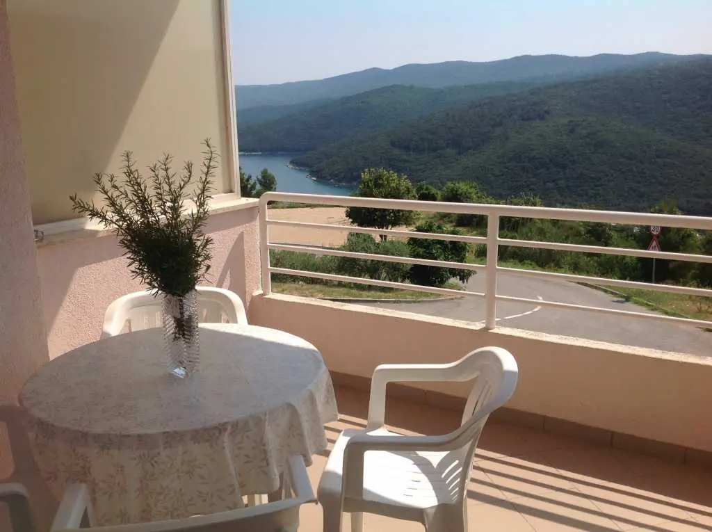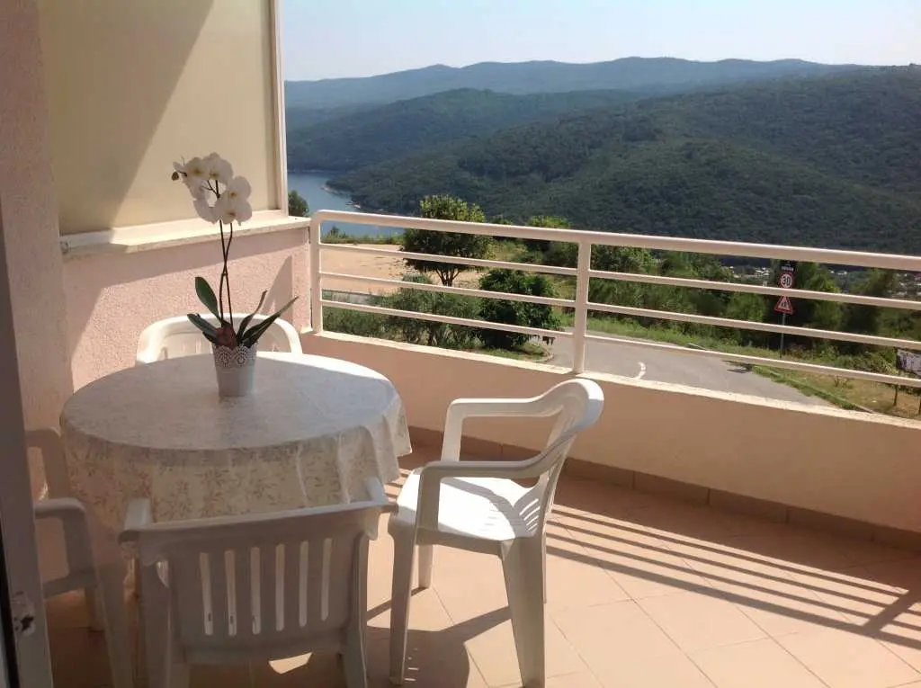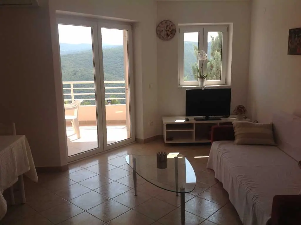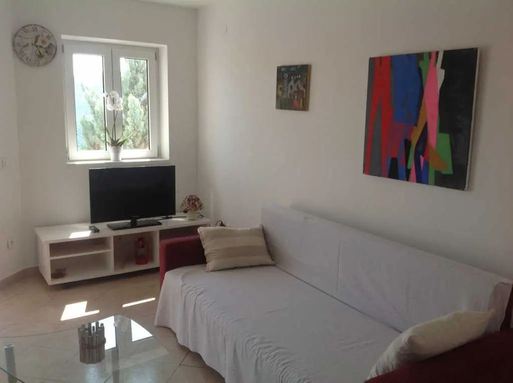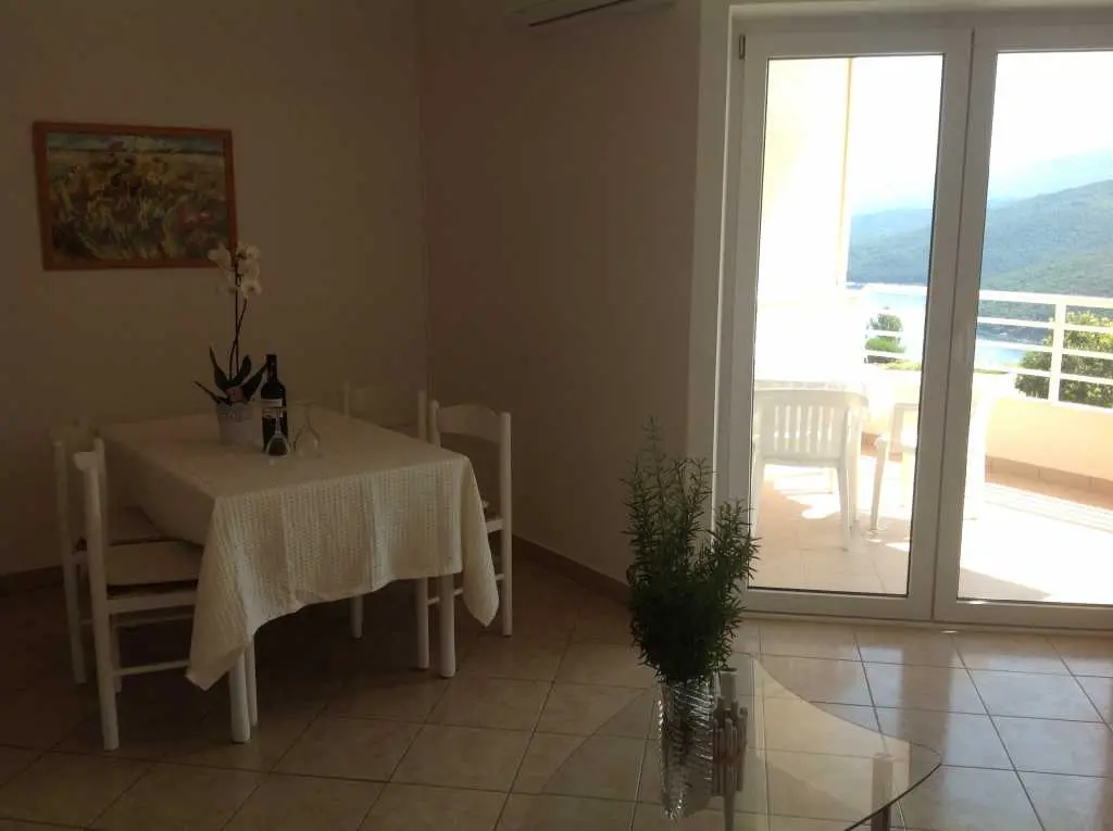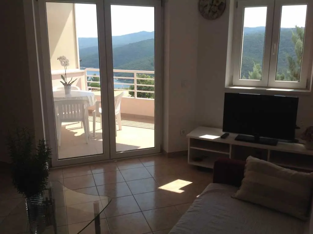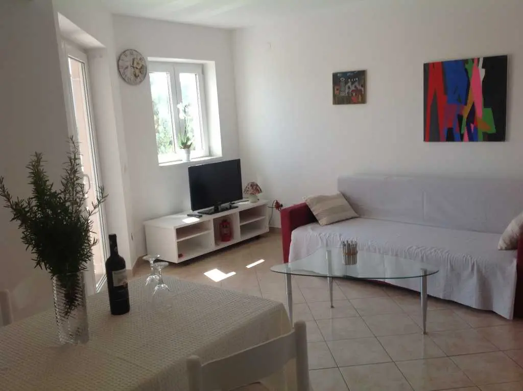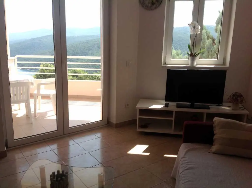 Apartman se nalazi na cc. 800 metara od mora. Put do mora je kroz borovu šumu i opuštajući i relaksirajući uz mio mirise borovine i lavande da je za poželjeti ići pješke. Apartman ima dvije spavaće sobe s bračnim krevetima, predsoblje, kupaonu, boravak s kuhinjom te terasom s pogledom na more i borovu šumu. Orijentacija apartmana je sjever-jug te je ugodno u ljetnim mjesecima. U zimskim mjesecima je topao i izoliran s drugim stanovima. Opremljen je klimom, kuhanje je na plin i struju. Ima jedno do dva parkirna mjesta. Pogodan za četiri osobe a po potrebi može i šest osoba pri čemu je razvlači sjedeća garnitura u boravku. S terase je divan pogled na more i na otok Cres i Lošinj. Cijena apartmana ovisi o tome da li trebate u vrijeme pred sezone, sezone ili u pod sezoni. Plaže su prekrasne uz biserno čisto more i opremljenim plažama uz oblutke i ležaljke, slastičarne, bazene uz more, te zanimljivosti za djecu i druženje uz niz kulturnih zbivanja za djecu i odrasle.