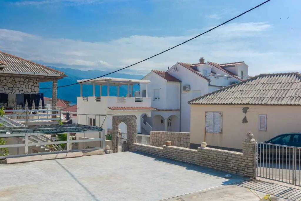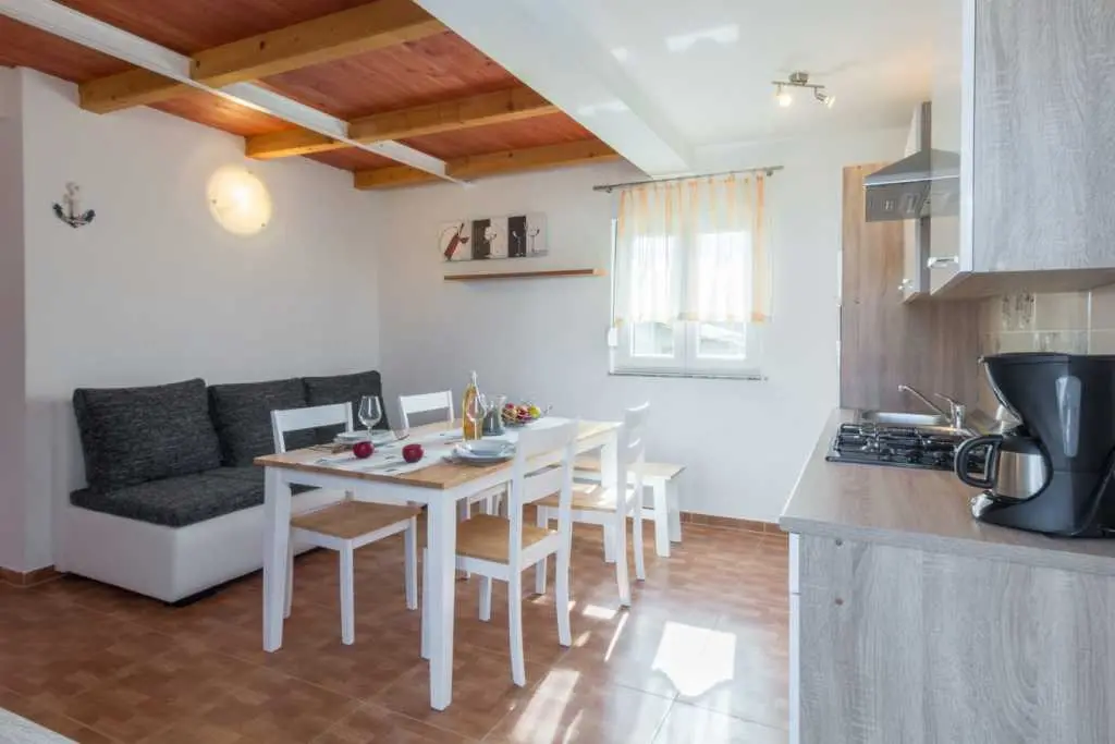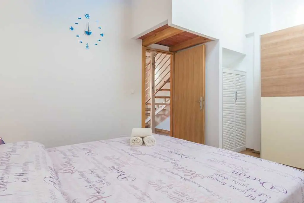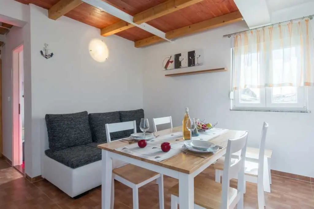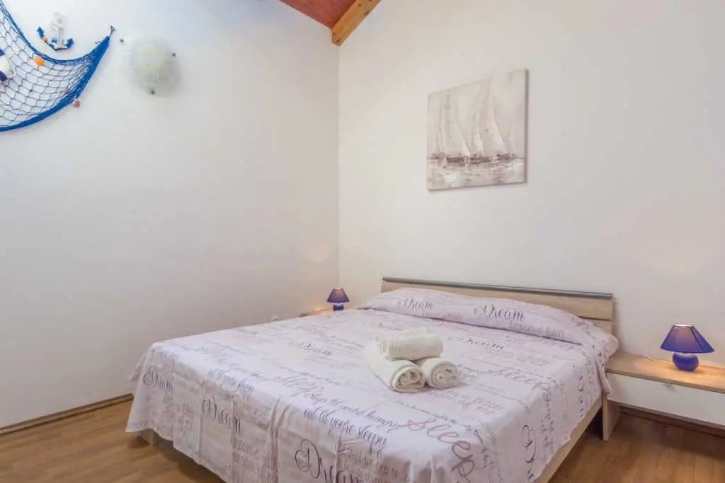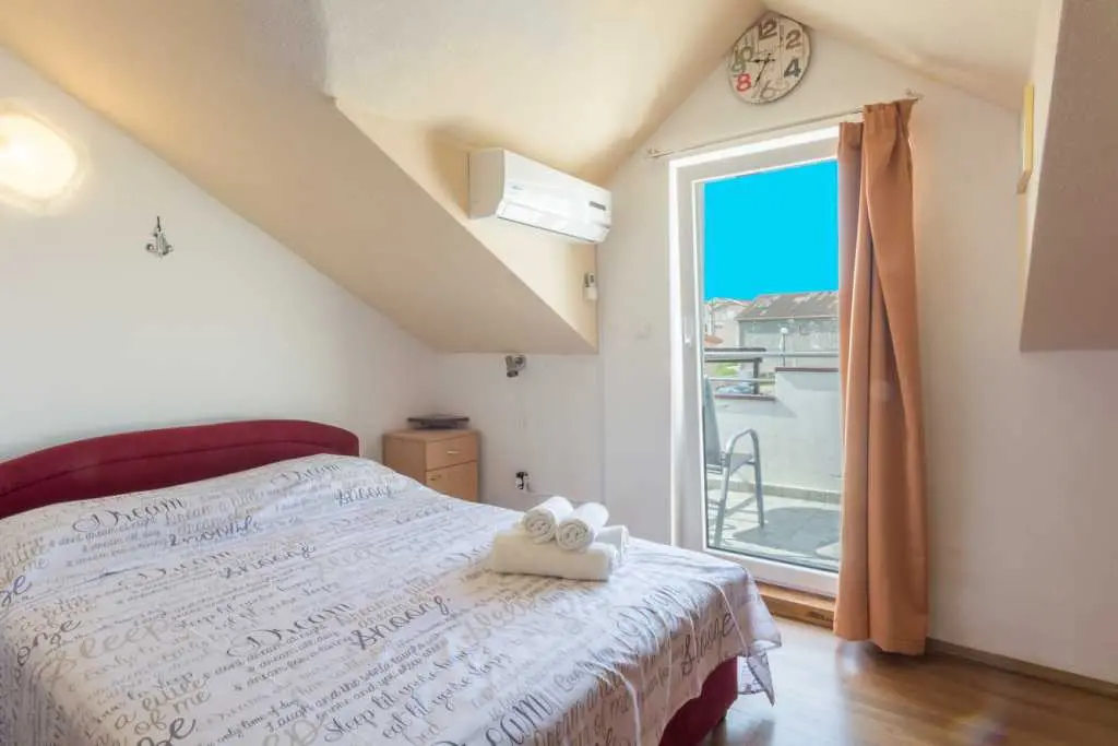 Apartman je veličine 65 metara kvadratnih i može pružiti smještaj za 6 ljudi. Apartman se nalazi na prvom katu obiteljske kuće te u visokom potkrovlju. Na pravom katu je nova kuhinja i dnevni boravak, veća kupaona te glavna spavaća soba. Kuhinja i dnevni boravak čine jedan prostor u kojem se nalazi i stol sa stolicama za 6 ljudi te su klimatizirani. Tu se također nalazi led tv (82 cm) s satelitskim programom te kauč na razvlačenje u veličinu 160 x 200 koji pruža ugodno spavanje za dvije osobe. Kuhinja je nova i potpuno opremljena s kućanskim aparatima: plinska ploča, pećnica, napa, kuhalo, toster, mikrovalna, frižider. Kupaona je velika 6 metara kvadratnih te ima tuš kabinu, toalet i lavandin. Na istom katu nalazi se glavna soba koja je opremljena bračnim krevetom 180 x 200 sa noćnim ormarićima i noćnim lampama. U sobi se nalazi veći garderobni ormar. Soba je visoka, a poseban doživljaj pruža krovni prozor sa sjenilom i mogućnošću potpunog zamračenja. Iz dnevnog boravka moderne stube od drveta i ograda od inoxa vode do gornje sobe u potkrovlju. U gornjoj sobi je francuski ležaj 150 x 200 te ugradbeni ormar. Pored sobe se nalazi manji toalet. Iako je soba malena također je u njoj osiguran klima uređaj tako da je kompletan apartman potpuno klimatiziran. Iz gornje sobe vrata vode na balkon veličine 6 kvadrata sa stolom i stolicama za dvoje i intimniju atmosferu zaštićen od pogleda. Pogled sa balkona pruža se na ribarsko mjesto Ražanac. Cijeli apartman i dvorište je pokriveno wifi internetom signalom. U obiteljskoj kući se nalazi još jedan apartman. Ispred kuće je zajedničko dvorište te je namjenjeno za druženje, pogotovo za djecu s obzirom daje dvorište ograđeno ogradom koja se može blokirati. U dvorištu se nalazi i vanjski tuš gdje se voda grije sunčevom energijom koje u Ražancu u ljetnim mjesecima ne nedostaje. U pogledu na more možete uživati na neobičnoj zajedničkoj terasi opremljenoj vrtnim namještajem i natkrivenoj drvenom konstrukcijom. Osim pogleda na more, uživati ćete i u prekrasnom pogledu na planinu Velebit koja cijelom mjestu osigurava čist i zdrav zrak što alergičarima i astmatičarima čini boravak u Ražancu vrlo ugodan i zdrav. U apartmanu ćemo Vam na zahtjev osigurati i dječji prijenosni krevetić te hranilicu za bebe. Velika prednost ovog obiteljskog apartmana su mirne i tihe noći te prilaz plaži s dječjim kolicima. U dvorištu se nalazi i roštilj za zajedničke večere. 30 metara od kuće nalazi se ograđeni parking za vaše vozilo.