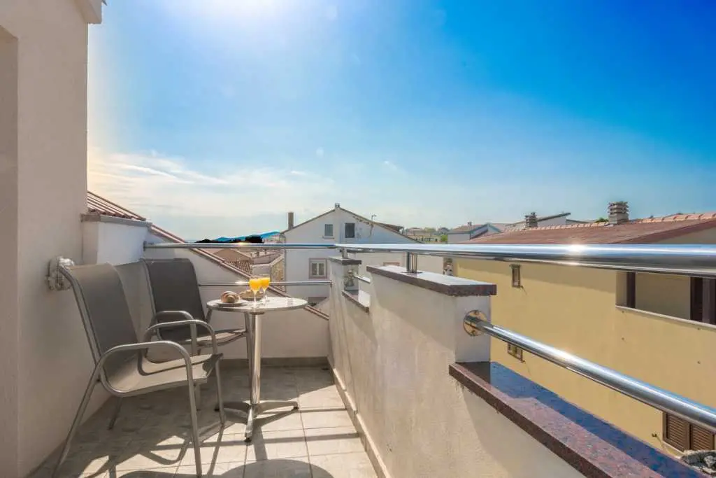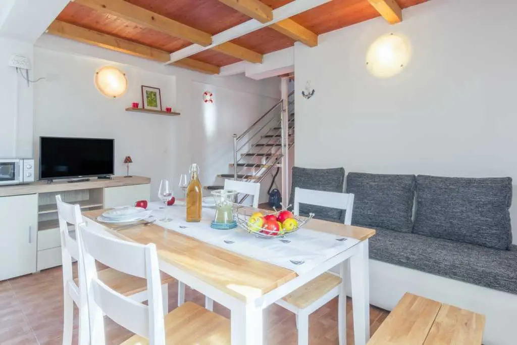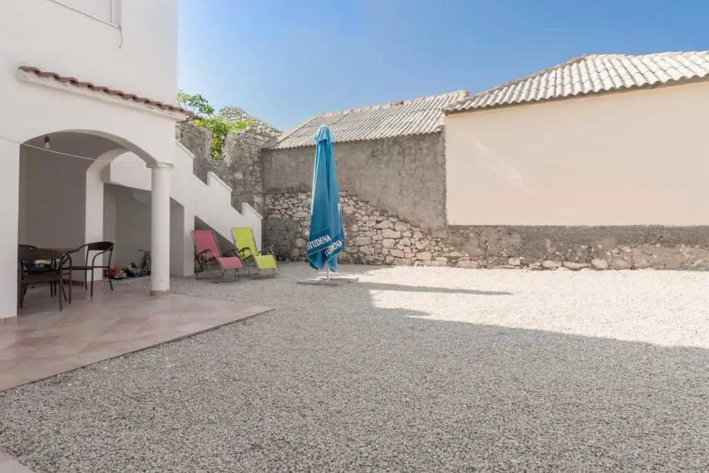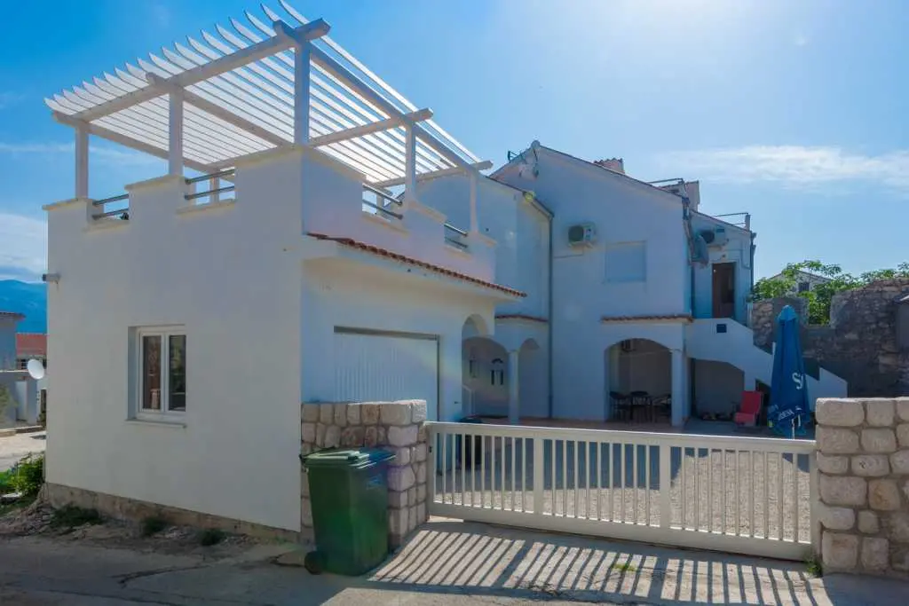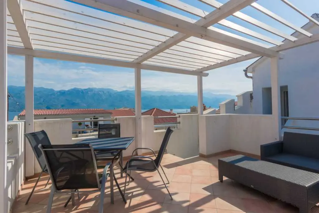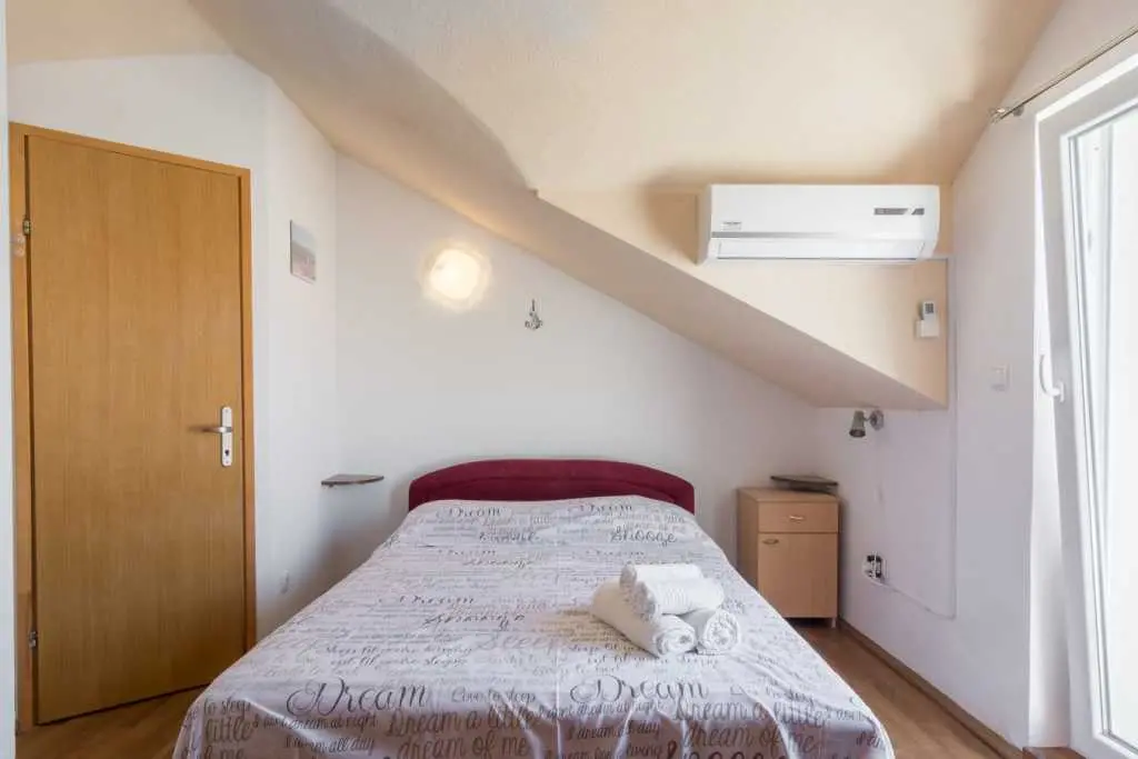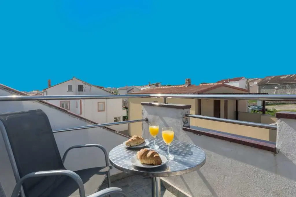 Apartman je veličine 65 metara kvadratnih i može pružiti smještaj za 6 ljudi. Apartman se nalazi na prvom katu obiteljske kuće te u visokom potkrovlju. Na pravom katu je nova kuhinja i dnevni boravak, veća kupaona te glavna spavaća soba. Kuhinja i dnevni boravak čine jedan prostor u kojem se nalazi i stol sa stolicama za 6 ljudi te su klimatizirani. Tu se također nalazi led tv (82 cm) s satelitskim programom te kauč na razvlačenje u veličinu 160 x 200 koji pruža ugodno spavanje za dvije osobe. Kuhinja je nova i potpuno opremljena s kućanskim aparatima: plinska ploča, pećnica, napa, kuhalo, toster, mikrovalna, frižider. Kupaona je velika 6 metara kvadratnih te ima tuš kabinu, toalet i lavandin. Na istom katu nalazi se glavna soba koja je opremljena bračnim krevetom 180 x 200 sa noćnim ormarićima i noćnim lampama. U sobi se nalazi veći garderobni ormar. Soba je visoka, a poseban doživljaj pruža krovni prozor sa sjenilom i mogućnošću potpunog zamračenja. Iz dnevnog boravka moderne stube od drveta i ograda od inoxa vode do gornje sobe u potkrovlju. U gornjoj sobi je francuski ležaj 150 x 200 te ugradbeni ormar. Pored sobe se nalazi manji toalet. Iako je soba malena također je u njoj osiguran klima uređaj tako da je kompletan apartman potpuno klimatiziran. Iz gornje sobe vrata vode na balkon veličine 6 kvadrata sa stolom i stolicama za dvoje i intimniju atmosferu zaštićen od pogleda. Pogled sa balkona pruža se na ribarsko mjesto Ražanac. Cijeli apartman i dvorište je pokriveno wifi internetom signalom. U obiteljskoj kući se nalazi još jedan apartman. Ispred kuće je zajedničko dvorište te je namjenjeno za druženje, pogotovo za djecu s obzirom daje dvorište ograđeno ogradom koja se može blokirati. U dvorištu se nalazi i vanjski tuš gdje se voda grije sunčevom energijom koje u Ražancu u ljetnim mjesecima ne nedostaje. U pogledu na more možete uživati na neobičnoj zajedničkoj terasi opremljenoj vrtnim namještajem i natkrivenoj drvenom konstrukcijom. Osim pogleda na more, uživati ćete i u prekrasnom pogledu na planinu Velebit koja cijelom mjestu osigurava čist i zdrav zrak što alergičarima i astmatičarima čini boravak u Ražancu vrlo ugodan i zdrav. U apartmanu ćemo Vam na zahtjev osigurati i dječji prijenosni krevetić te hranilicu za bebe. Velika prednost ovog obiteljskog apartmana su mirne i tihe noći te prilaz plaži s dječjim kolicima. U dvorištu se nalazi i roštilj za zajedničke večere. 30 metara od kuće nalazi se ograđeni parking za vaše vozilo.