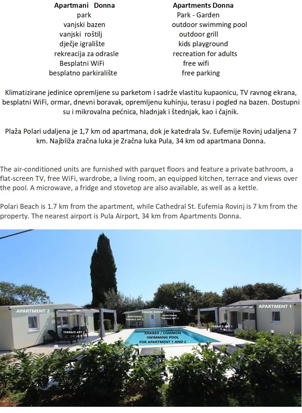Siguran odmor iz snova u raju na zemlji u apartmanima Donna 1 i Donna 2 Apartmani se nalaze u naselju Cocaletto koje je udaljeno svega 4 km od lijepog i nadaleko poznatog Rovinja. Nalaze u istom dvorištu, a između njih se nalazi bazen sa efektima masaže. Smješteni su u netaknutoj prirodi. Osim bazena u dvorištu se nalazi i veliki roštilj, te mjesto za rekreaciju djece i odraslih. Osiguran je gratis parking i wi-fi. Apartmani su opremljeni svime potrebnim za vaš ugodan odmor. Ukoliko isti gosti iznajme oba apartmana, moguće je da sa sobom dovedu i kućne ljubimce.