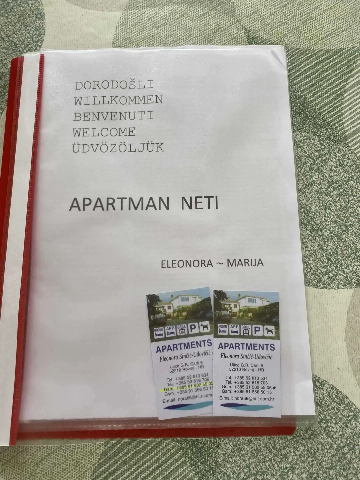 Obitelj smo koja se više od 30 godina bavi iznajmljivanjem apartmana i soba. U sklopu nase obiteljske kuce nalazi se apartman NETI (50 M2 ) koji je kategoriziran sa 3 zvjezdice, apartman MARIJA kategoriziran isto sa 3 zvijezdice i 1 soba sa kupatilom NORA isto kategorizirana sa 3 zvijezdice. Naša obiteljska kuca okruzena je okućnicom i vrtom i velikim parkingom. Kuca ima prizemlje gdje se nalaze apartman MARIJA sa svojim zasebnim ulazom i soba sa kupatilom NORA sa svojim zasebnim ulazom i 1 kat gdje se nalazi apartman NETI sa svojim zasebnim ulazom . U apartmanu NETI se nalazi klima uredjaj koji hladi i grije i on se iznajmljuje cijelu godinu. U apartmanu MARIJA nema klima uredjaj jer je prizemlje kuće od kamena pa ne treba. Apartman MARIJA se iznajmljuje samo 6,7,8, mjesec ( ljetne mjesece ) U sobi NORA nema klima uredjaj, gostima dajemo ljeti ventilator a zimi ima grijanje i soba se iznajmljuje cijelu godinu. Do centra grada ima svega 15-20 min šetnje ili 3 min autom a do prve plaže PORTON BIONDI je cirka 10 min hoda , u blizini nase obiteljske kuce nalazi se velika trgovina Kufland , dječiji parkic sa ljuljackama i klackalicama , restorani Tugurio, Orka, Perla, Porton Biondi , stomatolog te veterinarska ambulanta. Naš apartman NETI i apartman MARIJA i soba NORA čekaju da postanete naši gosti i uživate u nezaboravnom odmoru u predivnoj Istri i Rovinju. Apartman NETI prima u smještaj od 2 gosta, parovi ili prijatelji a soba NORA 2 gosta, u apartmanu MARIJA mogu boraviti 2 gosta. . Uz objekt je i zidani roštilj u nasem vrtu , gdje možete uživati u delicijama sa roštilja koje sami spremate u miru i tišini. U kratko rečeno, idealno mjesto za bijeg od svakodnevice i odmor za cijelu obitelj ili parove ili prijatelje. Osigurani su ručnici, plahte i pokrivači. Čišćenje se redovito obavlja nakon odlaska gostiju. Apartman NETI , apartman MARIJA i soba NORA ima besplatan WI-FI internet i osiguran besplatan parking u dvorištu kuće tako da automobil možete ostaviti u dvorištu i komotno ići na plažu ili u centar pješice čime izbjegavate dodatno plaćanje parkinga. Domaćini su gostoljubivi, tihi i nenametljivi ljudi koji su Vam na raspolaganju za sve Vaše upite o bilo kakvoj informaciji i najpovoljnijim ponudama grada Rovinja i okolice. Svaki gost nam je poseban i nastojimo da se osjeća dobro dok boravi kod nas . Da smo to uspjeli, pokazuju nam vjerni gosti koji su s nama već više od 30 godina. Hvala vam što ste nam to omogućili!