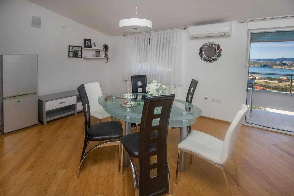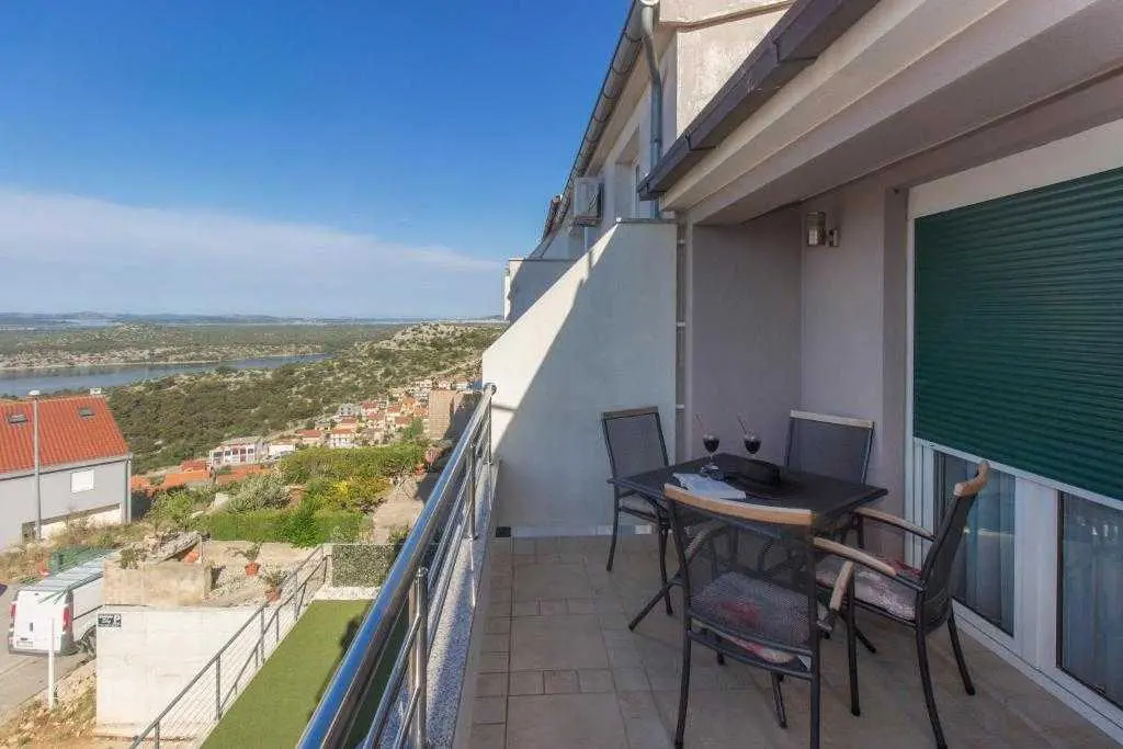 Dobro nam došli dragi gosti! Apartmani Divna s prekrasnim pogledom na šibenski kanal i otoke smješteni su na periferiji grada Šibenika, a ujedno nadomak su samog centra, svega 15-ak minuta pješice. Svakom gostu po dolasku nudi sa piće dobrodošlice, a za goste koji borave više od 5 dana u predsezoni/potsezoni jedno noćenje gratis. Grad Šibenik poznat je po blizini dva nacionalna parka Krka i Kornati, katedrali Sv. Jakova, međunarodnom dječjem festivalu,... Gradska plaža Banj udaljena je svega 5 minuta vožnje, a za ljubitelje wellnesa ili zabave hotelsko naselje Solaris nalazi se na 10 km udaljenosti. Brojni restorani i caffe barovi u gradu Šibeniku neizostavni su dio njegove bogate ponude. U kući se nalaze tri aprtmana te apartman u kojem žive domaćini. Apartman 1 nalazi se u prizemlju i ima prekrasan pogled na more. Sastoji se od kuhinje i blagovaonice, kupaonice, spavaće sobe s bračnim krevetom i pomoćnim ležajem, te velike terase i vrta. Apartmanu pripada i parkirno mjesto. U vrtu se nalazi roštilj koji je na raspolaganju svim gostima. Apartman je u potpunosti moderno uređen i opremljen te ima klima uređaj, bežični pristup Internetu, Tv, caffe aparat, sušilo za kosu,.. Studio apartman nalazi se na prvom katu i površine je 17 m2. Orijentiran je na sjevernu stranu i sastoji se od kuhinje s blagovaonicom koja se ujedno koristi kao spavaća soba s bračnim krevetom, te kupaonice. Apartmanu pripada i parkirno mjesto. Opremljen je Internetom, Tv, ventilatorom, caffe aparatom... Na prvom katu objekta s prekrasnim pogledom na more smjestio se apartman koji se sastoji od dvije spavaće sobe, kupaonice, kuhinje s blagovaonicom u kojoj se nalazi ležaj na razvlačenje za jednu osobu, balkona. Apartman je poptupno moderno opremljen/hladnjak s zamrzivačem, ploča za kuhanje, pećnica, klima uređaj, Tv, mikrovalna pećnica, kuhalo za kavu, perilica posuđa, ručnici, parkirno mjesto.../. U posebnoj prostoriji objekta nalazi se perilica rublja koja je dostupna svim gostima, kao i roštilj koji se nalazi u vrtu objekta. Na zahtjev i uz nadoplatu vršimo uslugu pripreme doručka, peglanja, prijevoza gostiju iz zračne luke,.. U cijenu usluge uračunato je parkirno mjesto, pristup Internet-u, boravišna pristojba, korištenje vrtnog roštilja, korištenje klima uređaja.