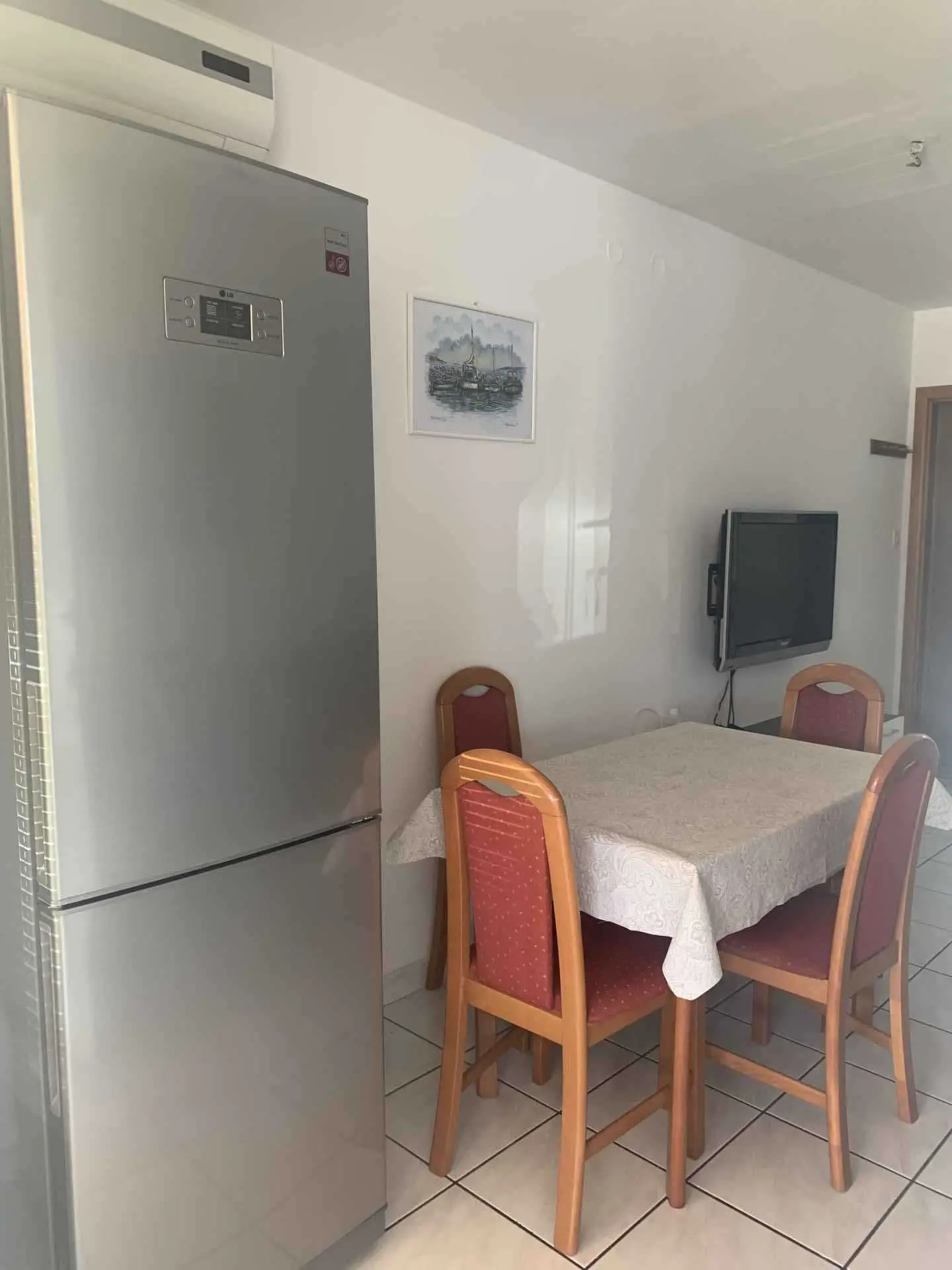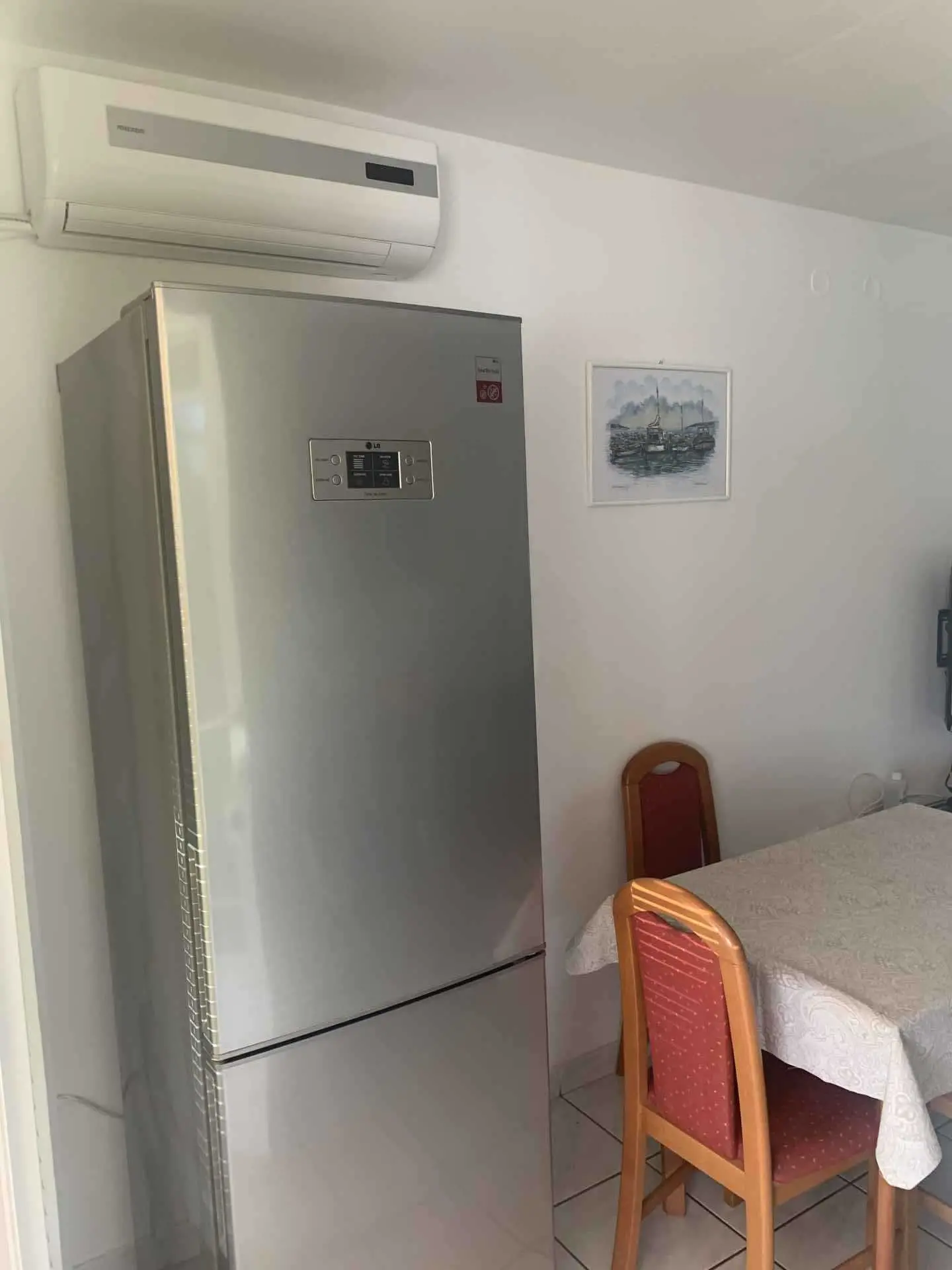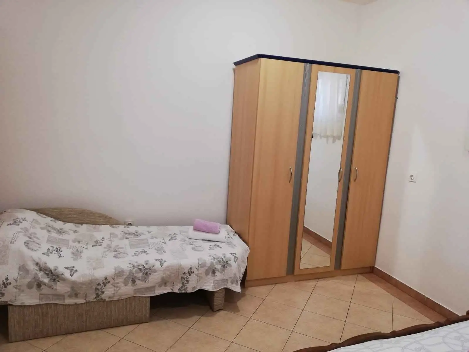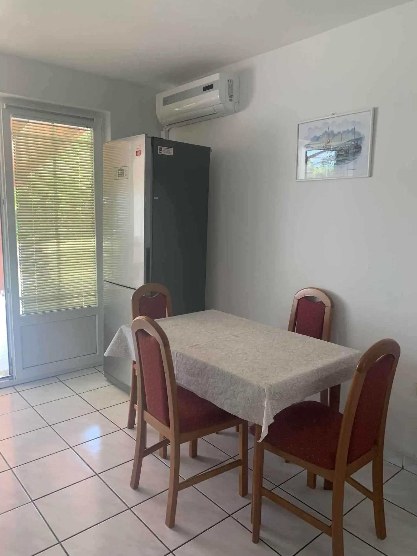 Jednosobni apartman u prizemlju kuce 45m2 s natkrivenom terasom od 15 m2, koji je udaljen od plaze samo 150 m. U sobi je bračni krevet i krevet za jednu osobu. Dnevni boravak ima kauč na razvlačenje. Opremljen je klimom, Sat-TV , vesmasinom. Kuhinja je kompletno opremljena , sa velikim frižiderima sa dubokim zamrzavanjem.