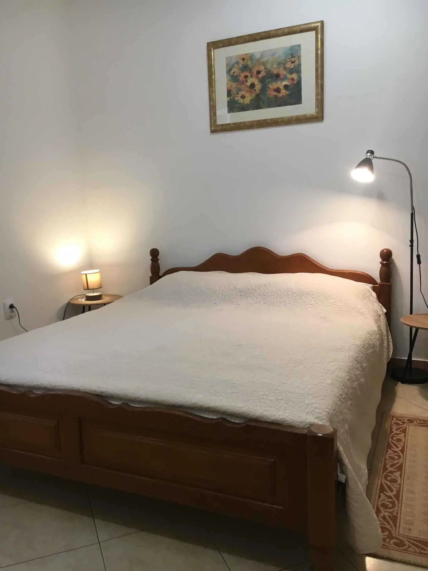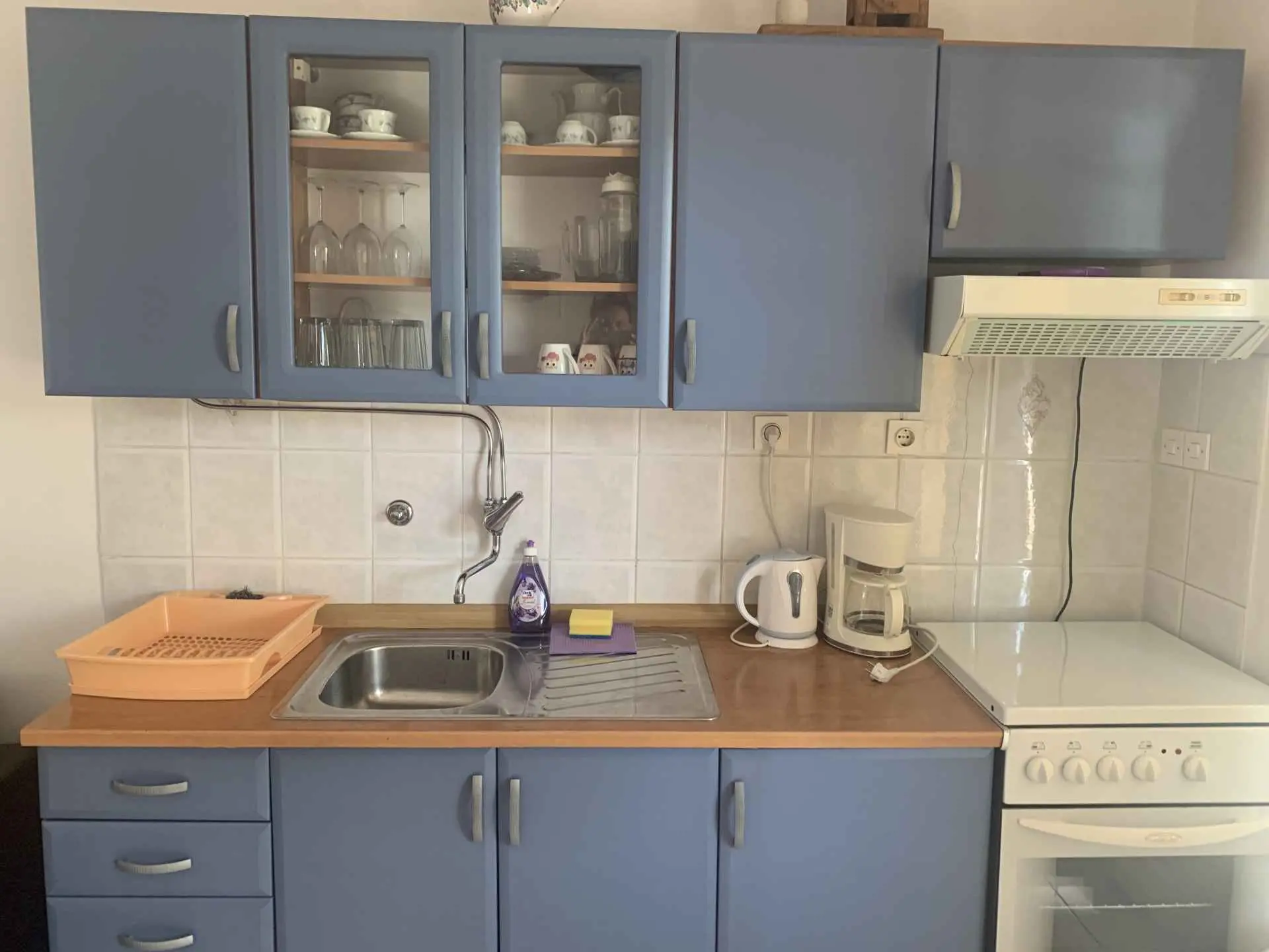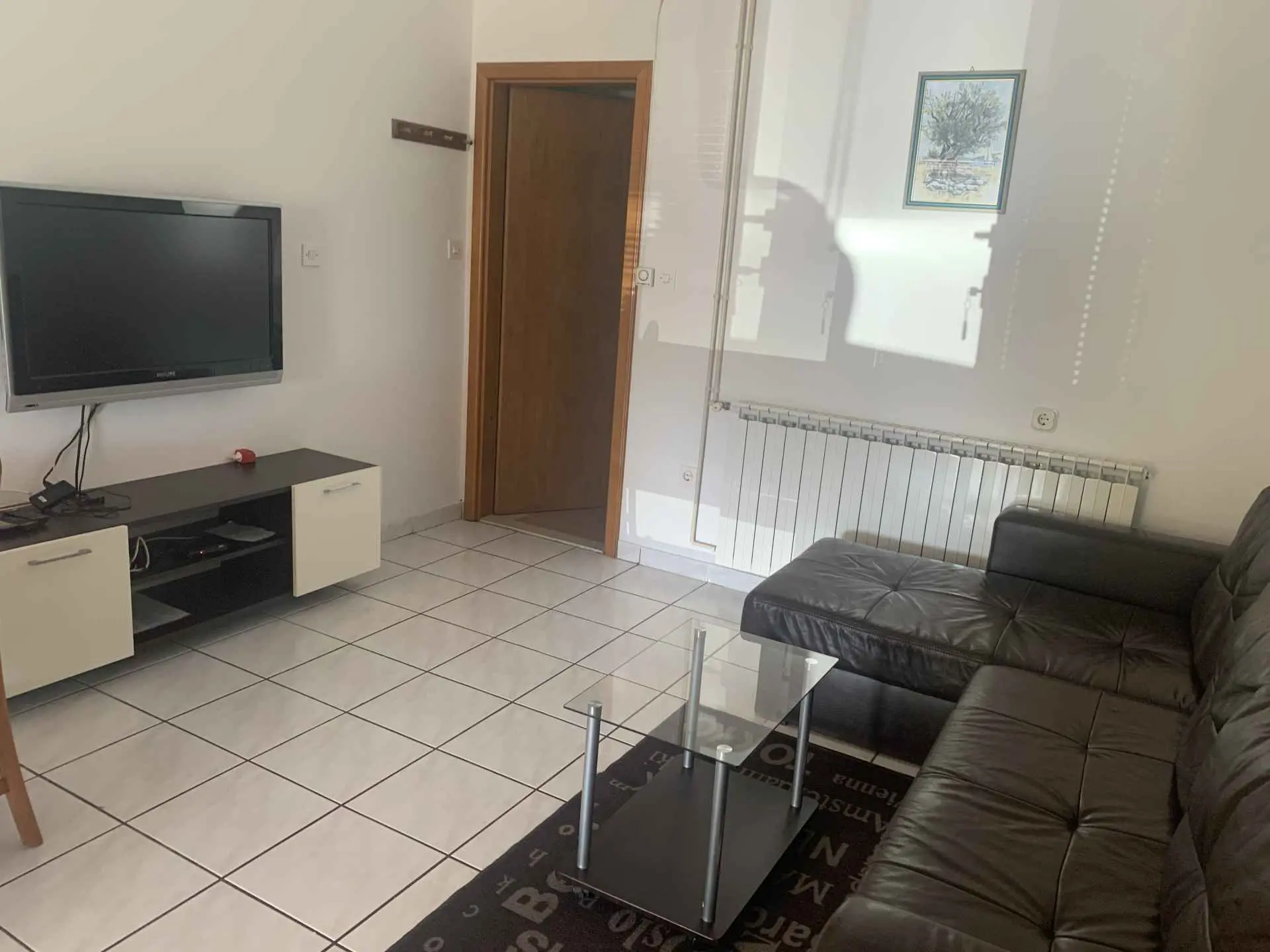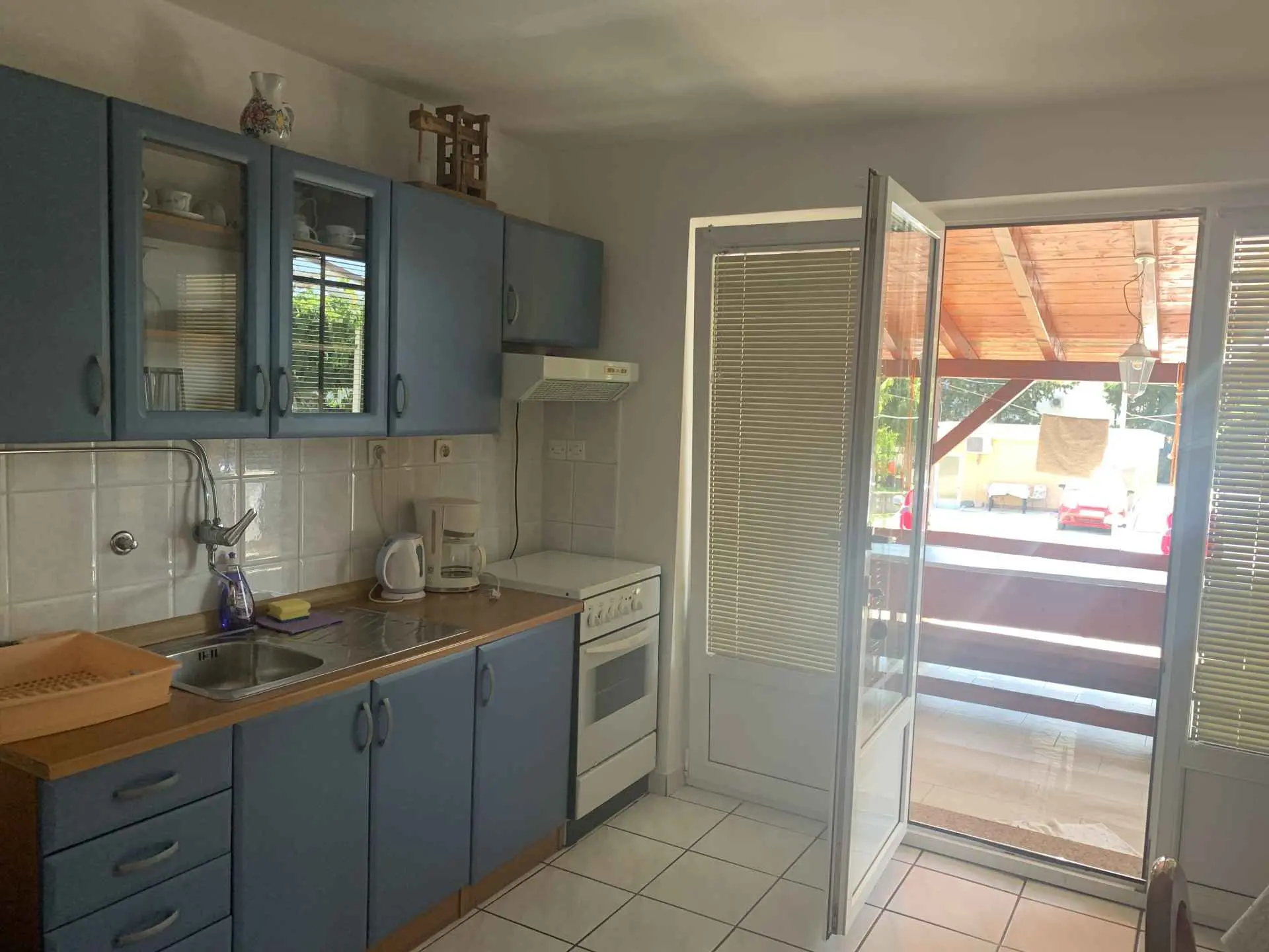 Jednosobni apartman u prizemlju kuce 45m2 s natkrivenom terasom od 15 m2, koji je udaljen od plaze samo 150 m. U sobi je bračni krevet i krevet za jednu osobu. Dnevni boravak ima kauč na razvlačenje. Opremljen je klimom, Sat-TV , vesmasinom. Kuhinja je kompletno opremljena , sa velikim frižiderima sa dubokim zamrzavanjem.