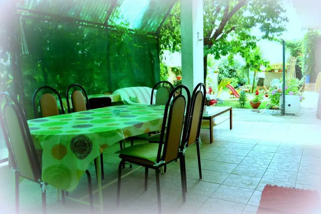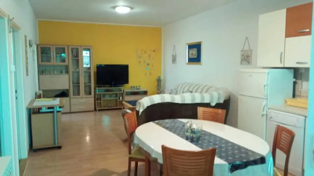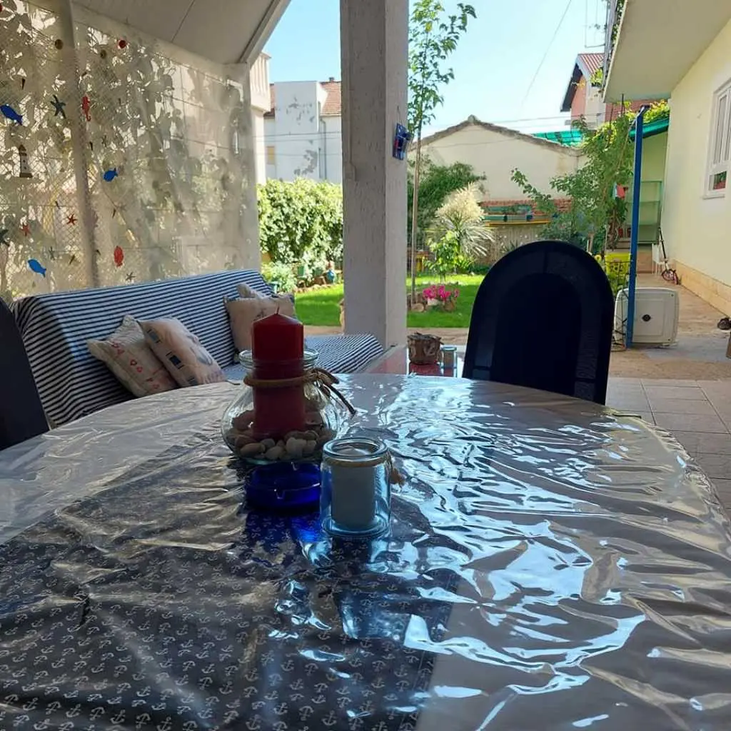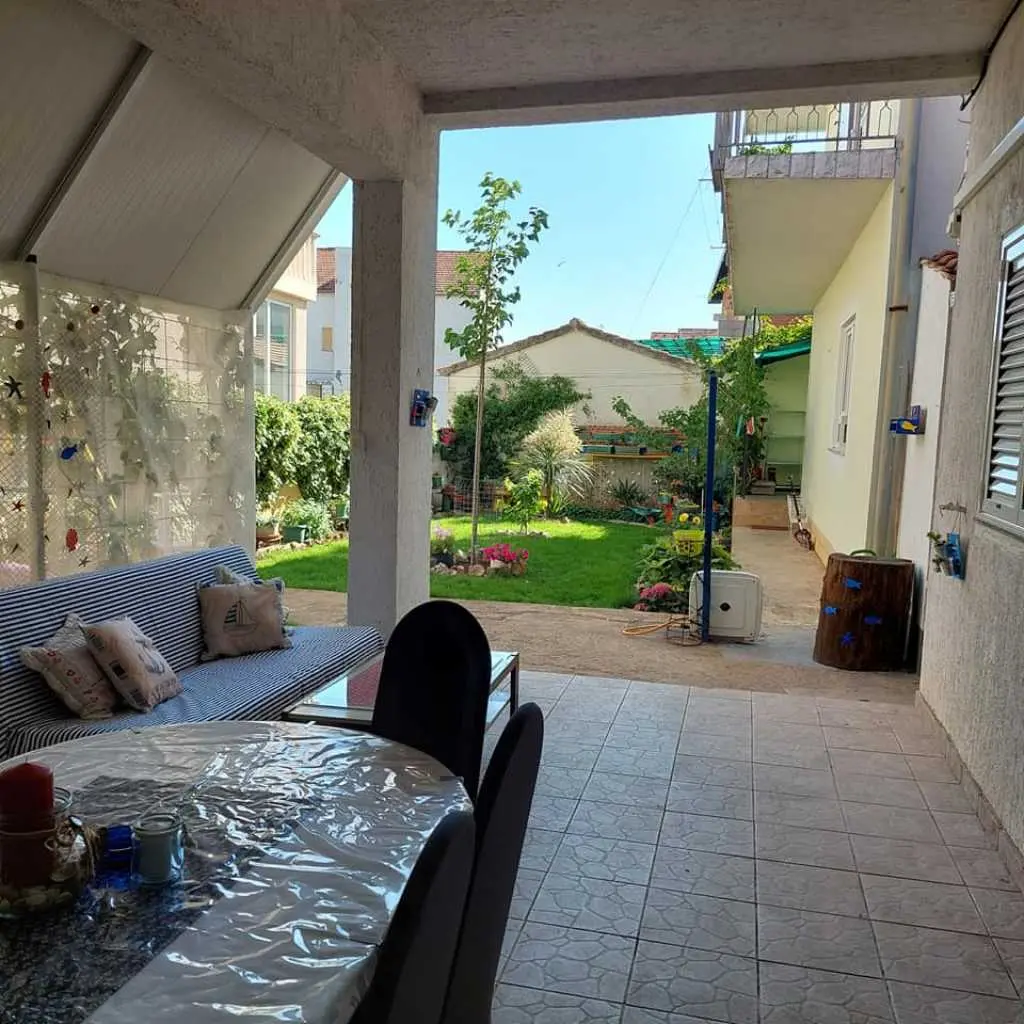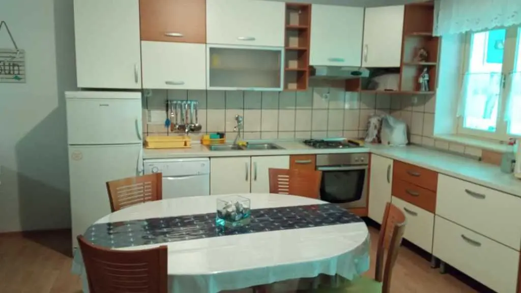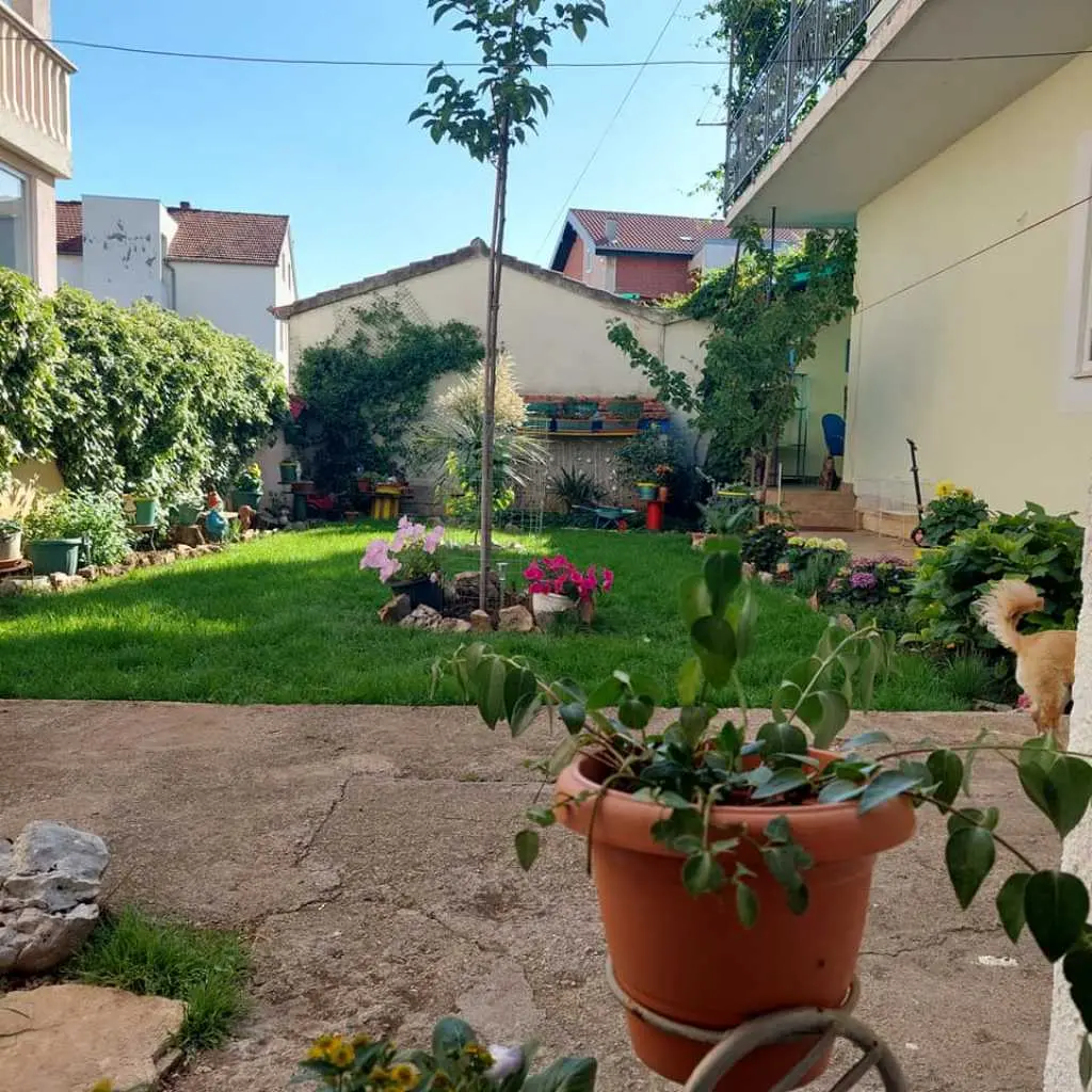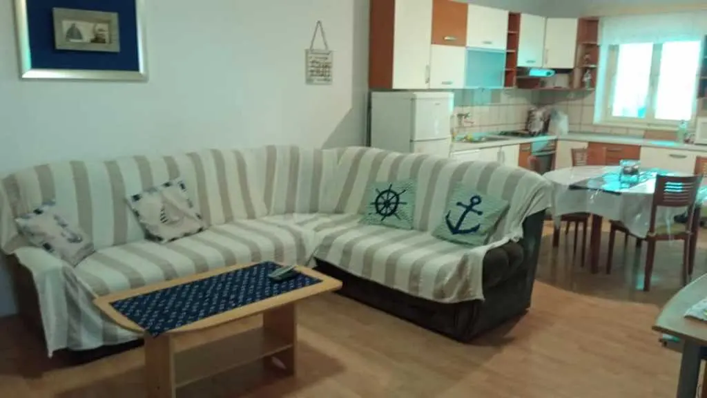 Vodice, komforni klimatizirani apartman 60m2 za 4, 5 ili 6 osoba, nalazi se u prizemlju i odvojen je od obiteljske kuće domaćina, ima svoj poseban ulaz, udaljen 300 m ili 5 min. hoda do plaže, potpuno opremljen (uključujući i perilicu posuđa, mikrovalnu pećnicu i aparat za kavu). Ima dvije spavaće sobe sa bračnim krevetima, blagavaonu, dnevni boravak (udobni kutni kauč na razvlačenje za spavanje još dvije odrasle osobe, TV, radio…), kuhinju, kupatilo . Ispred apartmana nalazi se velika vlastita natkrivena terasa 25 m2,okružena zelenilom na kojoj je također veliki stol sa stolicama za 6 osoba, kauč i mali stolić, a sve zaklonjeno od tuđih pogleda na kojoj imate svoju privatnost i svoj mir. Na terasi postoji i vanjska (dodatna) ljetna kuhinja (još jedan: frižider, sudoper, štednjak, rada površina) koju također možete koristiti. Pogled na ograđen i uređeni zeleni vrt. Apartman ima WI-FI internet i osiguran besplatan parking u dvorištu kuće tako da automobil možete ostaviti u dvorištu i komotno ići na plažu ili u centar mjesta pješice čime izbjegavate dodatno plaćanje parkinga na plažama i u centru. Apartman se nalazi u ulici Ante Lasan Kabalera, najljepšem kvartu grada Vodice, 5 minuta hoda, mirnim, ne baš prometnim uličicama, do najljepših plaža (Hangar), do prve trgovine i pekare samo 1 minut hoda, do supermarketa 5-6 minuta hoda, centra 10 min laganog hoda… Ispred terase je i grill raspoloživ za korištenje gostima. Domaćini su gostoljubivi tihi i nenametljivi ljudi koji su Vam na raspolaganju na Vaše upite o bilo kakvoj korisnoj informaciji o najpovoljnijim ponudama grada Vodice i okolice. Kućni ljubimci dobrodošli. Vodice vam pružaju čisto more, prekrasne sadržajne plaže, bogatu gastronomsku ponudu, mnoštvo kafe-barova, disco-clubova, suvenirnica…tu će te pronaći sve što je potrebno za Vaš odmor, bilo miran kutak i odmor uz more, bilo aktivan život. U blizini Vodica nalaze se čak dva nacionalna parka Krka i Kornati. Cijena se kreće od 50-90 eura/noć, ovisno o terminu, broju osoba i ostalim okolnostima. U cijenu uključeno korištenje klimatizacije, boravišna turistička taksa, parking, wi-fi Internet