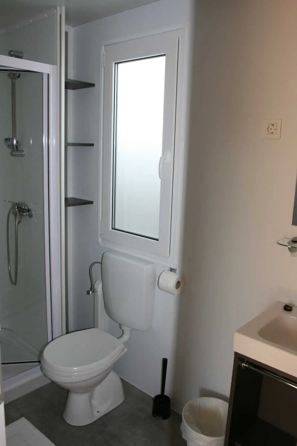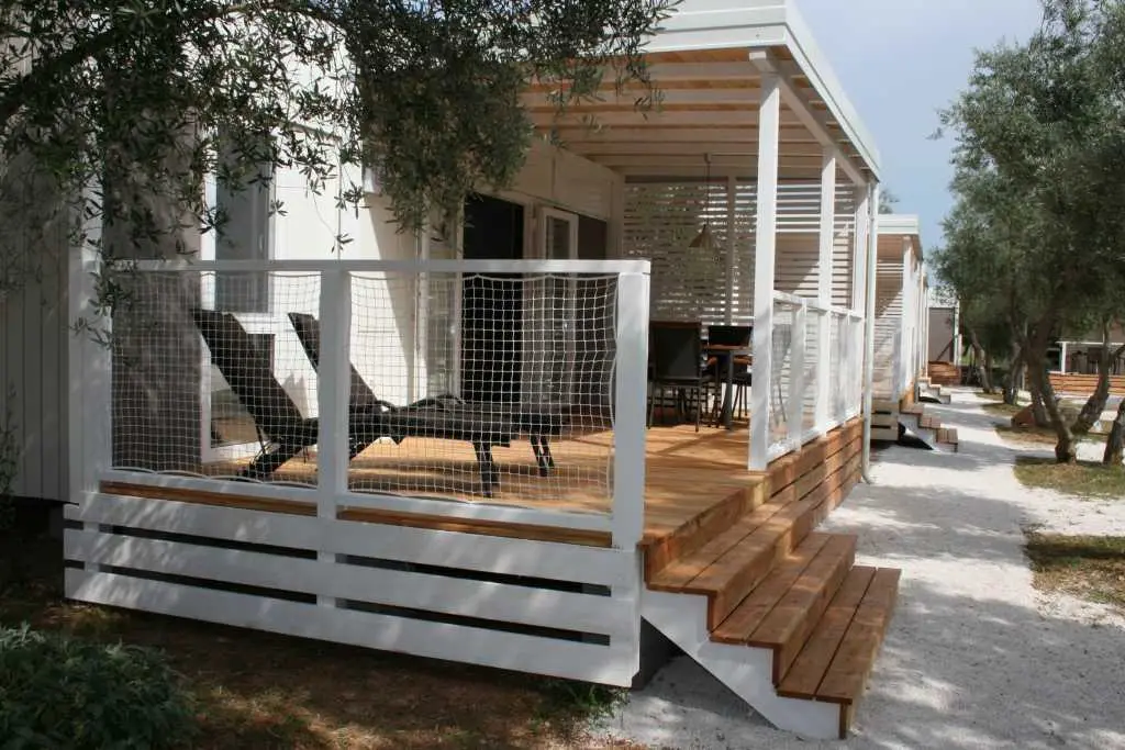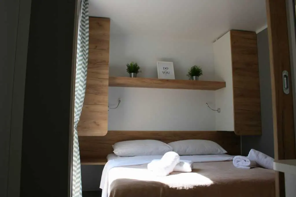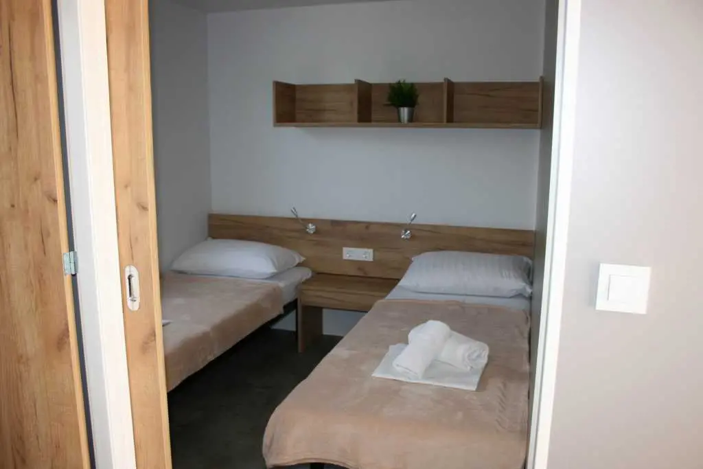 Iznajmljujemo luksuzne mobilne kućice. Unutar 32 m2 nalaze se dvije spavaće sobe (jedna sa bračnim krevetom, druga sa dva odvojena kreveta), dvije kupaonice sa tuš kadom, kuhinja i dnevni boravak + terasa 24 m2. Kućica može primiti 4 osobe + 2 osobe na pomoćnom ležaju u dnevnom boravku. Kuhinja je opremljena pločom za kuhanje, sudoperom, napom, hladnjakom, posuđem za kuhanje i serviranje, priborom za jelo i piće. U predjelu dnevnog boravka nalazi se LCD TV i klima uređaj. Na svim prozorima nalaze se zaštitne mreže protiv komaraca. Posteljina i ručnici za svaki ležaj su uključeni u cijenu. Terasa je veličine 24 m2 i natkrivena je, te ima stol i stolice za 6 osoba i 2 ležaljke. Udaljenost od mora je 150 m. Udaljenost od ulaza u nacionalni park Paklenica je 800 m. Parkirno mjesto je osigurano i besplatno. Depozit na dan dolaska: 100,00 € Završno čišćenje: 35,00 € Boravišna pristojba nije uključena u cijenu i naplaćuje se na recepciji kampa. PDV uključen u cijene KUĆNI LJUBIMCI NISU DOPUŠTENI PUŠENJE U MOBILNIM KUĆICAMA JE ZABRANJENO, DOZVOLJENO JE NA TERASI