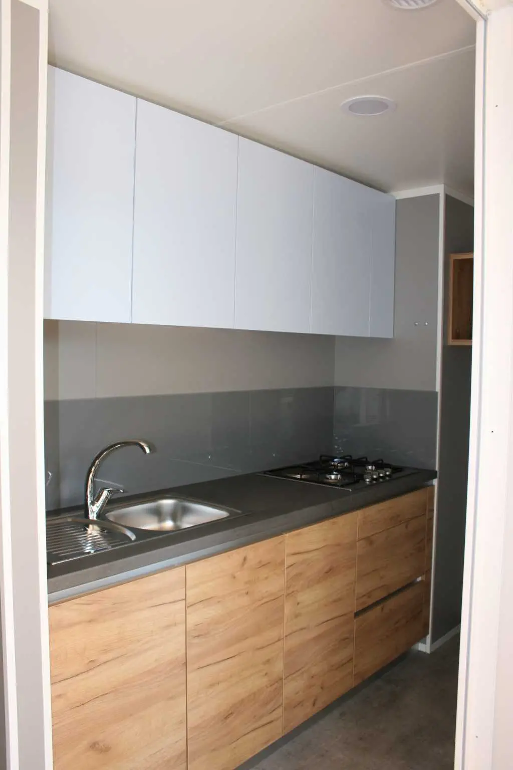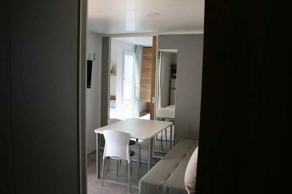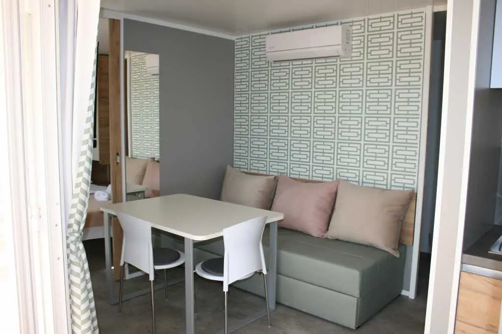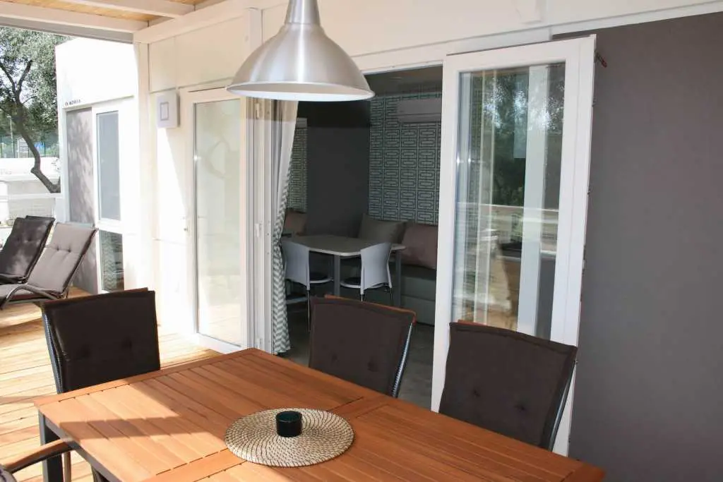 Kućica je održavanja, čista i ima veliku terasu na kojoj smo bili i kad je padala kiša. Vlasnici su jako ljubazni i uvijek na usluzi. Plaža je šljunčana i udaljena samo par minuta hoda. Veliki supermarket pored kampa, na sve odlično! Dolazimo ponovo iduće godine.