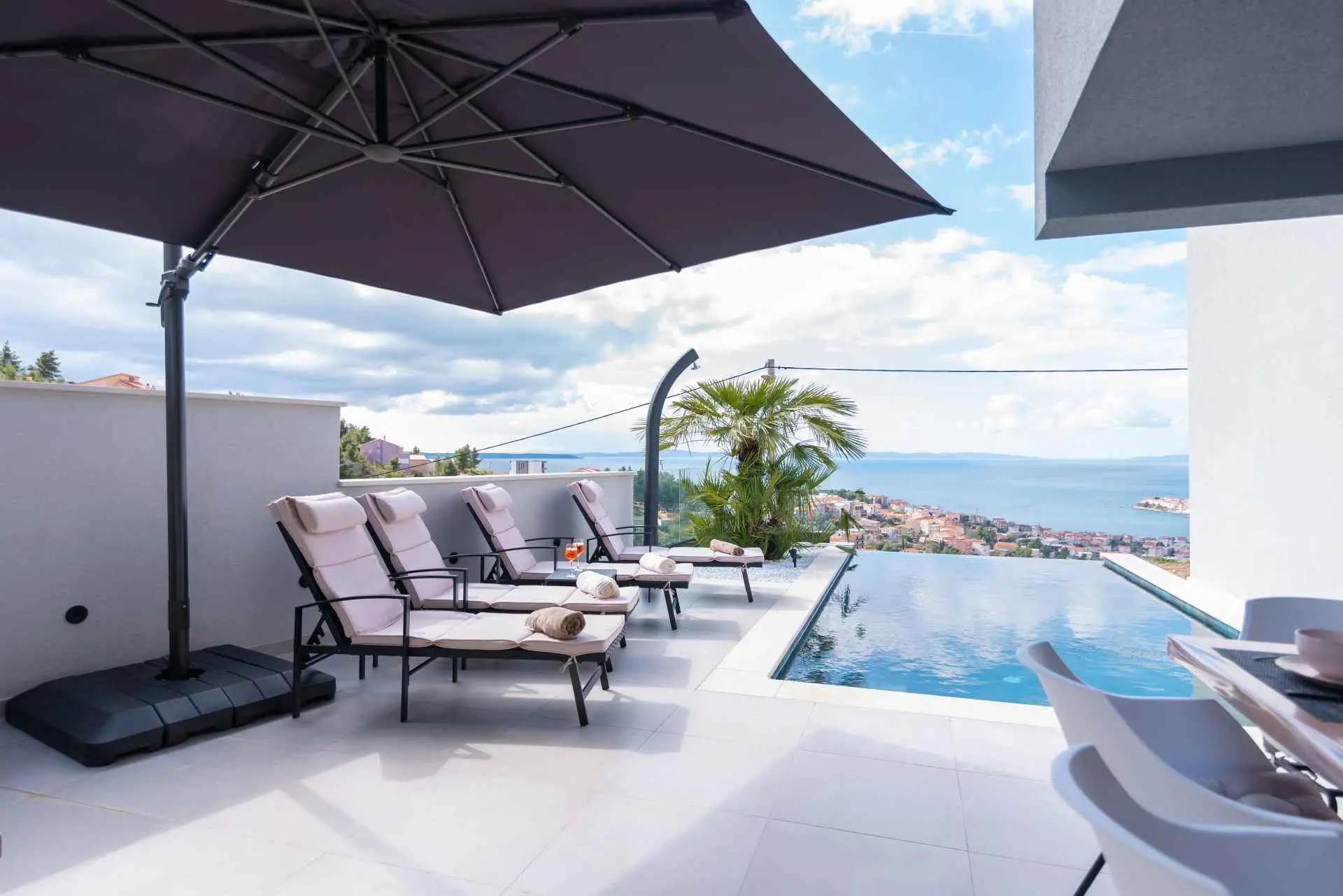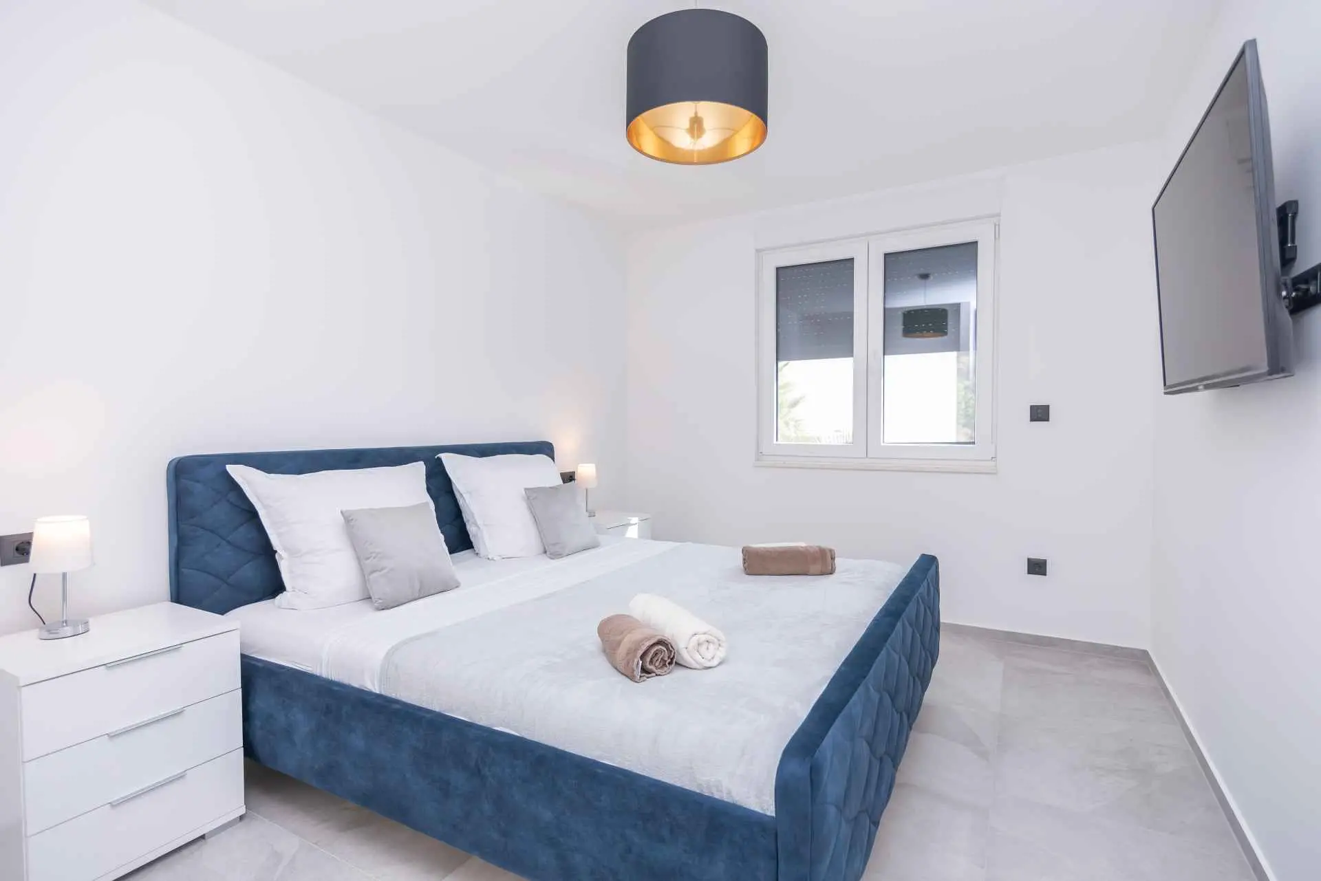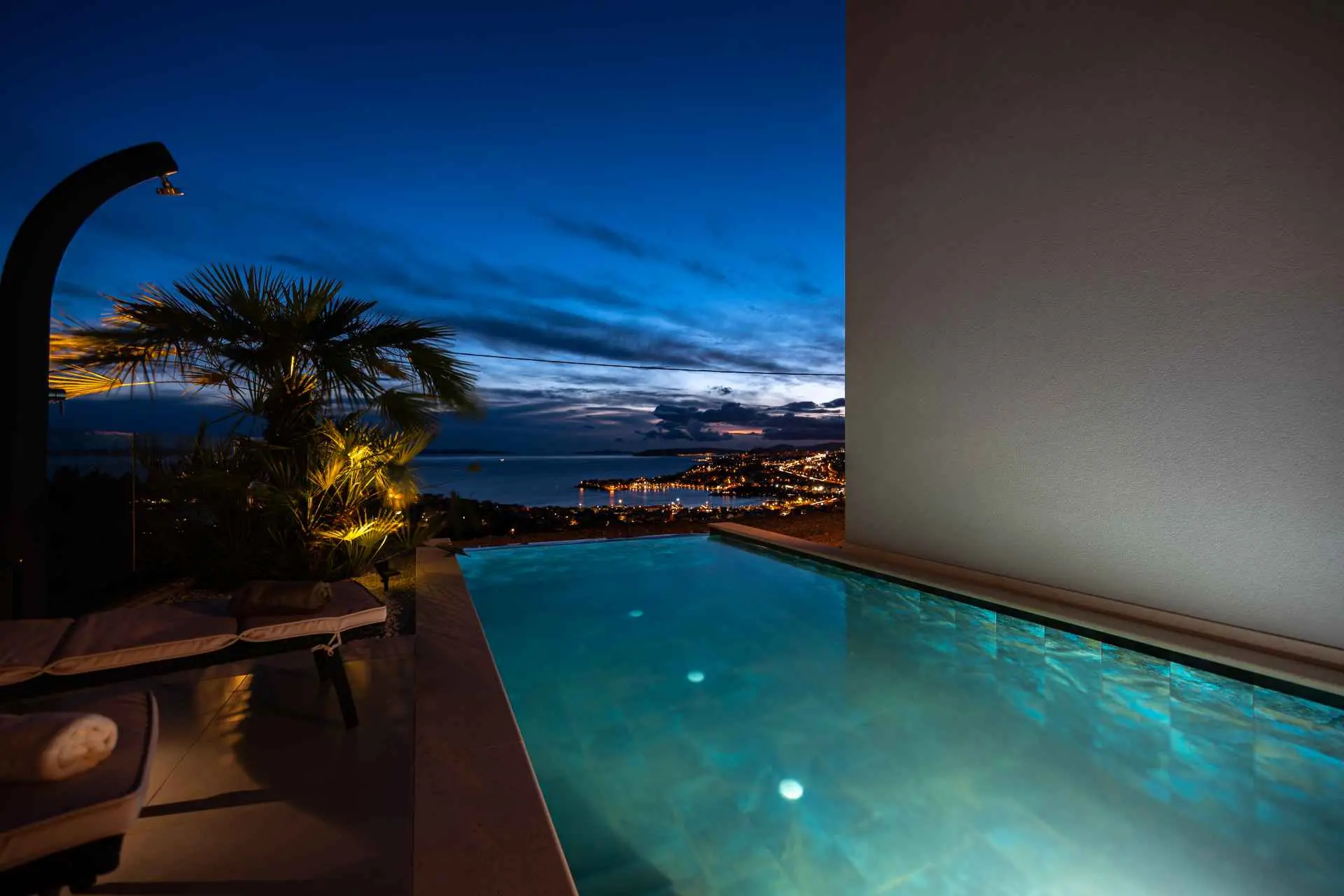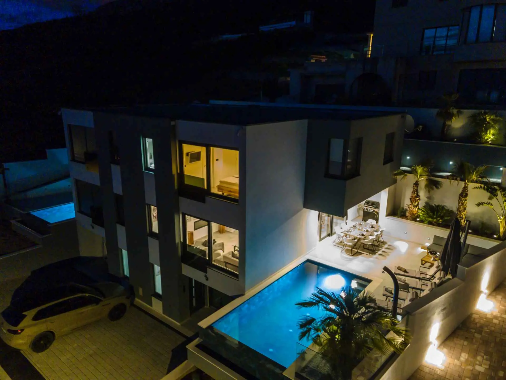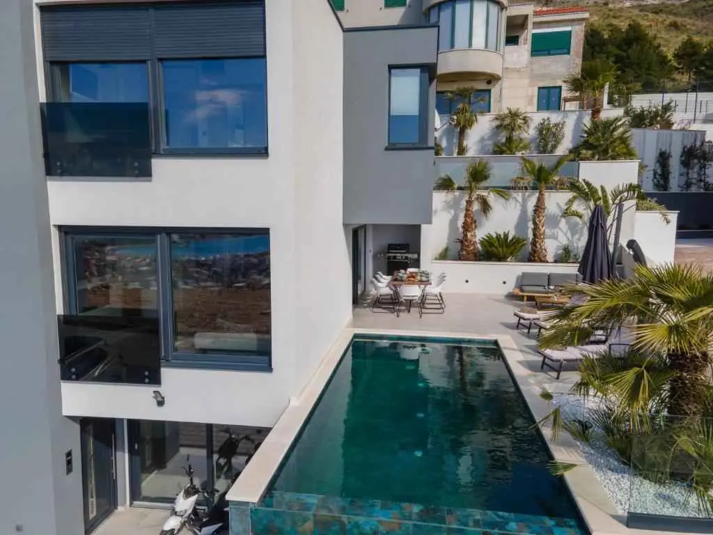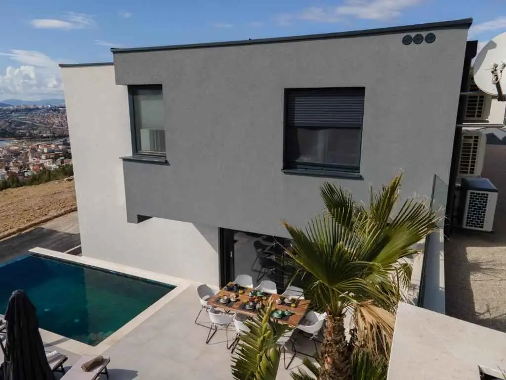 Dobrodošli u našu potpuno novu vilu Blue Horizon, koja se nalazi na vrhu mirnog brežuljka s kojeg se pruža pogled na obližnji grad Split, more i otoke. Vila se nalazi na vrhu brežuljka, okružena borovom šumom i s pogledom na najljepši dio cijele srednje Dalmacije. Vila ima veliki grijani bazen koji je okružen keramičkim popločanim dvorištem na kojem se nalazi roštilj, stol sa stolicama ispod velikog suncobrana, vanjski tuš, prostor za odmor i ležaljke. S terase ulazite na prvi kat koji se sastoji od nevjerojatne kuhinje koja ima sve što vam je potrebno, prostora za sjedenje s visokim stolicama i kuhinjskog otoka. Tu je veliki blagovaonski stol za 8 osoba za kojim možete sjediti, jesti i uživati, a pored njega je veliki kauč s pogledom na smart TV sa zvučnim sustavom gdje možete uživati u filmovima i serijama po izboru. Na drugom katu nalaze se 3 spavaće sobe, sve s velikim bračnim krevetima. Svaka spavaća soba ima vlastitu kupaonicu s podnim grijanjem i vlastitim sustavom grijanja vode. Iz glavne spavaće sobe izlazi se na veliku terasu od nekih 30^m na kojoj se možete opustiti u potpunoj privatnosti od ostatka prijatelja u kući :) U prizemlju se nalazi još jedna spavaća soba sa vlastitom kupaonicom, plus tu je PS4 i TV gdje djeca i odrasli mogu igrati igrice koje nudimo ili mogu donijeti svoje :) Ispred vile nalazi se besplatno privatno parkiralište za 2 automobila i više besplatnih parkirnih mjesta na javnom besplatnom parkiralištu nasuprot ulaza u vilu. Prva plaža udaljena je 7 minuta vožnje automobilom, a centar Strožanca s caffe barovima, restoranima i trgovinom udaljen je 5 minuta. Centar grada Splita udaljen je 20 minuta vožnje automobilom :)