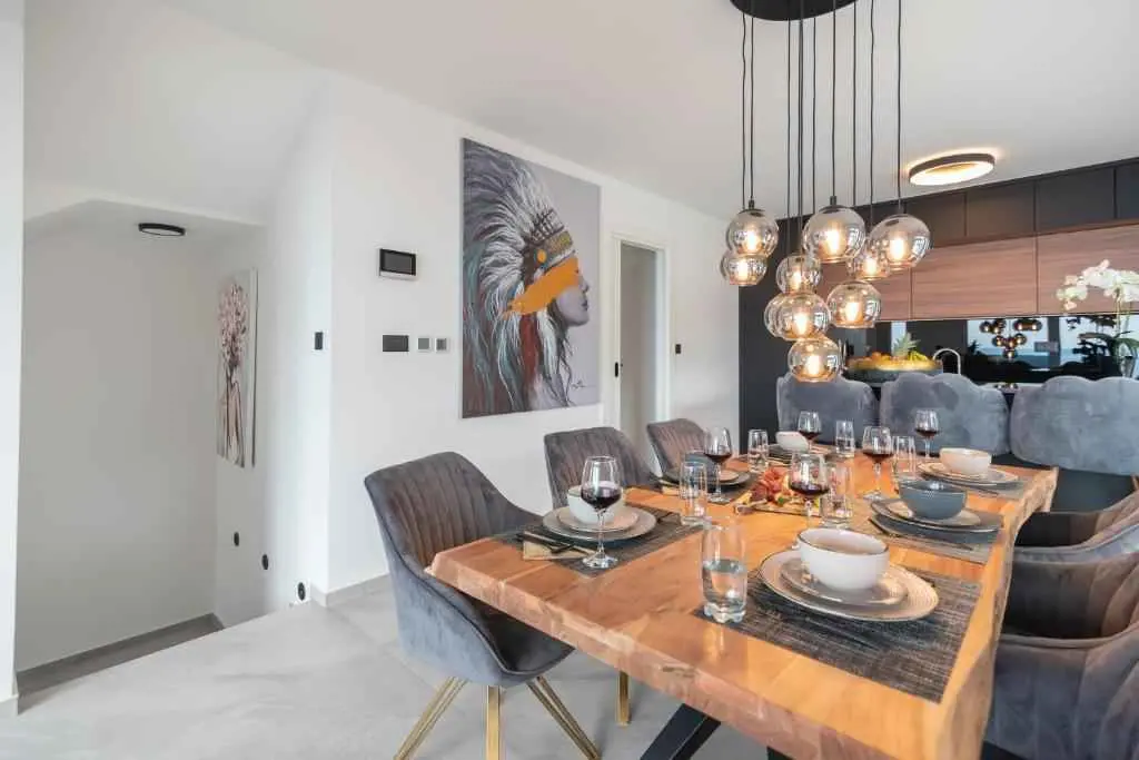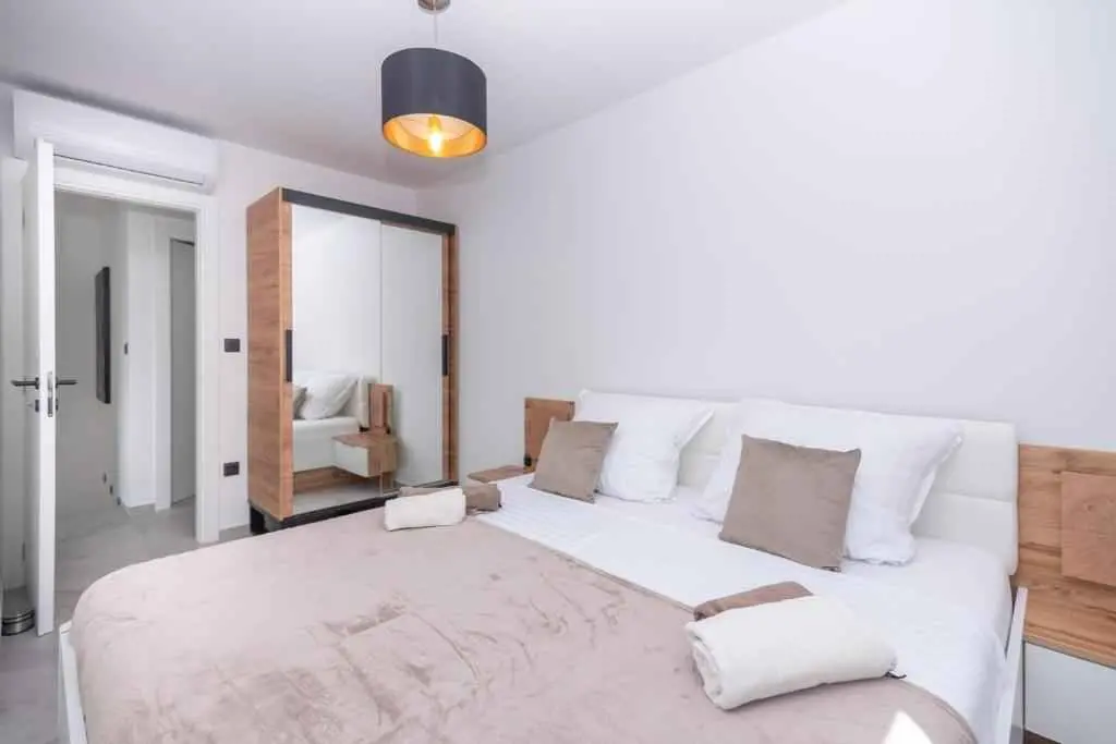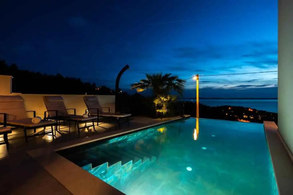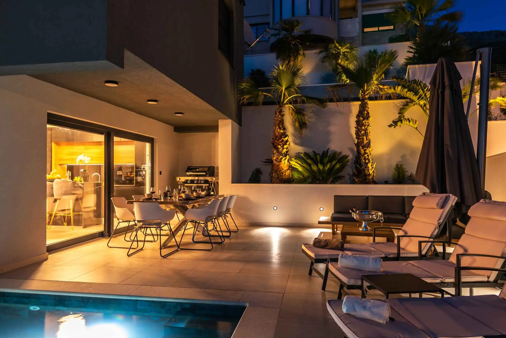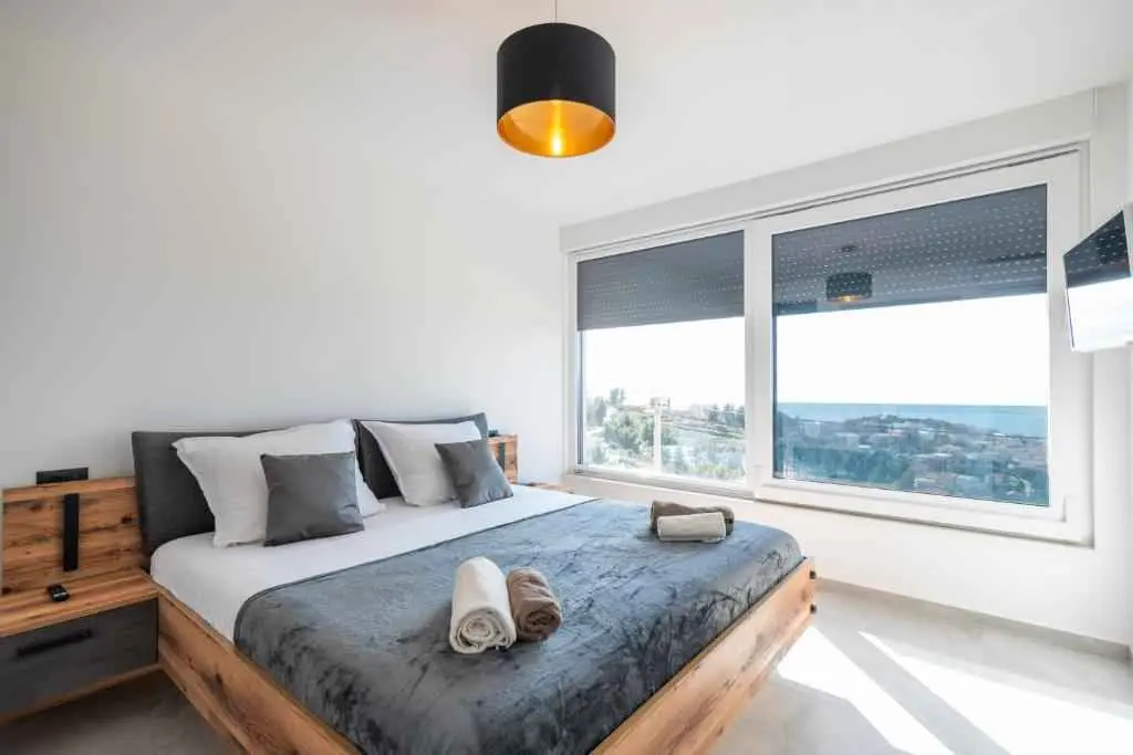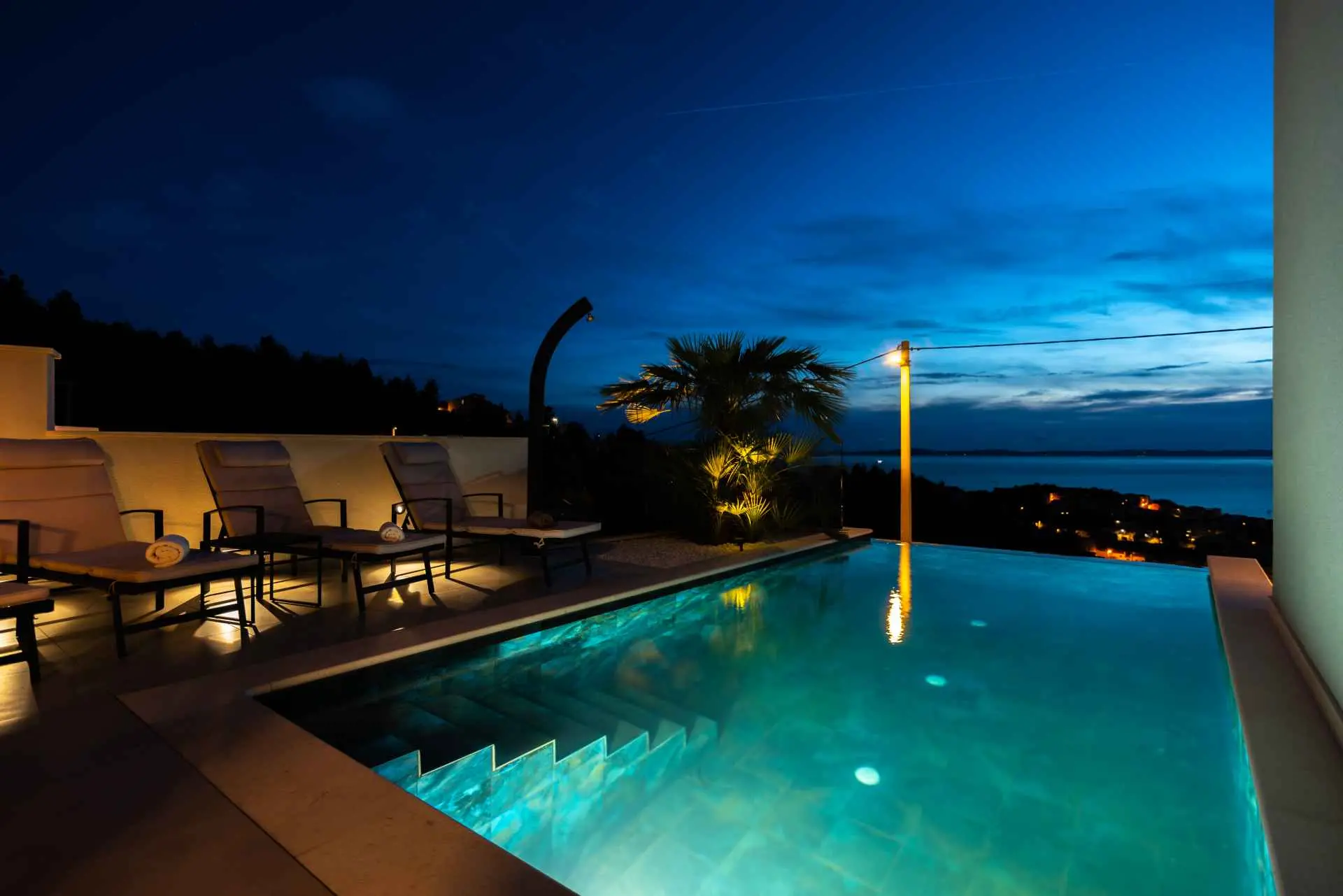Dobrodošli u našu potpuno novu vilu Blue Horizon, koja se nalazi na vrhu mirnog brežuljka s kojeg se pruža pogled na obližnji grad Split, more i otoke. Vila se nalazi na vrhu brežuljka, okružena borovom šumom i s pogledom na najljepši dio cijele srednje Dalmacije. Vila ima veliki grijani bazen koji je okružen keramičkim popločanim dvorištem na kojem se nalazi roštilj, stol sa stolicama ispod velikog suncobrana, vanjski tuš, prostor za odmor i ležaljke. S terase ulazite na prvi kat koji se sastoji od nevjerojatne kuhinje koja ima sve što vam je potrebno, prostora za sjedenje s visokim stolicama i kuhinjskog otoka. Tu je veliki blagovaonski stol za 8 osoba za kojim možete sjediti, jesti i uživati, a pored njega je veliki kauč s pogledom na smart TV sa zvučnim sustavom gdje možete uživati u filmovima i serijama po izboru. Na drugom katu nalaze se 3 spavaće sobe, sve s velikim bračnim krevetima. Svaka spavaća soba ima vlastitu kupaonicu s podnim grijanjem i vlastitim sustavom grijanja vode. Iz glavne spavaće sobe izlazi se na veliku terasu od nekih 30^m na kojoj se možete opustiti u potpunoj privatnosti od ostatka prijatelja u kući :) U prizemlju se nalazi još jedna spavaća soba sa vlastitom kupaonicom, plus tu je PS4 i TV gdje djeca i odrasli mogu igrati igrice koje nudimo ili mogu donijeti svoje :) Ispred vile nalazi se besplatno privatno parkiralište za 2 automobila i više besplatnih parkirnih mjesta na javnom besplatnom parkiralištu nasuprot ulaza u vilu. Prva plaža udaljena je 7 minuta vožnje automobilom, a centar Strožanca s caffe barovima, restoranima i trgovinom udaljen je 5 minuta. Centar grada Splita udaljen je 20 minuta vožnje automobilom :)