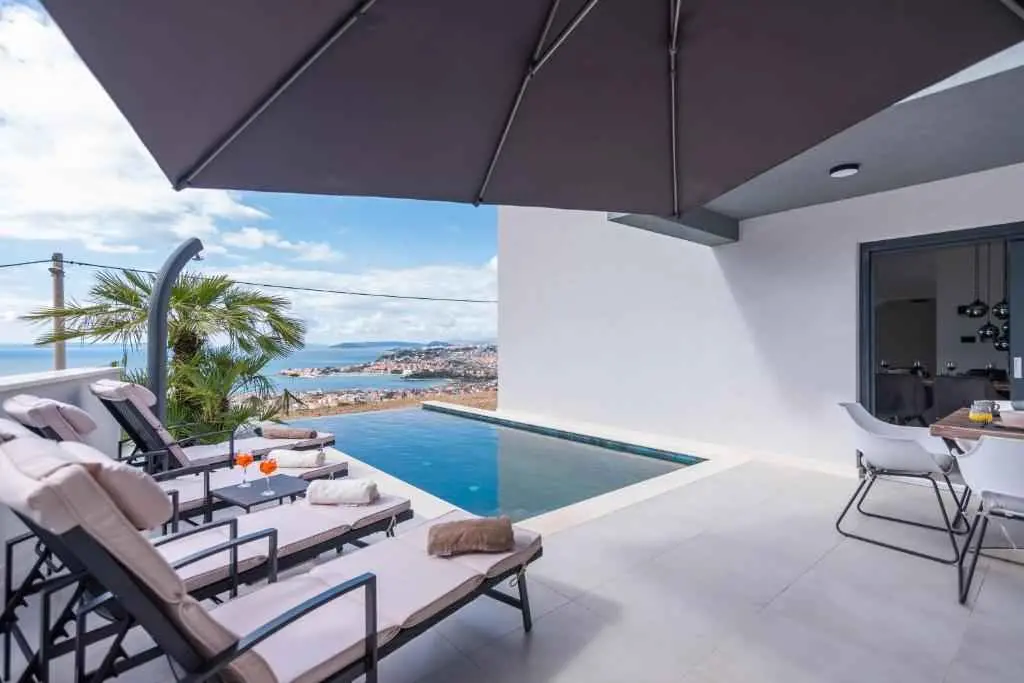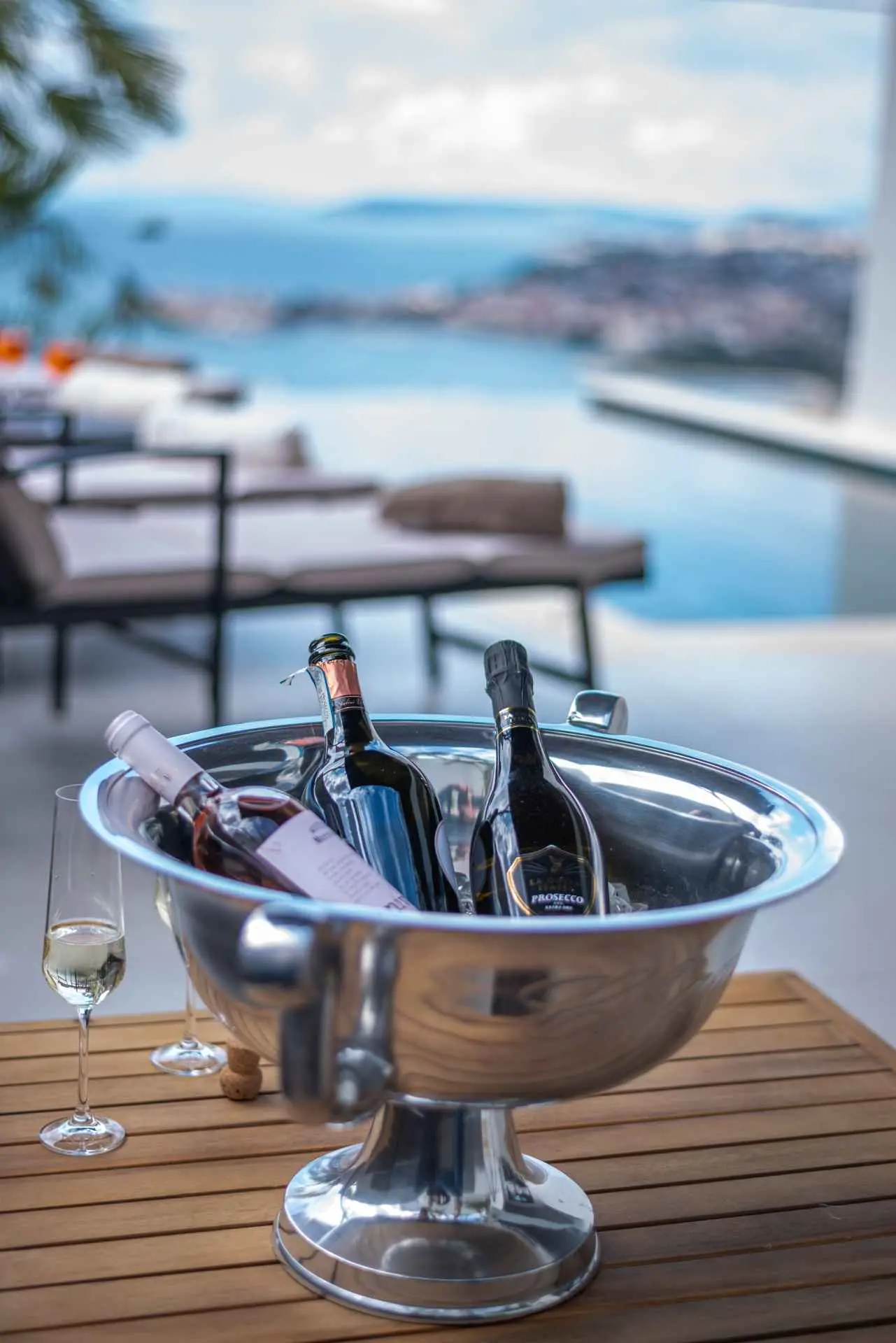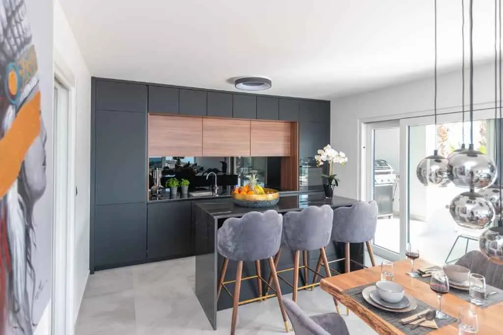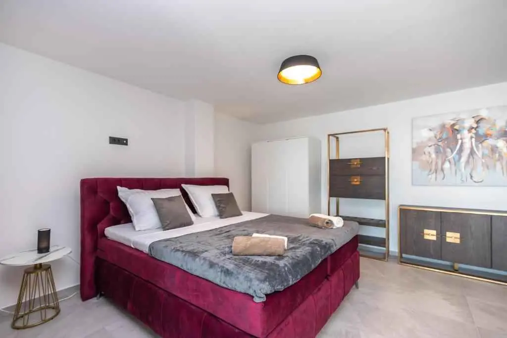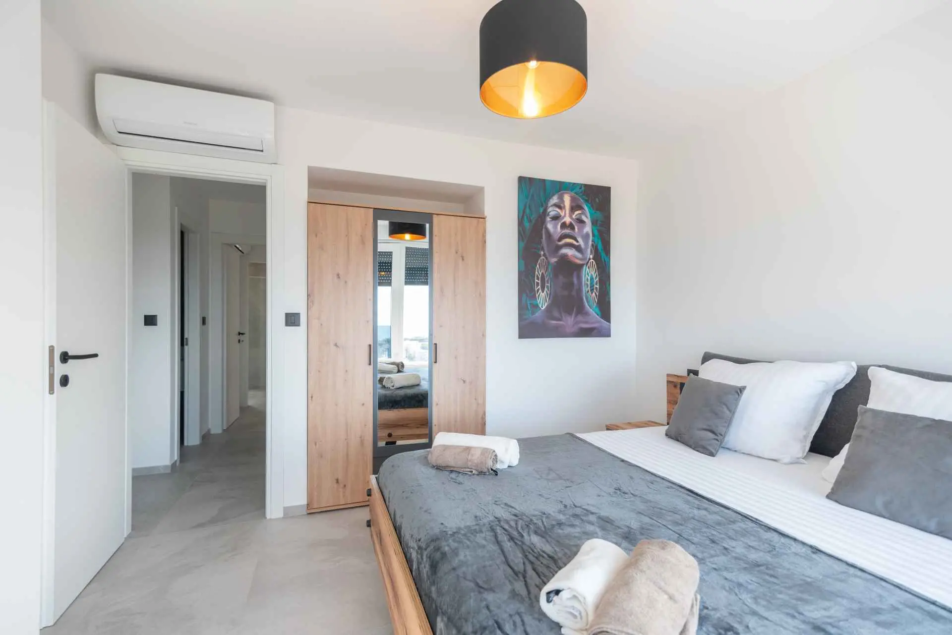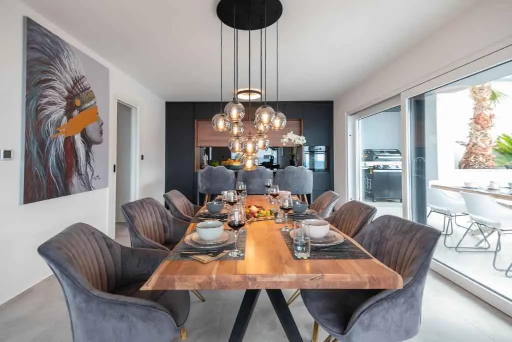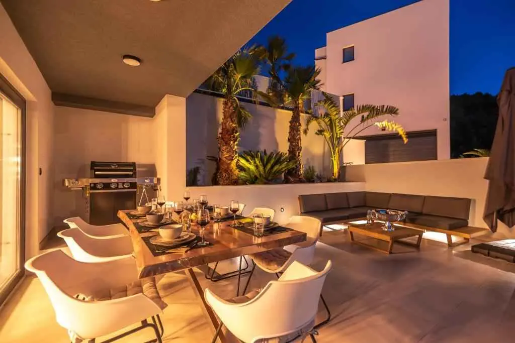 Dobrodošli u našu potpuno novu vilu Blue Horizon, koja se nalazi na vrhu mirnog brežuljka s kojeg se pruža pogled na obližnji grad Split, more i otoke. Vila se nalazi na vrhu brežuljka, okružena borovom šumom i s pogledom na najljepši dio cijele srednje Dalmacije. Vila ima veliki grijani bazen koji je okružen keramičkim popločanim dvorištem na kojem se nalazi roštilj, stol sa stolicama ispod velikog suncobrana, vanjski tuš, prostor za odmor i ležaljke. S terase ulazite na prvi kat koji se sastoji od nevjerojatne kuhinje koja ima sve što vam je potrebno, prostora za sjedenje s visokim stolicama i kuhinjskog otoka. Tu je veliki blagovaonski stol za 8 osoba za kojim možete sjediti, jesti i uživati, a pored njega je veliki kauč s pogledom na smart TV sa zvučnim sustavom gdje možete uživati u filmovima i serijama po izboru. Na drugom katu nalaze se 3 spavaće sobe, sve s velikim bračnim krevetima. Svaka spavaća soba ima vlastitu kupaonicu s podnim grijanjem i vlastitim sustavom grijanja vode. Iz glavne spavaće sobe izlazi se na veliku terasu od nekih 30^m na kojoj se možete opustiti u potpunoj privatnosti od ostatka prijatelja u kući :) U prizemlju se nalazi još jedna spavaća soba sa vlastitom kupaonicom, plus tu je PS4 i TV gdje djeca i odrasli mogu igrati igrice koje nudimo ili mogu donijeti svoje :) Ispred vile nalazi se besplatno privatno parkiralište za 2 automobila i više besplatnih parkirnih mjesta na javnom besplatnom parkiralištu nasuprot ulaza u vilu. Prva plaža udaljena je 7 minuta vožnje automobilom, a centar Strožanca s caffe barovima, restoranima i trgovinom udaljen je 5 minuta. Centar grada Splita udaljen je 20 minuta vožnje automobilom :)