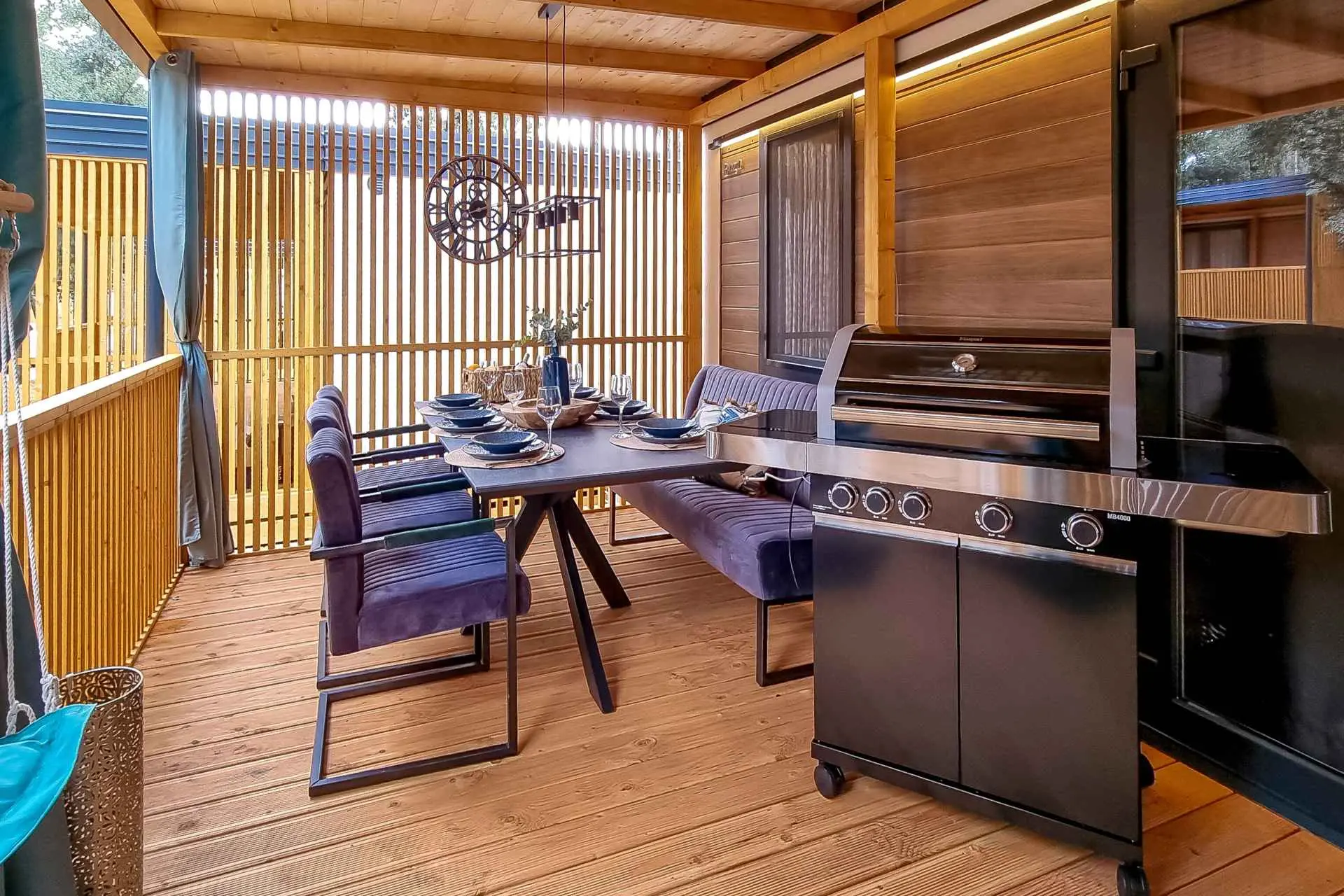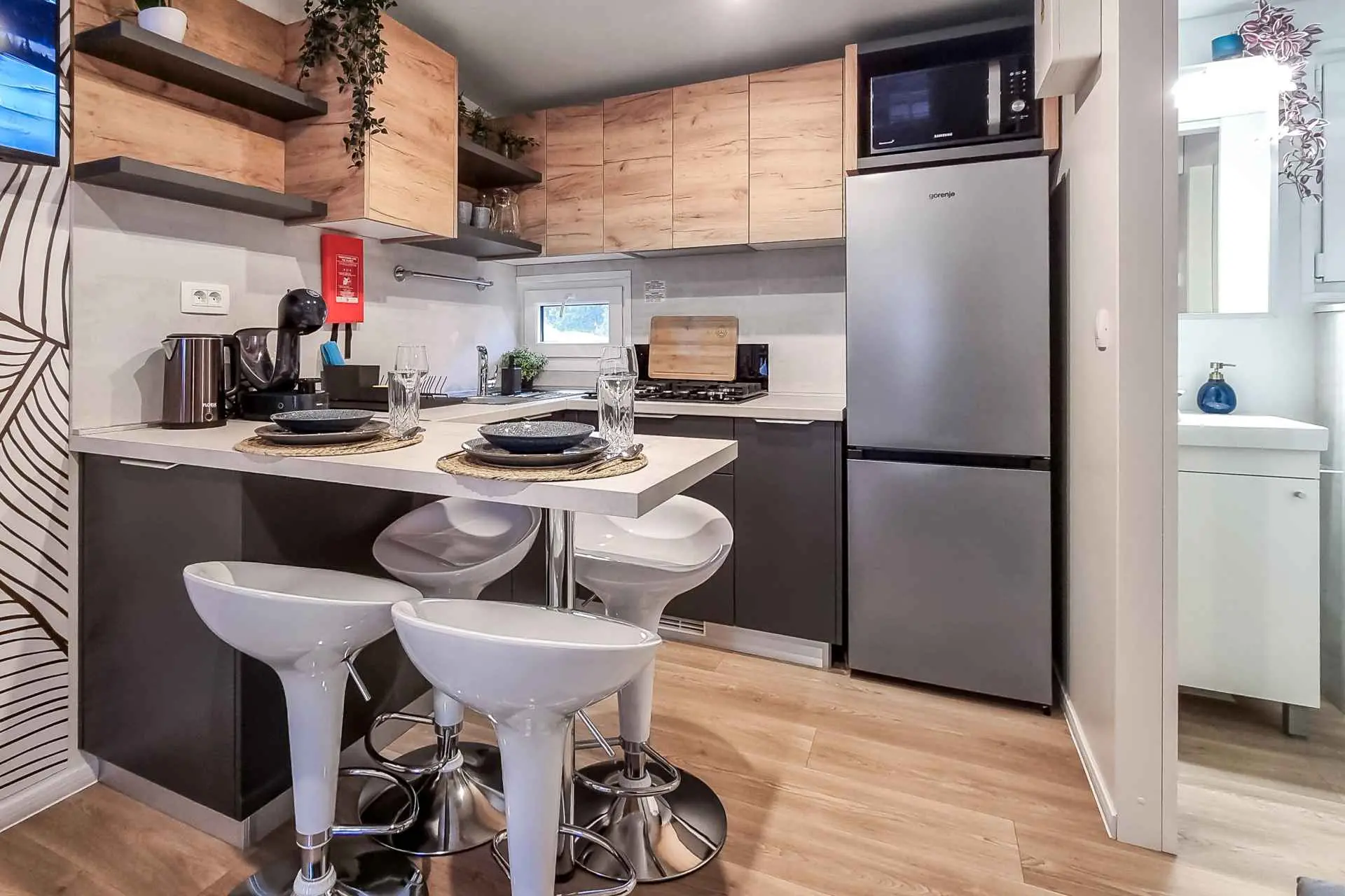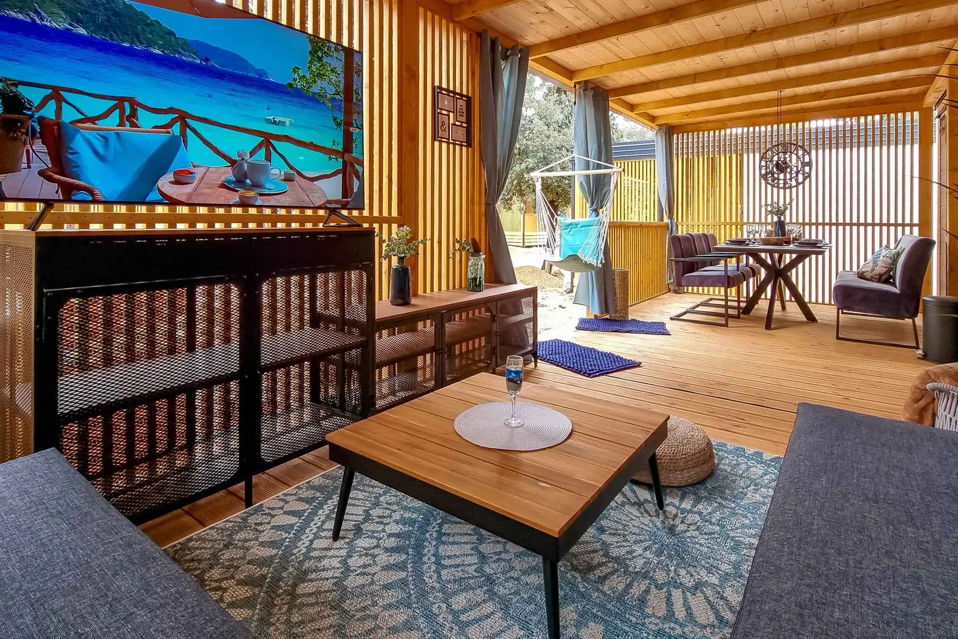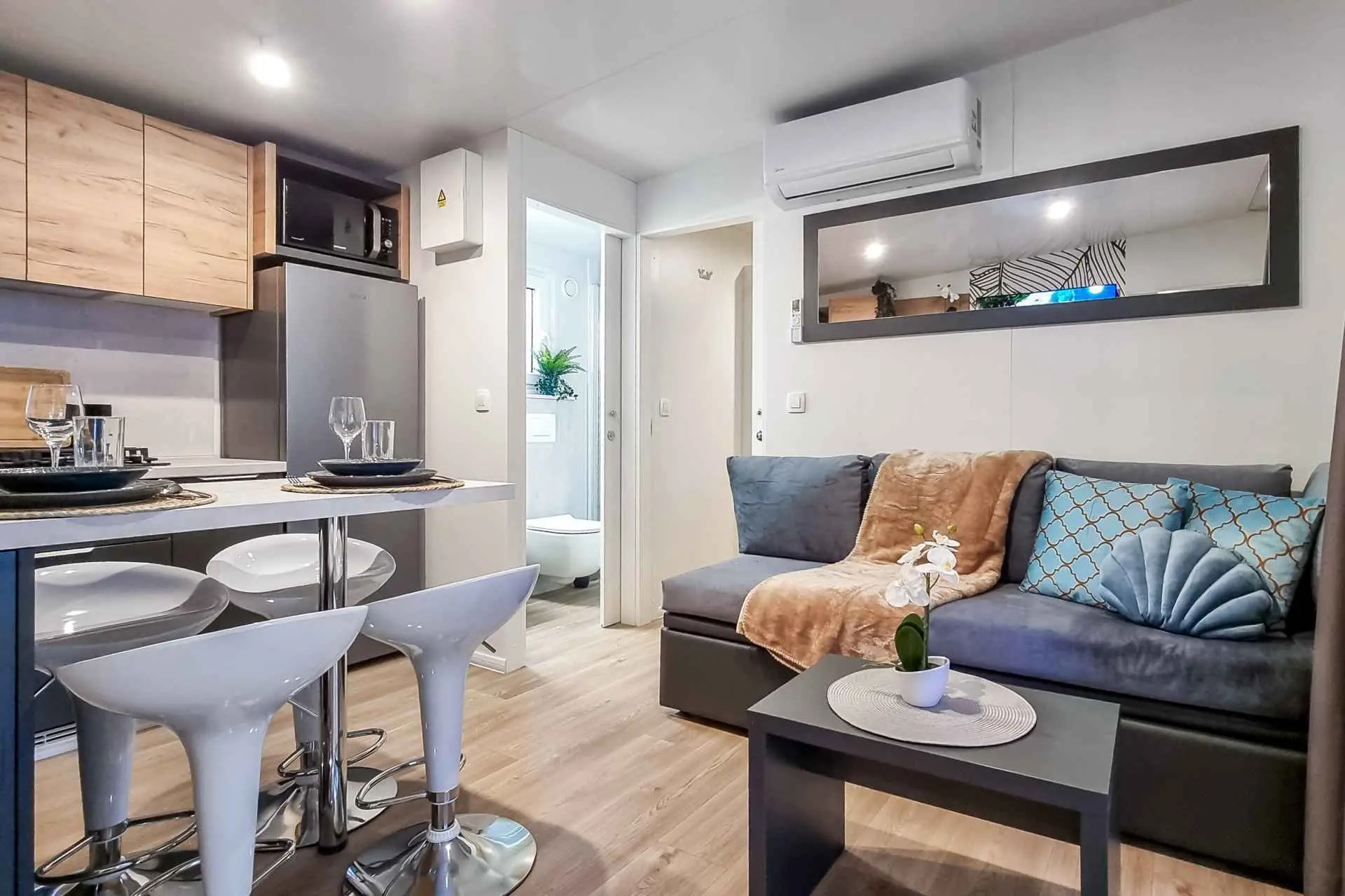 Naša moderno opremljena mobilna kućica nudi udoban smještaj za do 6 osoba, s 2 prostrane spavaće sobe, dnevnim boravkom sa kaučem na razvlačenje i 2 kupaonice. Uživajte na velikoj natkrivenoj terasi opremljenoj prostorom za objedovanje i vanjskim dnevnim boravkom, idealnom za duga noćna druženja. Ovdje možete uživati u pikadu ili se opustiti uz veliki TV, dok roštiljate na našem velikom plinskom roštilju i kuhalu na otvorenom. Natkrivena terasa okružena je borovima i blagim povjetarcem s mora. Sa jedne strane terase nalazi se prostrani prostor za objedovanje opremljen udobnom sofom za sjedenje i još udobnijim foteljama, a s druge strane, naš dnevni boravak vani nudi udobnu garnituru za sjedenje na kojoj možete ne samo odmoriti se, već i uživati u omiljenim TV emisijama na ogromnom TV-u s dostupnim satelitskim TV kanalima, Netflixom i HBO GO-om. Kućica se nalazi 3 minute do prekrasne plaže. ℹ️Velika natktivena terasa sa prostorom za objedovanje i vanjskim dnevnim boravkom sa velikim TV-om i pikadom ℹ️ Veliki plinski roštilj + plinsko kuhalo ℹ️Potpuno opremljena kuhinja (hladnjak, mikrovalna pećnica, plinski štednjak, kuhalo za vodu, aparat za kavu, perilica posuđa, toster, svo potrebno posuđe) ℹ️Dnevni boravak sa velikim TV-om ℹ️Besplatan WI-FI, SAT TV, klima ℹ️Udobna damast posteljina i ručnici ℹ️ Fen, pegla ℹ️ Hranilica za djecu ℹ️1 parkirno mjesto, drugo parkirno mjesto uz doplatu Kampu Pearl Mobile Home nalazi se na samo 3 minute hoda do pješčane i šljunčane plaže te 10 minuta šetnje do centra Biograda. U kampu i njegovoj blizini nalazi se sve što vam je potrebno za opušteni odmor – od trgovina i restorana do sportskih terena i dječjih igrališta. A najveći gušt je upravo uživanje u suncu i moru, kao i mogućnost odlaska na izlete u atraktivne nacionalne parkove poput NP Krka, NP Kornati, NP Paklenica, ili povijesne gradove poput Zadra i Šibenika.