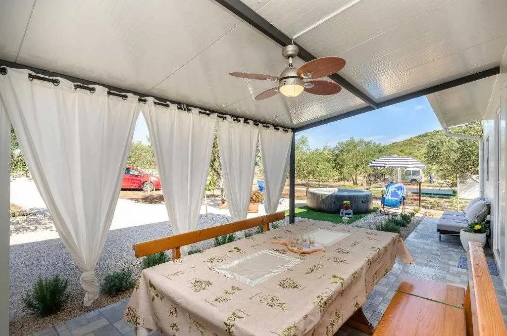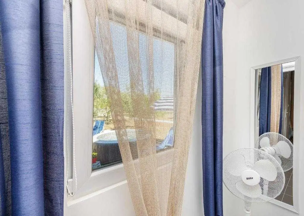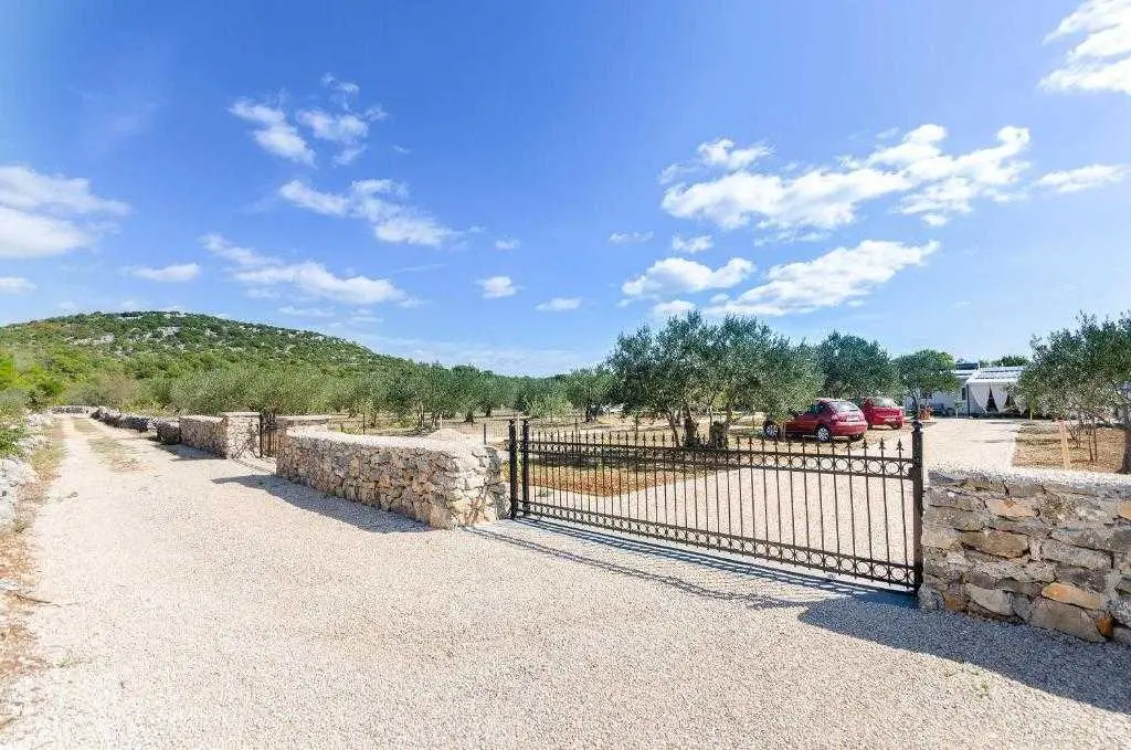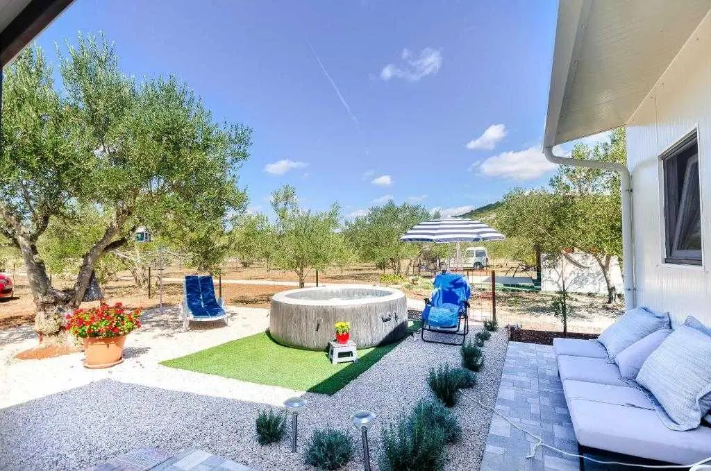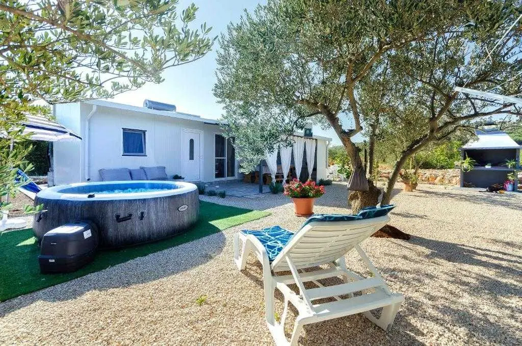 Kućica za odmor na osami Green Oasis Vodice savršena je za odmor u prirodi te nalazi se svega 7 km od plaža i zbivanja u Vodicama, na području Rakitnice. Površina posjeda je 600m2 okruženih ograđenim maslenikom te se prostire neometani pogled na okolno zelenilo. Ispred kuće se nalazi velika natkrivena terasa (20m2) sa prostranim drvenim stolom i stolicama te vanjskom kuhinjom (štednjak i pećnica na plin). Za pripremu peke, roštilja ili gradela dostupan je veliki kameni roštilj. Toplih ljetnih dana rashlađenje potražite u bazenu sa mjehurićima pored kojeg se nalaze ležaljke i suncobran, a također je dostupan vanjski tuš (grijanje vode na solarno). Kućica (30m2) je nova i izgrađena ove godine - ima dvije spavaće sobe sa bračnim krevetima, unutarnju kupaonicu (tuš + wc) te unutarnji prostor za pripremu hrane (frižider i radna površina, stol i stolice). Električna energija se dobiva pomoću solarnih panela (220V) te pričuvnog generatora – pogodno za osvjetljenje, stropne ventilatore, punjenje mobitela/laptopa i TV. Internet nije dostupan. Voda u kućici je osigurana iz spremnika (zapremnine 3000L), te ju treba koristiti pažljivo. Za piće preporučujemo flaširanu vodu, a vodu za kuhanje treba prvo prokuhati. Parking je besplatan i osiguran na posjedu, a do kućice se dolazi makadamskim putem. Najbliže trgovine (Lidl i Plodine) nalaze se na ulazu u Vodice, udaljene oko 4 km. Za one željne aktivnog turizma, u blizini se nalazi nekoliko biciklističkih staza te prostrane šetnjice. Kućni ljubimci su dobrodošli bez nadoplate! Čekamo Vas u našoj zelenoj oazi, idealnoj za autentični odmor, mir i bijeg od stresa svakodnevnog života.